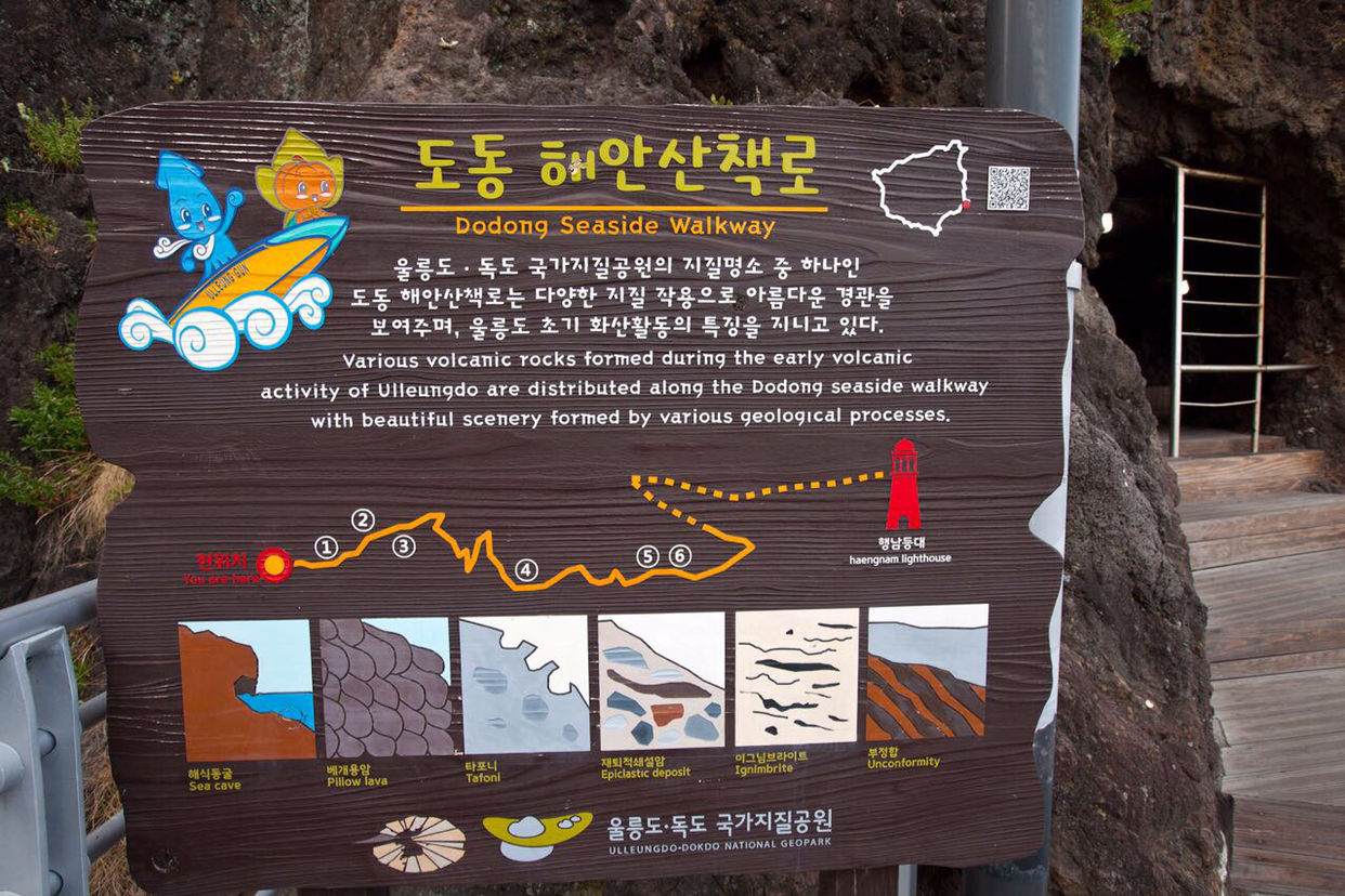 2.도동 해안산책로: 시간이 없는 사람은 여기만 한번 걸어도 울릉도에 갔다 온 기분이 난다. 도동항에서 출발해서 바로 해변가를 따라 조성된 바위 투성이 잔도를 따라 저동 행남등대까지 가는 트레일로 바로 길 밑에서 바닷물이 찰싹거리고 깊고 시퍼런 물속에서 자라는 해초류를 볼 수 있다. 보통 편도 3시간정도 걸린다고 하는데 실제 걸어보이 더 걸린다. 우직하게 왕복으로 걷지말고 돌아 올 때는 버스나 택시타고 돌아오면 쪼매 수월하다. 트레일 길이 평지가 아니고 길이 계단으로 오르락 내리락하고 경사가 심하니까 무릎이 불편한 노친네들은 절대로 가면 안된다.