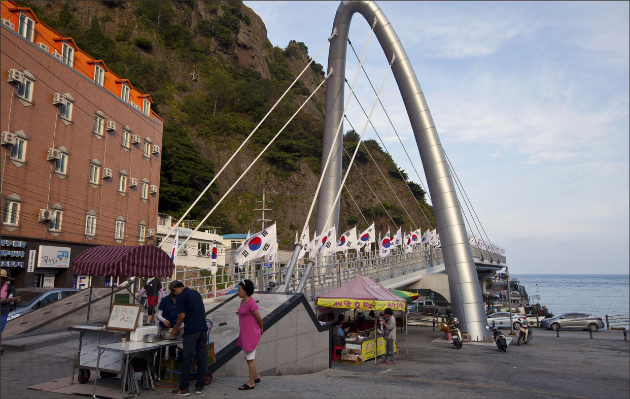 도동 산책로 출발점으로 태극기 깃발이 펄럭이는 곳이 해변 산책로로 이어지는 길이다. 오른편에 도동 어항이 자리잡고 있어 사람들이 북적이는 곳이다.