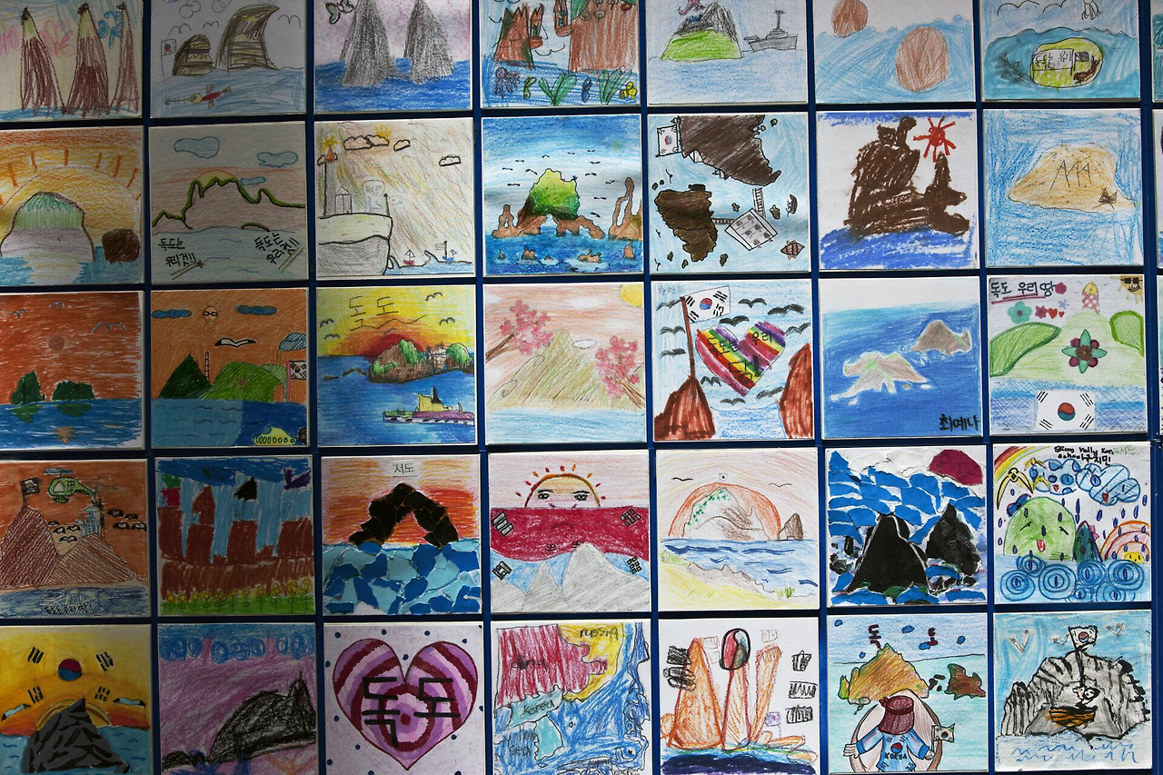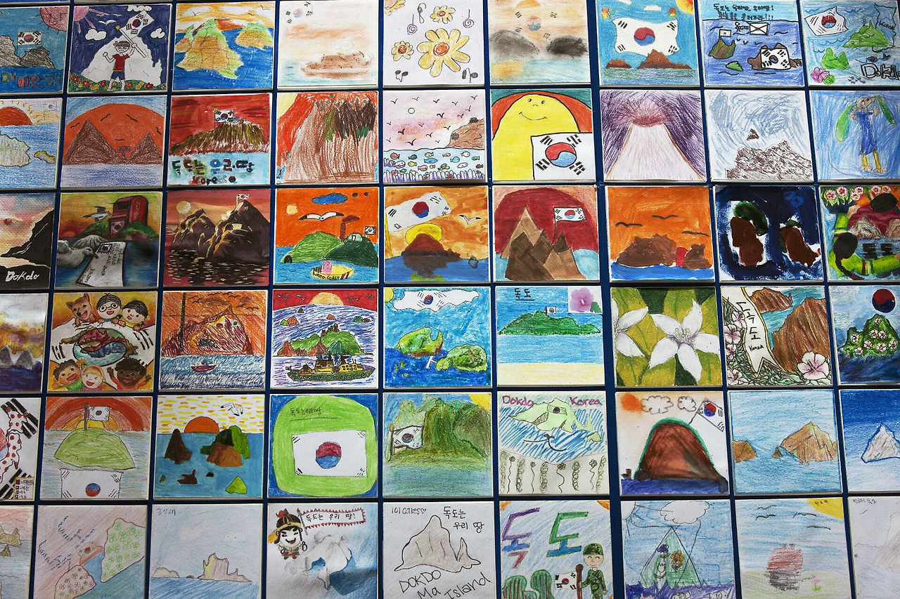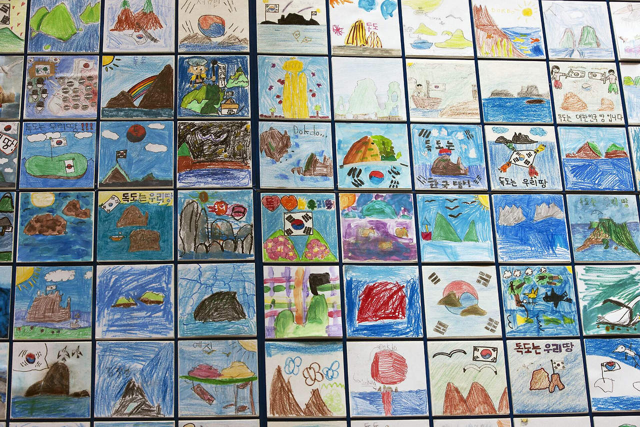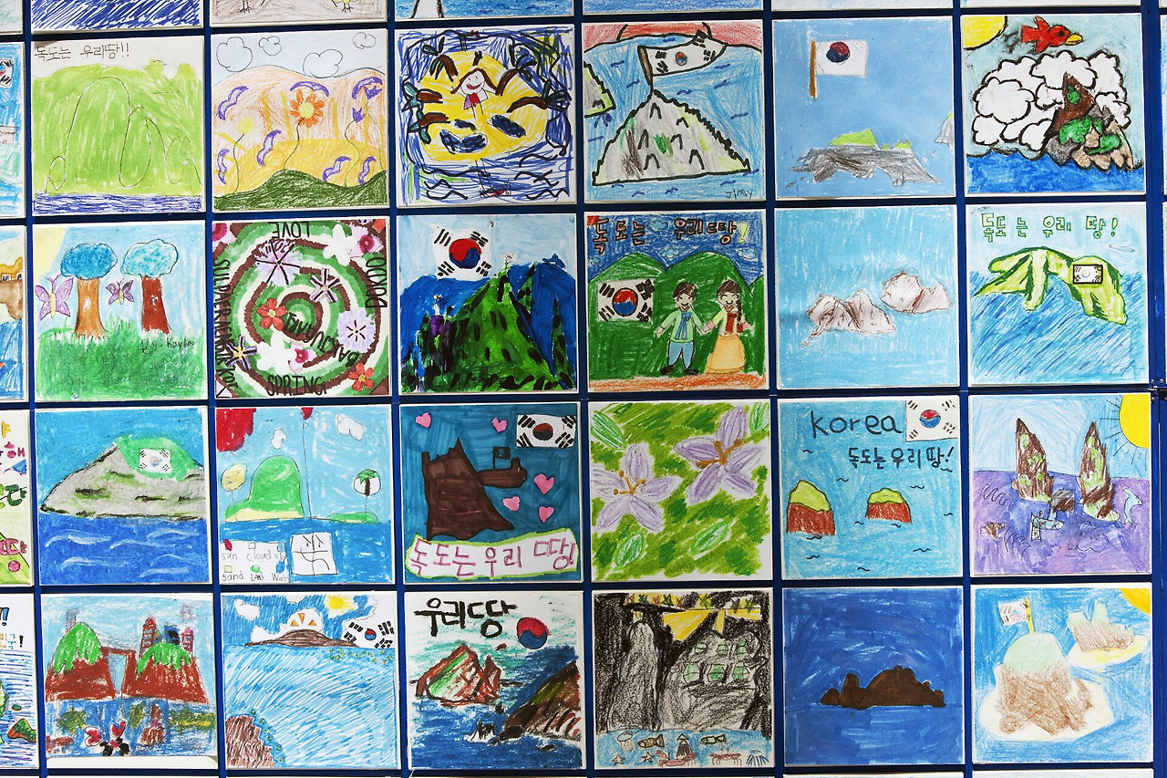 1층으로 들어가면 정면 벽면에 타일로 구운 그림들이 가득차 있다. "I LOVE DOKDO" 란 제목으로 18세 이하 재미교포 학생들을 대상으로 2012년 공모한 작품중 수상 작품을 모아 타일로 구워 벽면에 장식한 것이다. 개발새발 그린 것부터 제법 그림답게 반뜻하게 정성을 들여 완성된 작품도 있다. 그들의 하나같은 통일된 구호는 "독도는 우리땅"이다. 고사리 손들도 하나같이 그렇게 외치고 있는데 노오란 다깡 (단무지)들이 아직도 갓난 알라(애기)처럼 칭얼대고 있으니 이 일을 우찌해야 좋을련지.