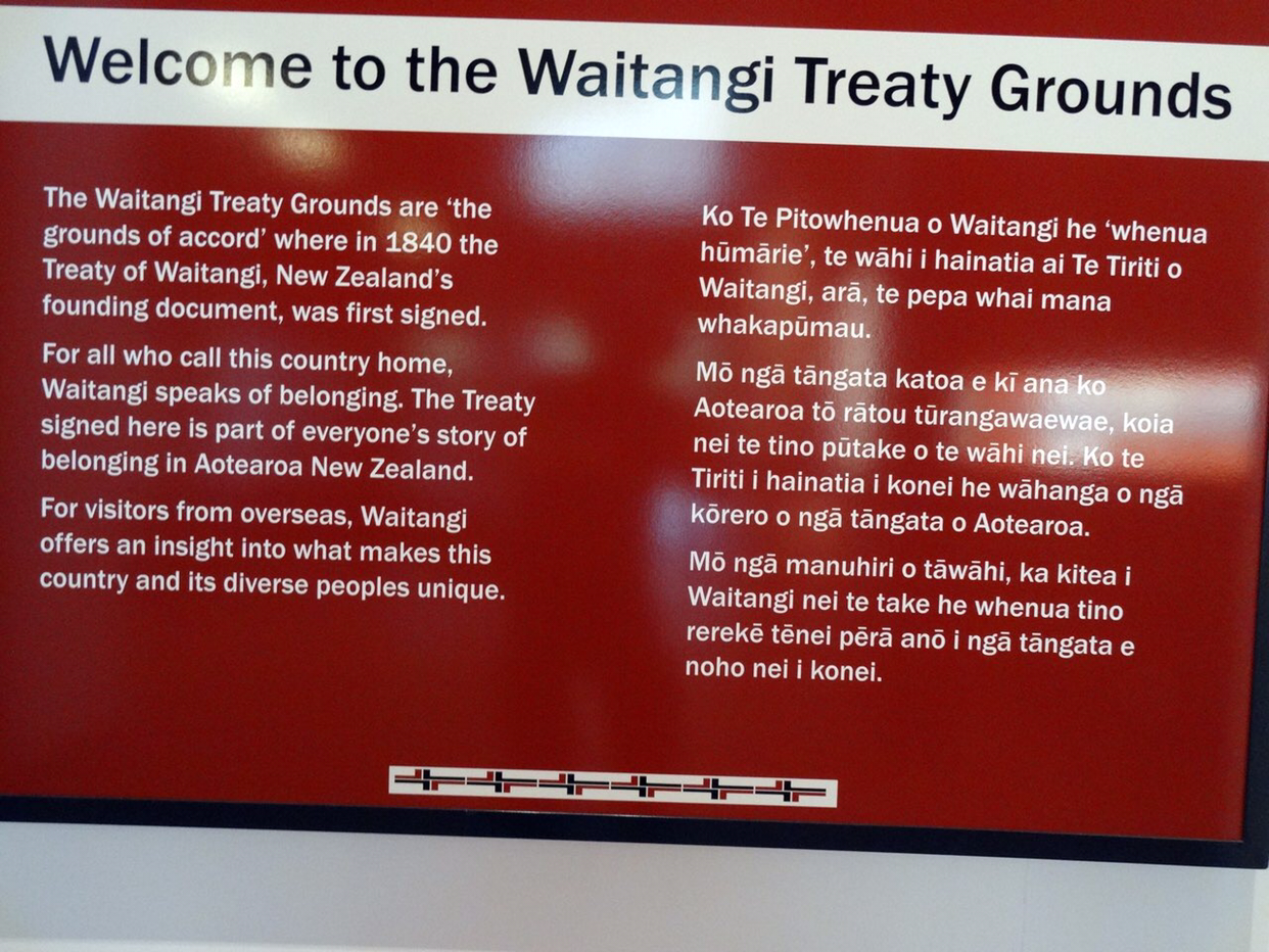 기념관 내부에 와이탕기 조약의 취지에 대하여 영어와 마오리족 언어로 쓰여있다. 중간에 보면 AOTEAROA란 단어가 나오는데 이게 원주민 마오리어로 “하얗고 긴 구름의 나라” 라는 뜻으로 마오리족들은 그들의 땅을 그렇게 불렀다. NEW ZEALAND는 쿡 선장이 영국식으로 붙인 이름이다. 이렇게 본디 있었던 고유명을 거부하고 발견자나 식민지로 삼은 침략자들의 자의로 붙여진 이름들이 많다.