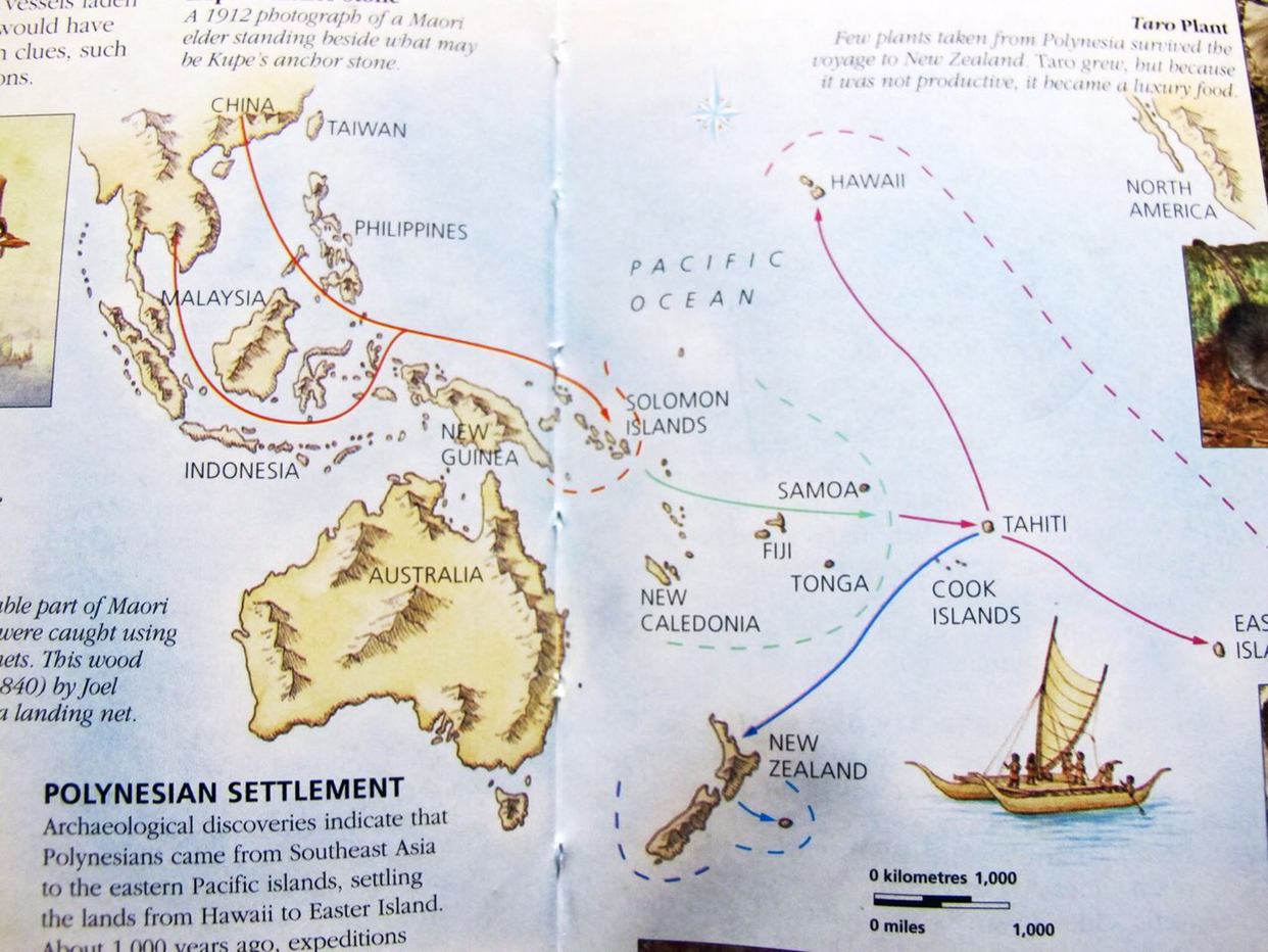 뉴질랜드의 원주민인 마오리족에 대한 기원을 이 그림 한 장으로 한여름 더운 날에 찬 수박 한덩어리로 더위를 녹히듯 시원하게 알아 볼 수 있다. 신기하게도 그 기원이 중국이나 말레이시아에서 솔로몬제도로 퍼져 나갔는데 이 시기를 대략 3만년전쯤으로 본다. 솔로몬제도에서 사모아, 피지, 통가등으로 옮겨 간 시기를 대략 3천년전쯤으로 보고, 그곳에서 타히티나 하와이, 칠레의 이스트섬으로 옮겨간 시기가 대략 1500에서 2000년전으로 추정하고 타히티나 쿡제도에서 뉴질랜드로 건너갔다고 추정되는 시기가 약 천년전이다. 마오리족이 이동하면서 희안하게도 가까운 호주 땅으로는 들어 가지는 않았는데 아마 해류 탓도 있을 듯하다. 폴리네시아인이 마오리족의 선조라는 것에는 대부분 학자들이 동의하지만 폴리네시아인의 선조가 중국이나 말레이시아에서 왔다는 것은 매우 흥미있는 추정인 것 같다.