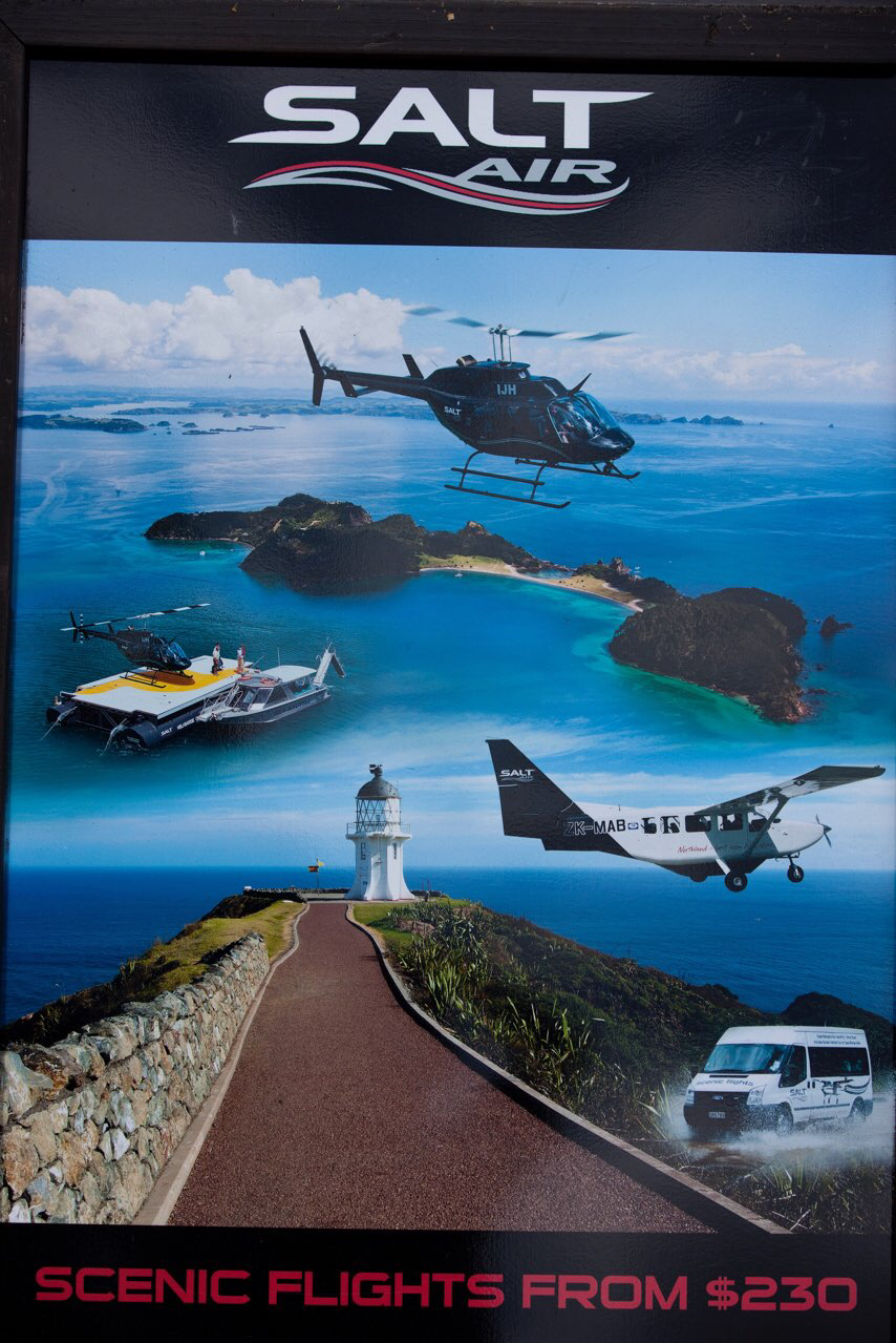 SALT AIR회사의 광고사진 아래 보이는 하얀 등대가 북섬 최북단 CAPE REINGA에 있는 등대다. 관광지로 많은 사람들이 찾는 곳이다. 나도 가고 싶었지만 26일 아침까지 웰링톤으로 내려 가야하기 때문에 더 이상 올라 갈 수가 없다.