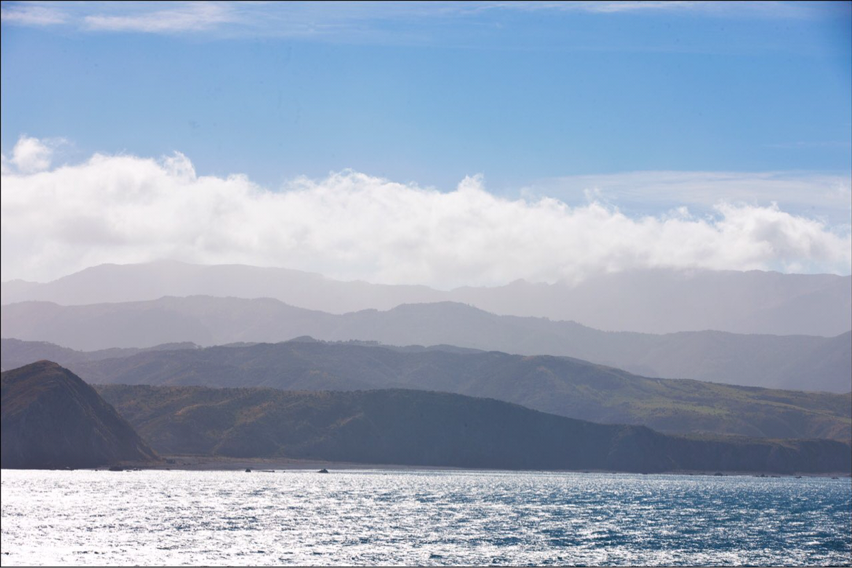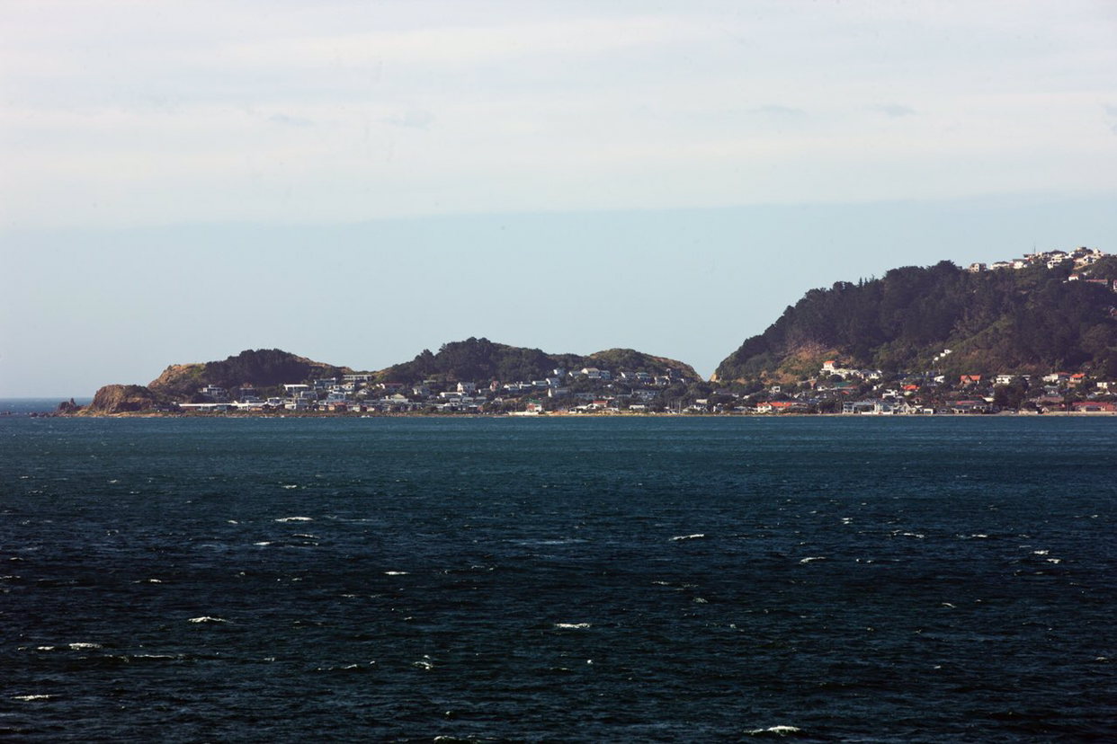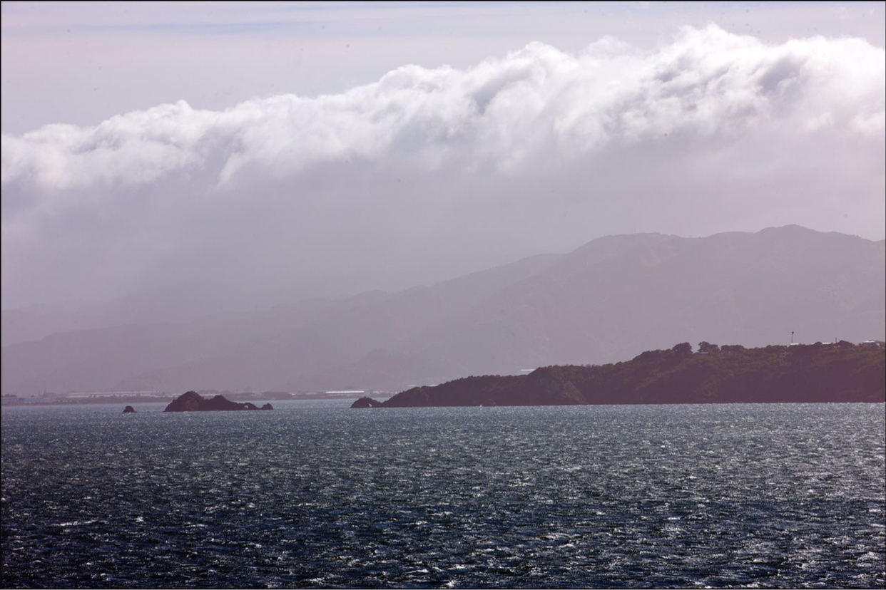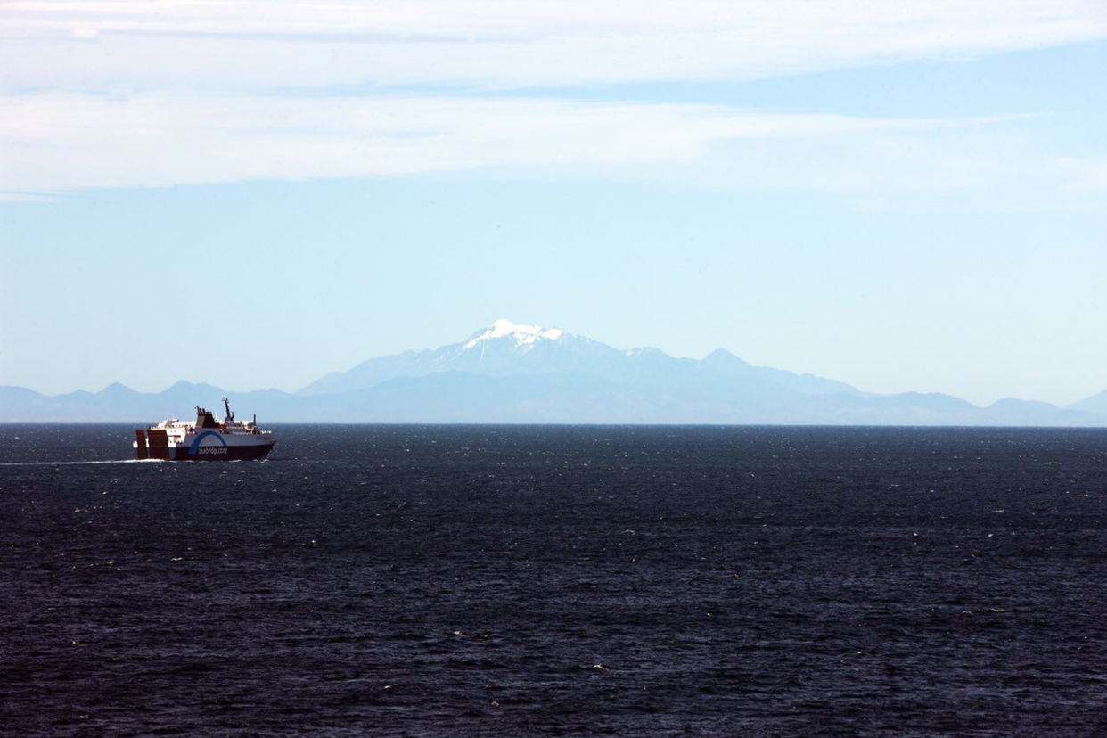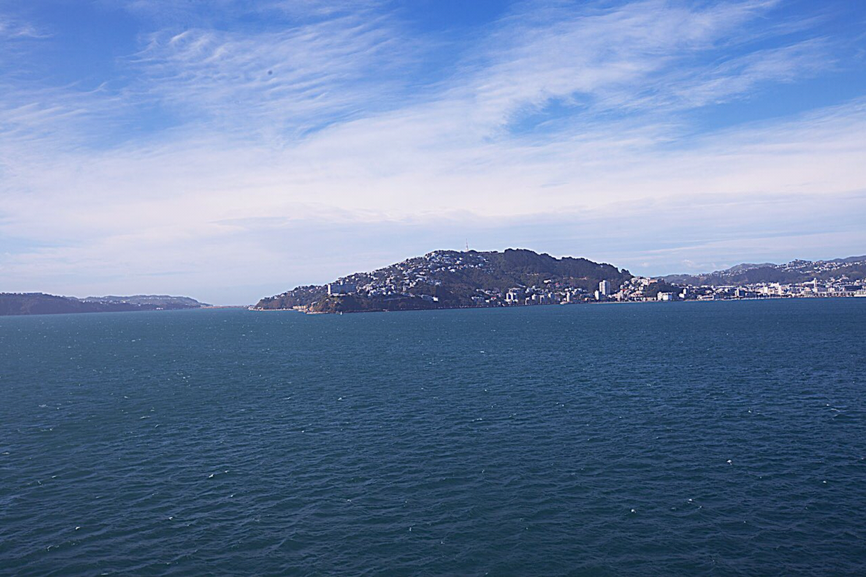 배가 어느정도 웰링톤에서 조금씩 멀어지자 웰링톤을 둘러싸고 있는 작은 산들의 윤곽선이 수묵화의 농담처럼 뚜렷한 선들이 점점 옅어져간다. 배가 남섬으로 진입하는 해로로 들어서자 멀리서 높은 산들이 병풍처럼 서 있는 광경이 눈에 들어온다. 남섬 캔터베리주 오른편 위쪽으로 위치한 만년설로 덮인 카이코우라 산맥이 멀리서 보이는데 그 산맥 아래쪽에 있는 카이코우라라는 마을은 고래 WATCHING으로 유명한 관광지라고 한다. 여름에도 눈을 머리에 이고 있는걸 보니까 만년설이 분명한데 산이 높은 모양이다.
