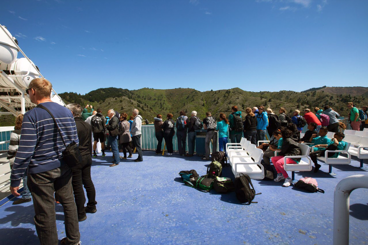 상층 갑판에서 바람을 맞으며 내리 쬐는 햇살아래 세시간동안 버티는 것도 힘든다. 그래서 아래층 로비가 있는 선실로 몇번이나 들락 날락해야만 했다. 배가 남섬의 좁은 해로로 들어서기 시작하면서 배 양편으로 아름다운 경치가 보이기 시작하자 모두들 배 양편 난간으로 모여들기 시작한다. 사진찍기 좋은 자리에 잡고 인증샷 건지기에 모두들 바쁘다.