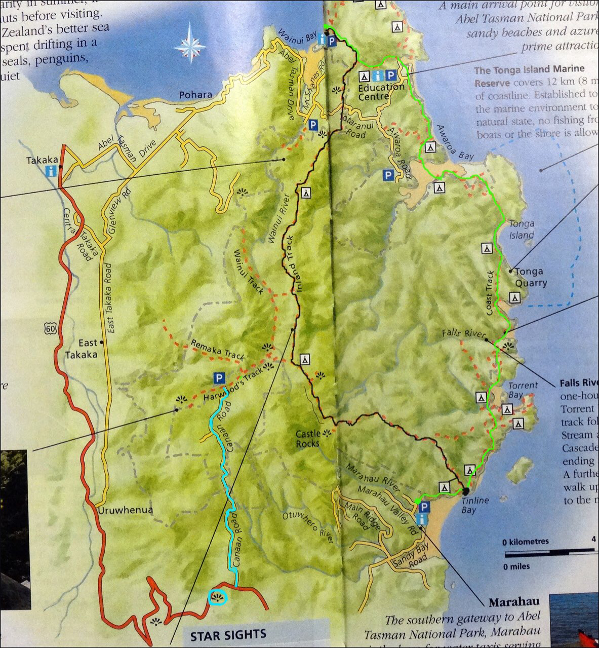 이 국립공원은 뉴질랜드에서 제일 면적이 작은 공원이다. 그러나, 온화한 기후와 금색빛 백사장을 자랑하며 백사장을 둘러싼 울창한 숲으로 많은 사람을 끌어 모은다. 특히 사람들이 많이 찾는 트레킹코스는 COAST TRACK으로 MARAHAU에서 WAINUI BAY까지 해안길을 따라 가는 약 51KM(32 MILE) 짜리이다(녹색선 코스). 이 COAST TRACK코스의 특징은 4군데 하구를 지나는데 썰물 시간을 잘 맞추어야 길을 찾을 수 있다고 한다. 즉, 밀물시간 때는 바닷물이 들어와서 길이 물 속에 잠기기 때문에 길을 찾을 수 없기 때문이다. 여러 코스중에서 제일 긴 트레킹 코스는 3일짜리로 TINLINE BAY에서WAINUI BAY까지 걷는데 해안길이 아니고 중간 산악지대를 통과하는 INLAND TRACK이다(검은색 코스).