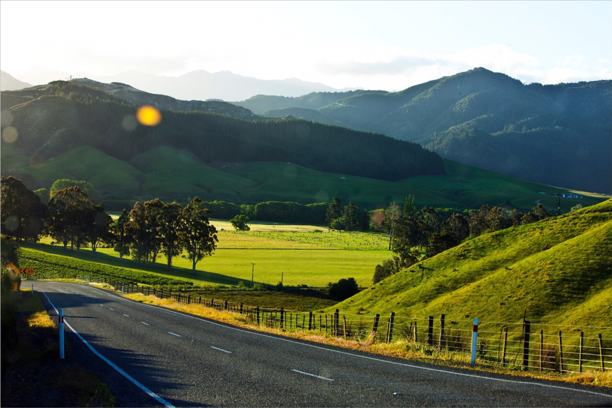 뉴질랜드를 한 장의 사진으로 보여 달라고 하면 나는 이 사진을 주저없이 줄 것 같다. 해는 서산으로 조금씩 기울어 가면 산등성에도 짙은 그림자가 길게 늘어지고 푸른 초지에는 양떼들이 한가롭게 풀을 뜯고 도로변으로 낮게 처진 철조망이 즐비하게 길을 따라 간다. 평화롭고 목가적인 한 폭의 시골 그림이다. 도시를 벗어나서 변두리나 시골로 가도 그림은 위와 크게 다르지 않다. 혹 다를 수 있는 것은 초지에서 풀을 뜯는 동물이 양이 아니고 젖소들일 수 있다. 어디를 가도 푸른 초지가 있어 소나 양을 방목하기에 좋은 환경을 가지고 있어 자연 환경만은 참으로 축복받은 나라라고 할 수 있다. 그래서 많은 사람들이 이민 최적지로 이 나라를 손꼽는 모양이다.(사진을 크게 확대해서 초지에 흩어진 검은 점들이 무엇인지 각자 확인해 보시도록)