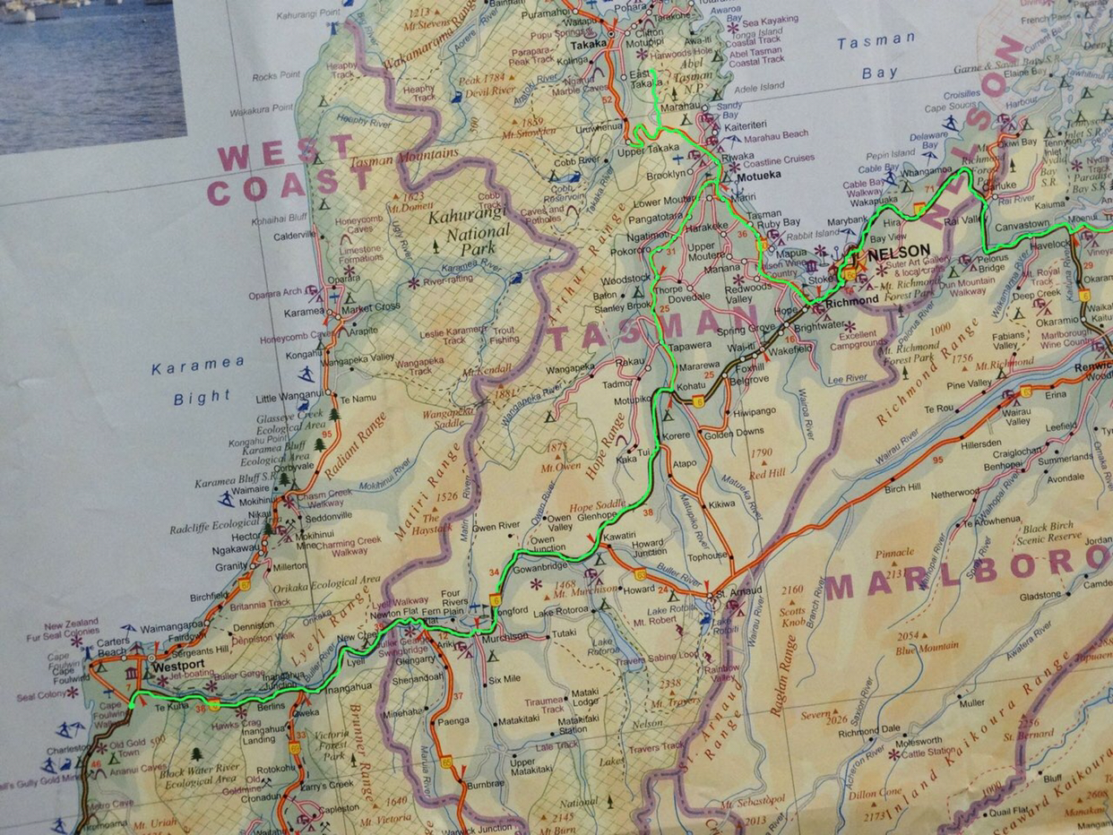오늘 하루종일 달린 길을 그린색으로 표시해 보았다. 무려 4개주를 누비고 다녔다. PICTON의 말보로주, NELSON의 넬슨주, ABEL TASMAN 국립공원이 있는 아벨타즈만주, 그리고 오늘 저녁 모텔에서 하루 자고 갈 WESTPORT의 웨스트코스트주해서 이렇게 남섬 북부를 한 번 돌아 보았다.