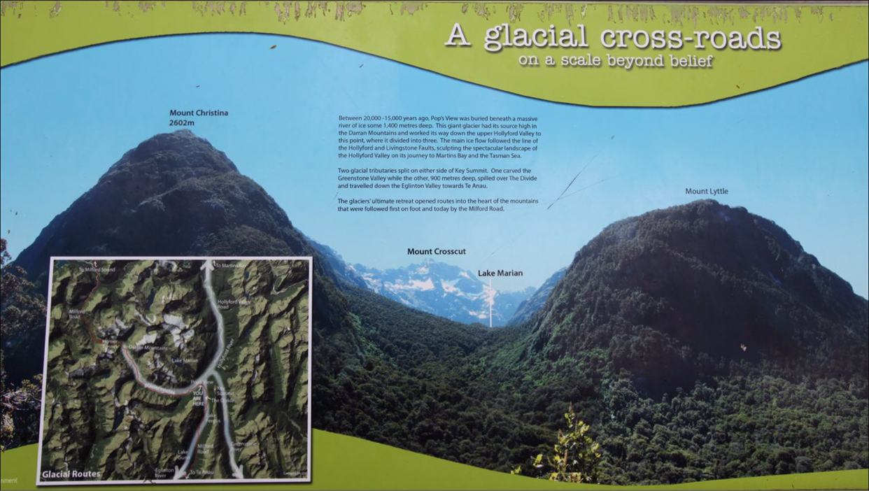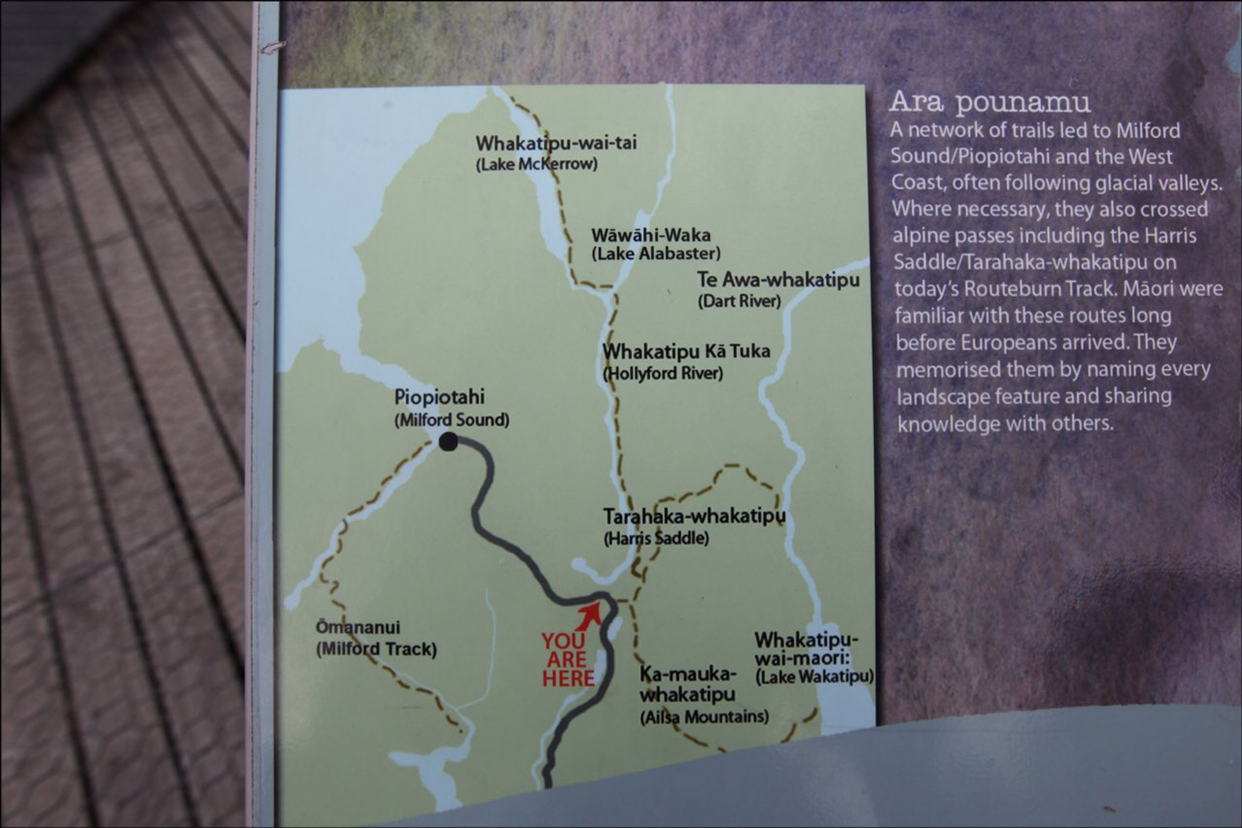 전망대에 있는 다른 안내판에는 밀포드 사운드나 서부 해안으로 통하는 각각의 트레일 코스를 보여준다. 세계 최고의 10대 트레일중의 하나인 밀포드 트랙이 왼편에 보이고 바닷가로 나아가는 다른 트레일도 보여준다. 이처럼 마오리족 원주민들은 유럽인들이 이 땅에 상륙하기 전부터 이런 빙하루트를 통하여 서로 교역하고 루트에 대한 정보를 상호 교환하며 생활해 왔던 것이었다.