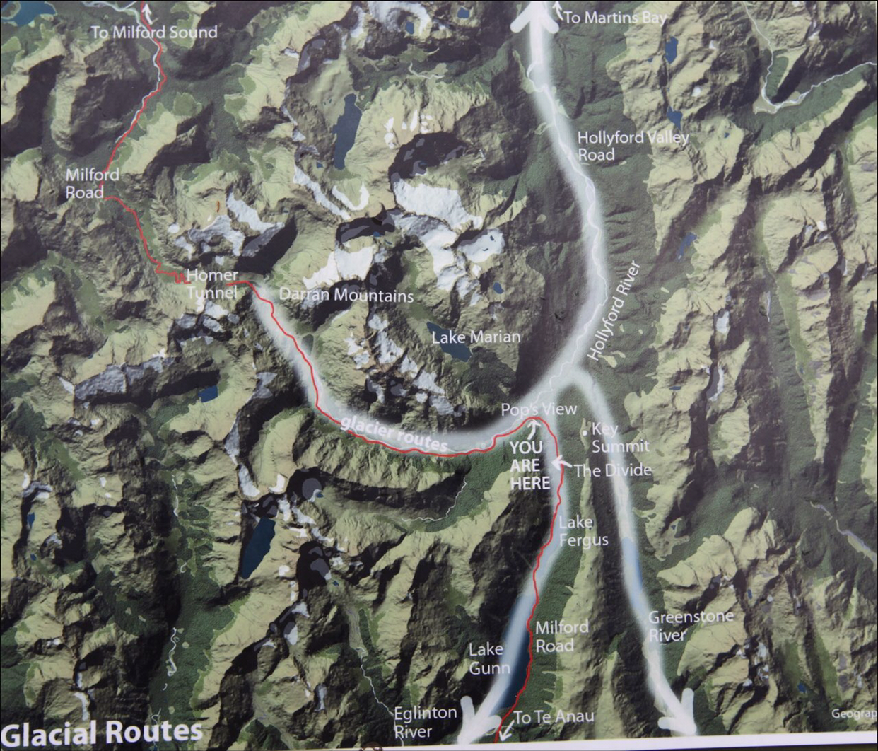 포인트 21번인 Pops View 에서 보여주는 빙하루트이다. 현재의 밀포드로드가 생기기 전까지 원주민 마오리족들그들만이 알고 있었던 빙하루트를 보여주고 있다. 주로 계곡사이에 형성된 빙하사이로 그들만의 트레일을 만들어 왕래 했던 것이다. 지도에서 보듯이 초기 빙하루트가 Homer Tunnel 앞에서 막혀 원주민들도 이쪽으로는 높은 산을 넘을 수 없었다. 그만큼 이 지역은 산이 높아 길을 만들 수 없었던 모양이다. 1954년에 완성된 Homer Tunnel 통해서야 비로소 밀포드로드를 이용해 밀포드 사운드에도달할 수 있었다. 그 전까지는 지금의 밀포드 트랙을 통해서만이 밀포드 사운드로 가는 것이 유일한 육로 통로였다고 한다.