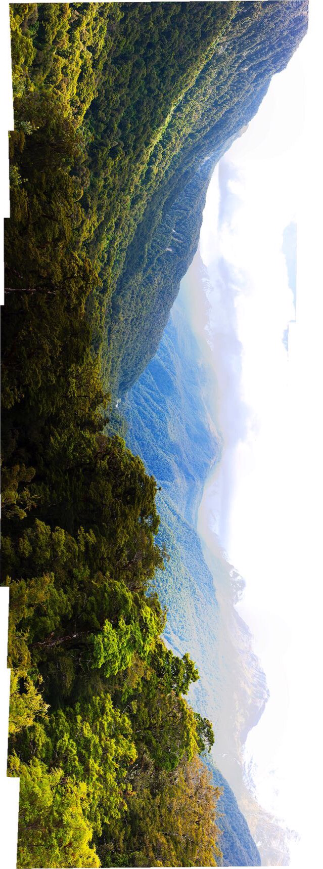 Pops View에 있는 전망대에서 Hollyford Valley를 바라보니 아득하게 멀리 보이고 Wide Angle 렌즈로도 한방에 다 잡을 수 없는 그런 파노라마 경치를 보여준다. 그래서세로찍기 8장으로 웅대한 파노라마 사진을 만들었다. 같은 VIew이지만 느낌이 확연히 틀리게 보인다.
