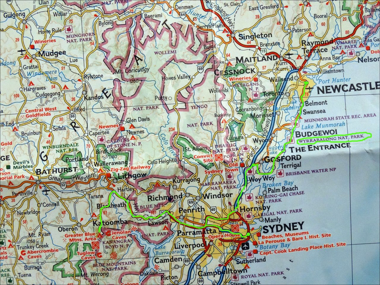 지도를 보여주면……시드니에서 Blue Mountain 국립공원을 찾아 Katoomba까지 갔다가 다시 돌아나오다가 Reptile Park를 공짜로 구경한 뒤 1번 하이웨이를 타고 동해 북쪽으로 길을 달렸다. 하이웨이를 타고 가다보니 바닷가가 안 보이길래 바닷가로 난 로칼길로 들어갔다. 하이웨이에 비해서 엉금엉금 기어가는 수준이다. 그래도 푸르고 싱싱한 바다를 보려고 로칼길을 타고 올라갔다.