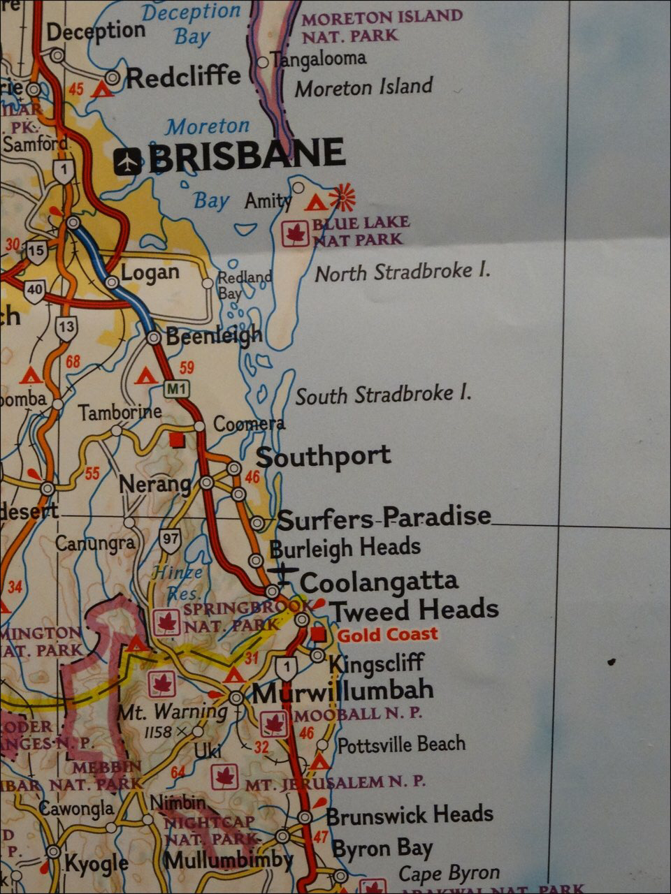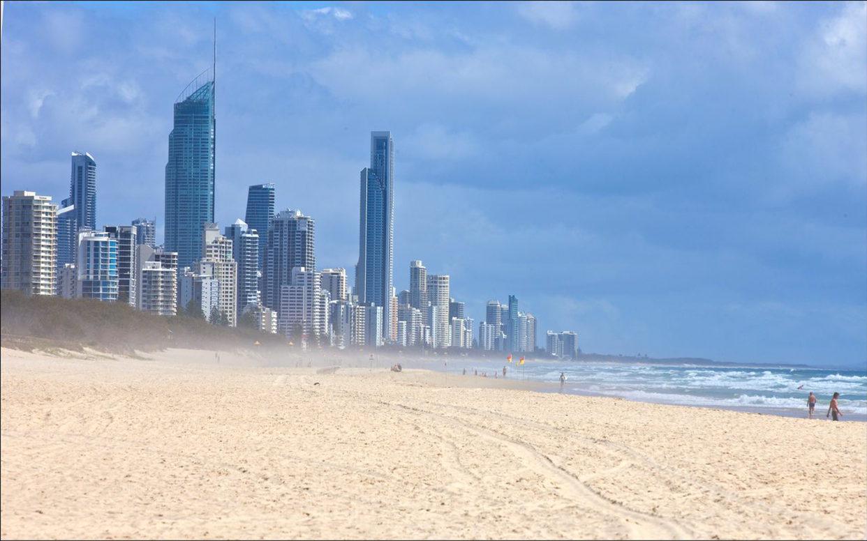 Gold Coast(황금해안)는 두가지 의미가 있다. 지도에서처럼 도시이름이다. 미국으로 치면 LA와 플로리다 올랜드에 있는 디즈니랜드나 디즈니월드다. 돌핀, Sea Lion 펭귄들이 묘기를 보여주는 Sea World가 있고, 영화관련 쇼나 볼거리를 보여주는 Movie World(미국에는 MGM과 유니버샬)에 어린아이들 놀이기구가 있는 Fairground가 있어 내외 관광객을 불러 모으고 있다. 여기에 유명한 카지노도 있어 호주의 라스베가스라 할만 하다. 또 다른 의미의 Gold Coast는 위 지도에 있는 Southport, Surfers Paradise, Burleigh, Heads, Tweed Heads 그리고 Kingscliff까지 포함하는 전체를 말한다. 그리고, 그 중심에 있는 도시가 바로 Surfers Paradise로 이름 그대로 서핑의 천국이라 할 수 있다.