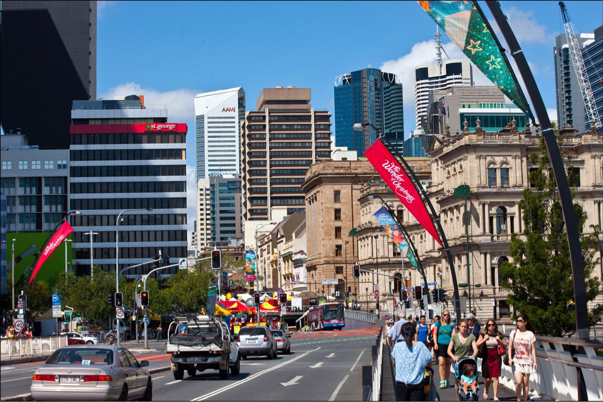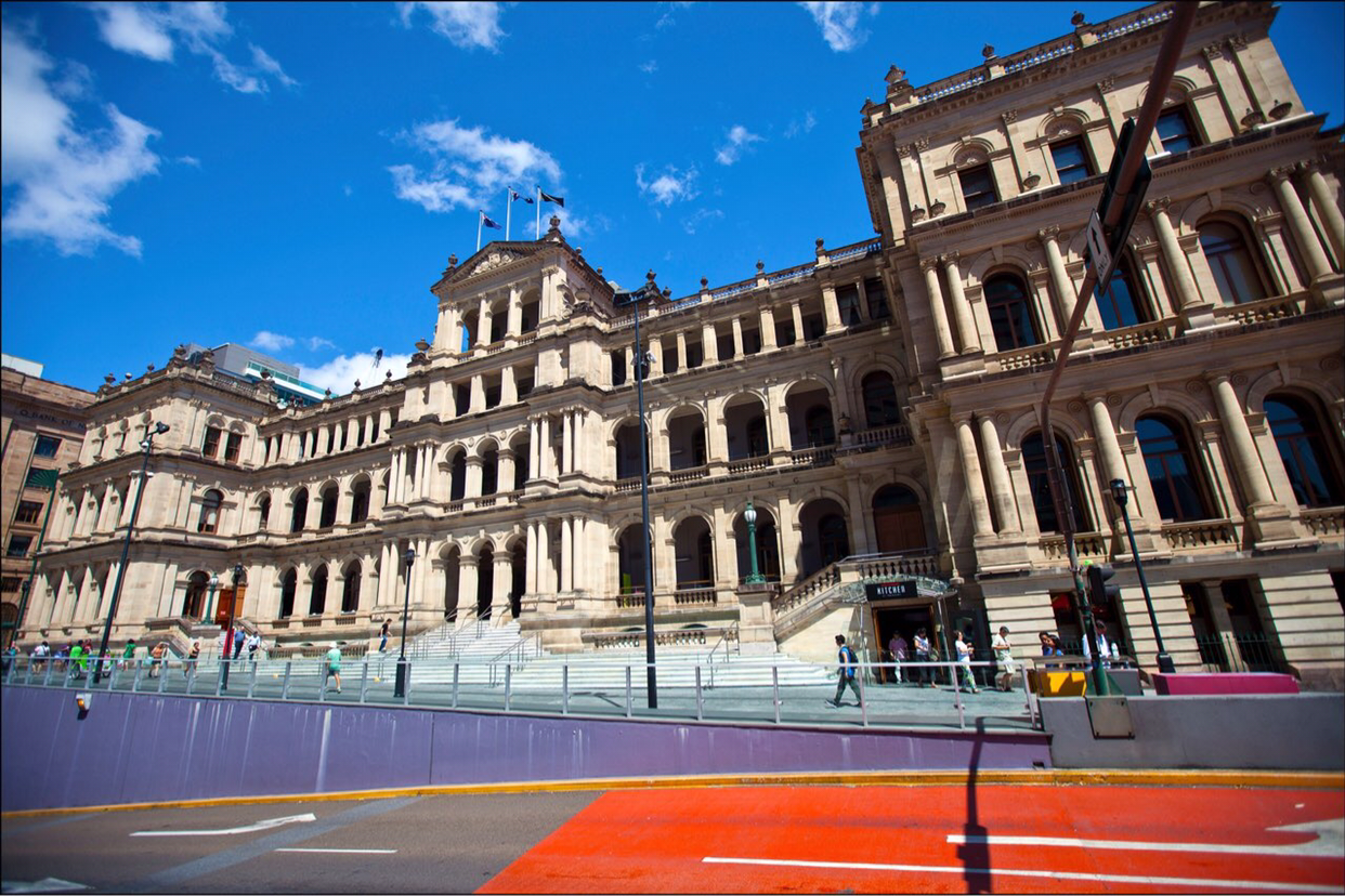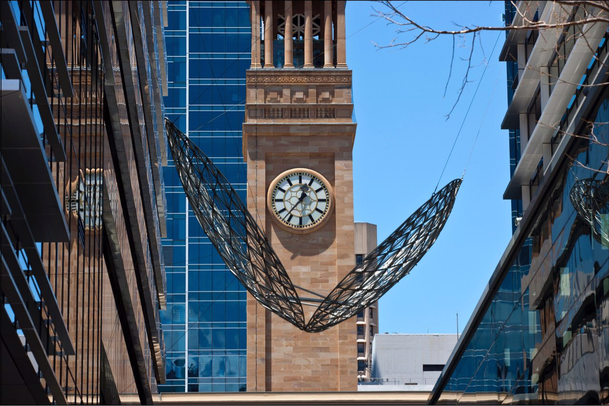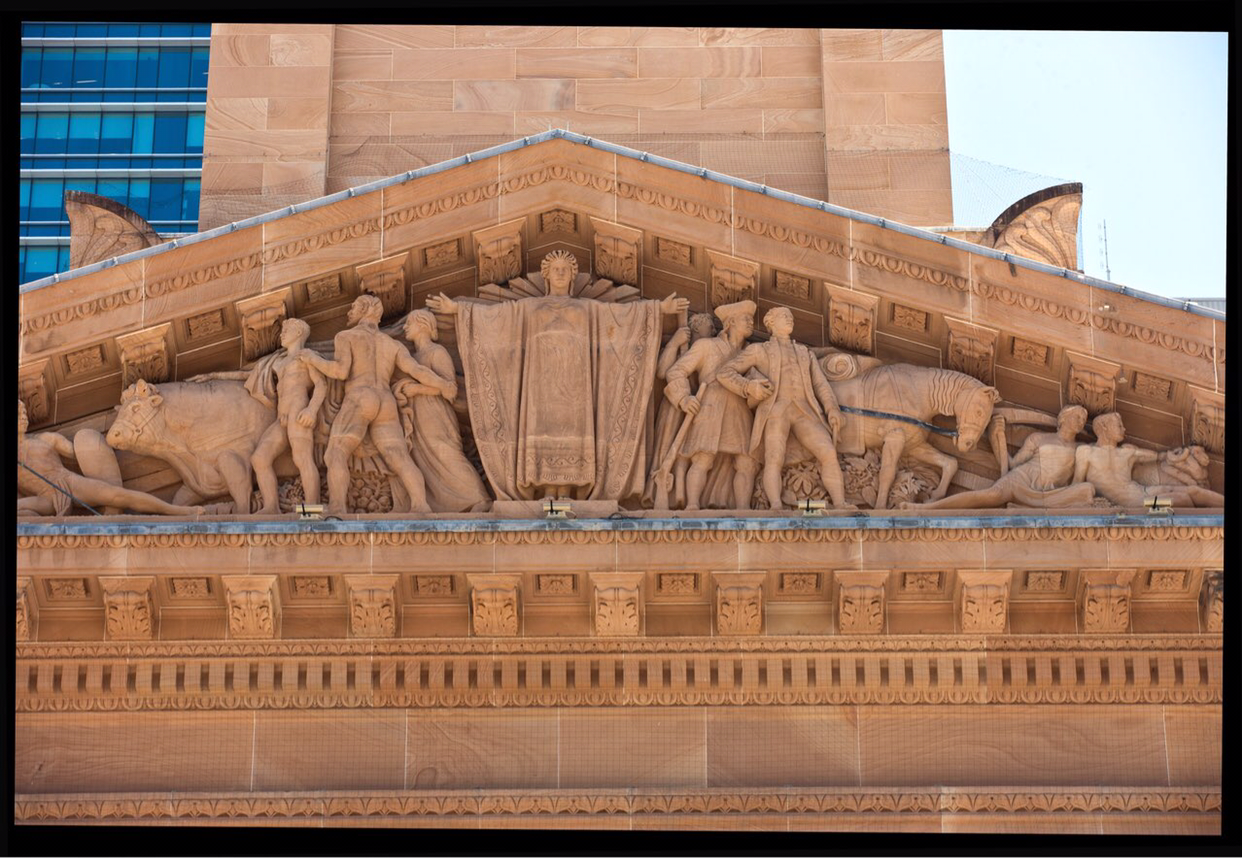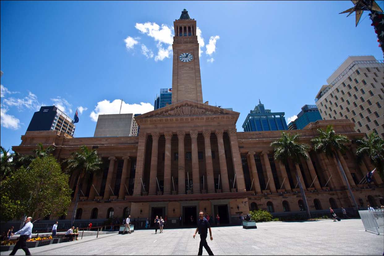 차로 시내로 들어와서 보니 주차할만한 공간이 별로 없어 유료 주차장에 파킹하고 중앙통 거리만 갔다오기로 하였다. 브리즈번강이 도시를 관통하기에 여러 모양의 다리가 군데군데 있다. 1930년에 완성된 Neo-Classical 스타일의 시청 청사는 여러개의 둥근 기둥이 떠 받히는 웅장한 건물로 92미터 높이의 중앙 시계탑은 시내 어디서도 볼 수 있는 명물이다. 시청사 건물 앞면 벽공의 조각도에는 농사짓는 농부부터 신세계를 개척하는 탐험가까지 모든 시민상을 그리고 있어 시민들의 화합을 강조하는 냄새가 물씬난다.