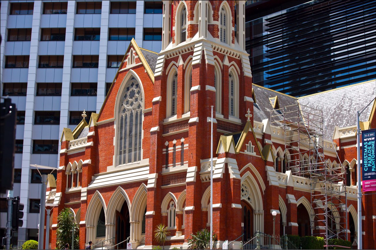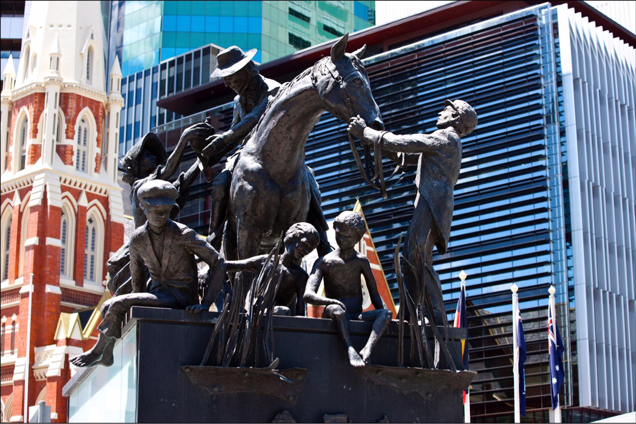시청사 앞 광장 이름이 King George Square로 이 광장에 서 있는 Bronze 동상으로 “Pertie Tableau" 라는 초기 브리즈번 이민 역사에 있어서 탐험가의 정신을 보여주는 작품으로 호주건국 200주년을 기념하여 만든 작품이라고 한다. 먼 탐험의 길 떠날 준비를 하고 있는 것 같다. 엄마 아버지와 큰형은 이주할 준비를 분주히 하고 있는데 어린애들은 마차에 올라 앉아 장난질하기 바쁘다. 시청사가 있는 광장 길건너편에는 빨간벽돌로 아담하게 지은 성당 건물이 있는데 이름은 모르겠다. 한눈에 보아도 눈길을 끌어잡는 조그마한 교회당이다.