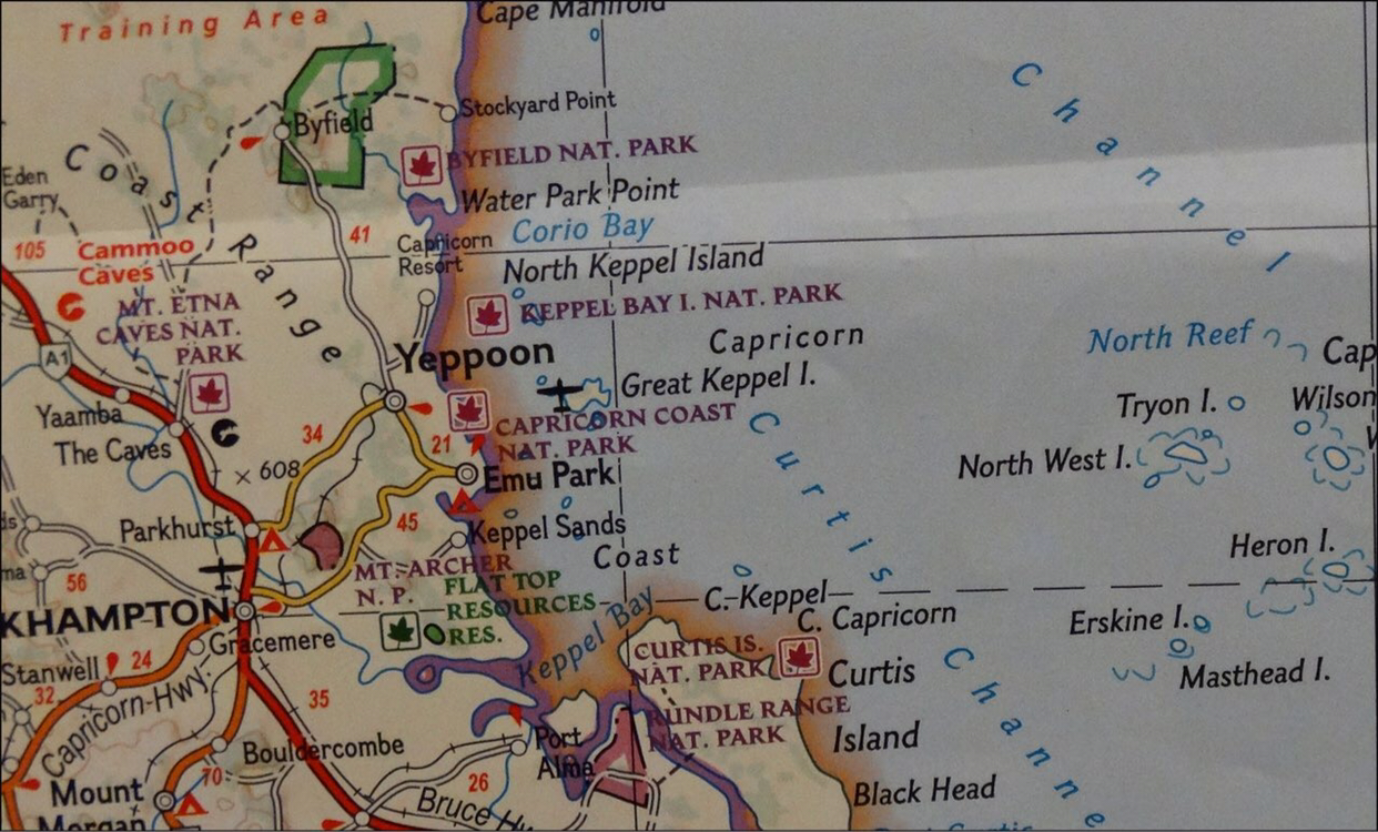 Yeppoon 근처 지도를 조금 크게 확대해서 보여주면 위사진이다. Cappricorn NP와 Keppel Bay NP가 있어 해변 경치가 뛰어나다. Keppel Bay Marina 선창에는 맑고 푸른 하늘아래 각종 보트들이 간지런히 정박되어 있고 바람 한 점없는 하늘에는 하얀 구름 몇 점이 뭉실하게 피어오르고 있었다. 우리가 필요한 Day Cruise 광고판이 있어 혹시 있는가 싶어 찾아보았더니. 없다. 필요하면 개인적으로 배를 Rent하는 Private Rent를 해야 한단다. 또 다른 광고판에는 헬기 투어 프로그램을 선전하고 있는데 60불이면 무지하게 싼 헬기 투어 요금이라 물어보면 대산호초를 구경하는 것이 아니고 근처 경치를 공중에서 한번 돌아 보는 것이라고 한다.