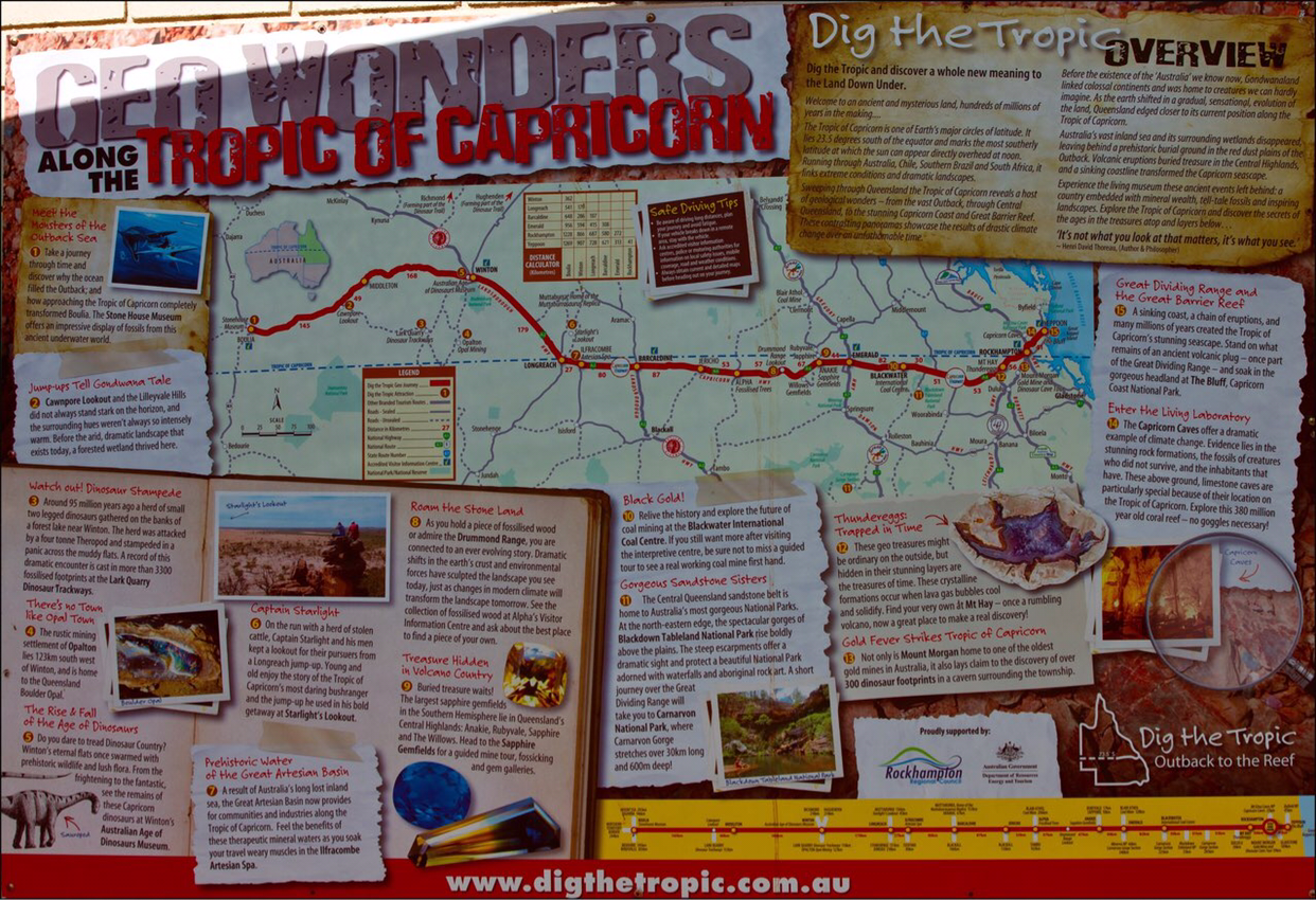 Queensland 주의 남회기선상에 위치한 여러 관광지를 보여주고 있다. 차근차근하게 읽어보니 총 15군데를 소개하고 있다. 박물관부터 95백만년전 공룡 화석을 보여주는 화석터, 오팔 원석을 캐내던 오래된 탄광촌, 미국 서부영화에나 나올 듯한 소도둑을 쫒는 사나이들이 지키는 전망대(Lookout), 지구의 역사를 보여주는 나무 화석(Fossil), 남반구에서 사파이어 매장량이 제일 큰 Volcano 지역, 검은 황금이라고 불리는 석탄에 관한 모든 것을 알려주는 박물관, 호주에서 제일 오래된 금광촌, 380백만년이 된 산호초를 볼 수있는 지하 석회동굴수백만년전에 화산 활동으로 형성된 해안지형을 볼 수 있는 Capricorn 국립공원등 여러가지 흥미로운 볼거리로 관광객을 유혹한다. 그러나, 이런걸 다 제쳐두고 우리의 눈길을 한방에 사로잡는 것은 … 바로 아래 사진의 광고판이다.