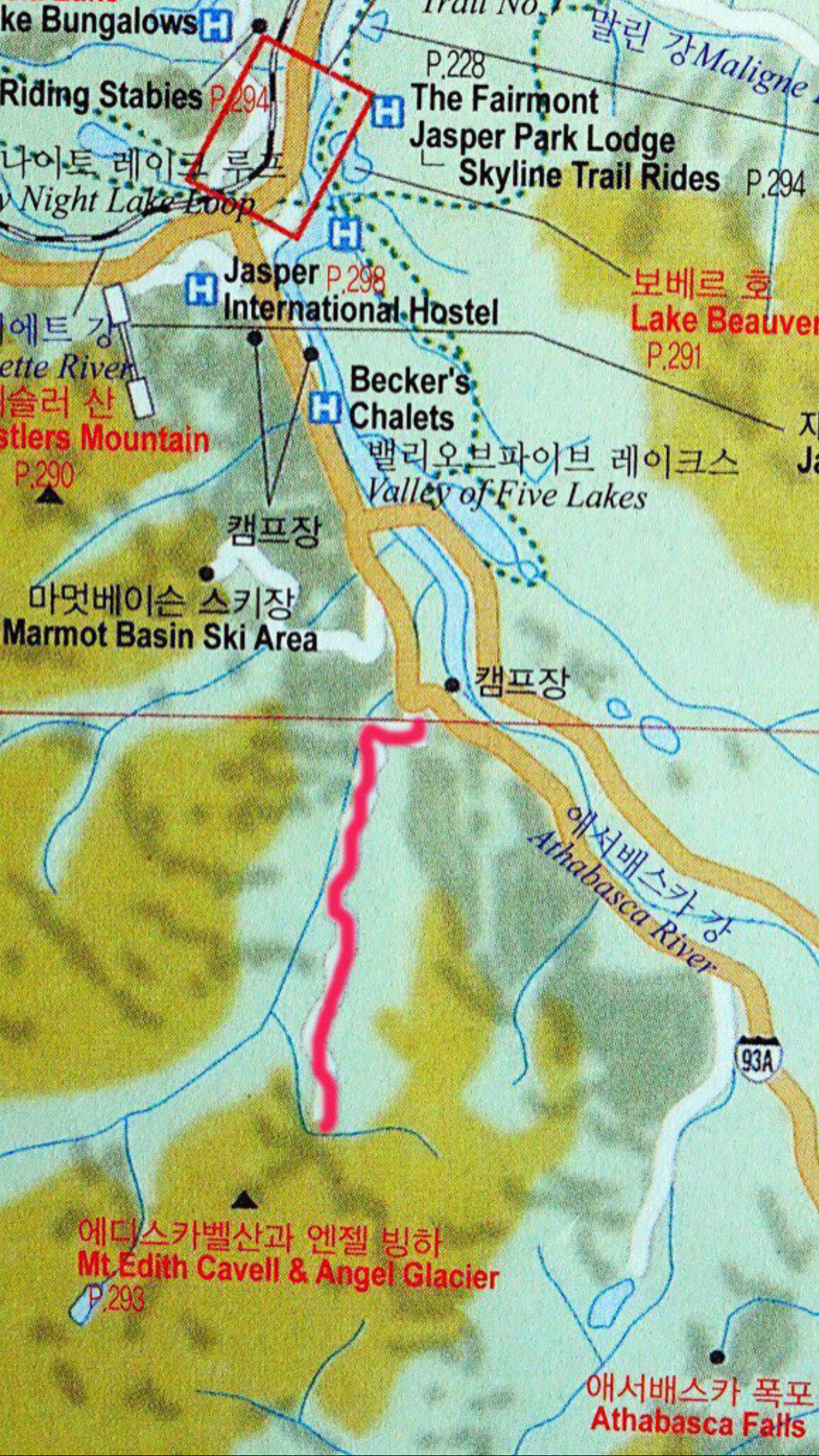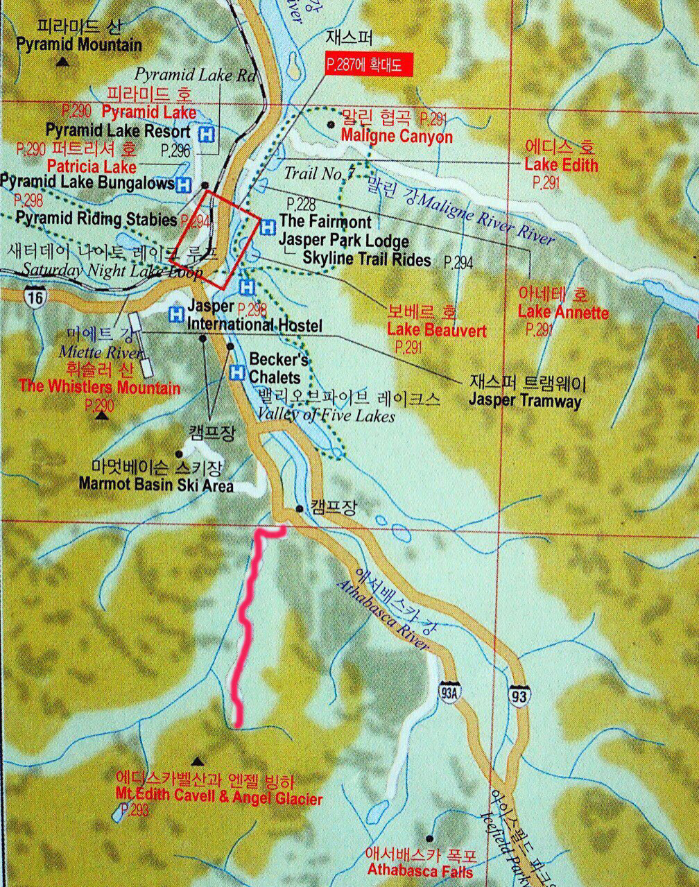 위 사진이 재스퍼국립공원 주변 지도인데 중간에 캠프장에서 빨간선으로 별도로 표시한 곳이 카벨호수로 가는 길이다. 우리는 가지 않아서 보지는 못했지만 여행안내서에 가 볼만 하다고 나와있어 소개하는 것이다. 카벨호수 앞에서 눈덮인 Edith Cavell Mt.과 Angel Glacier를 볼 수 있다고 하니 시간이 되는 사람들은 구경할 만한 곳이라고 생각된다. -JH-