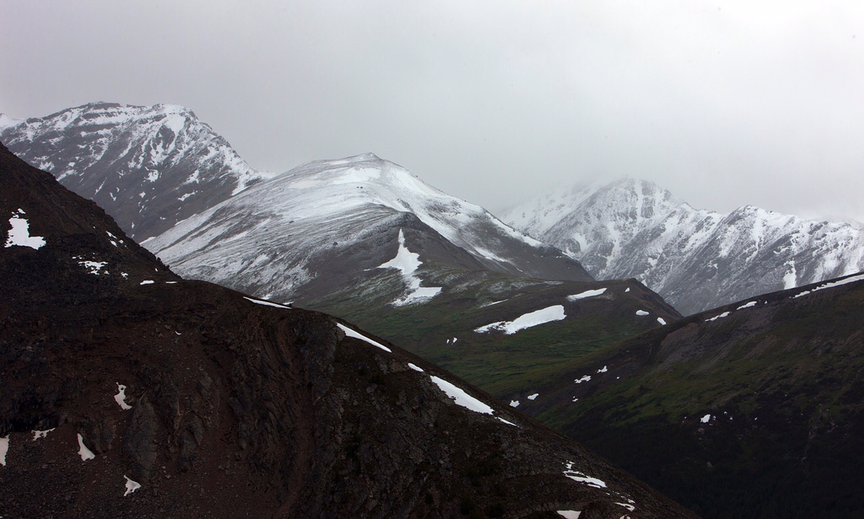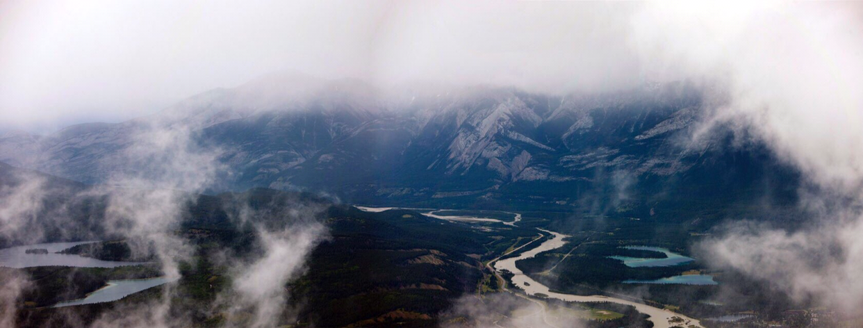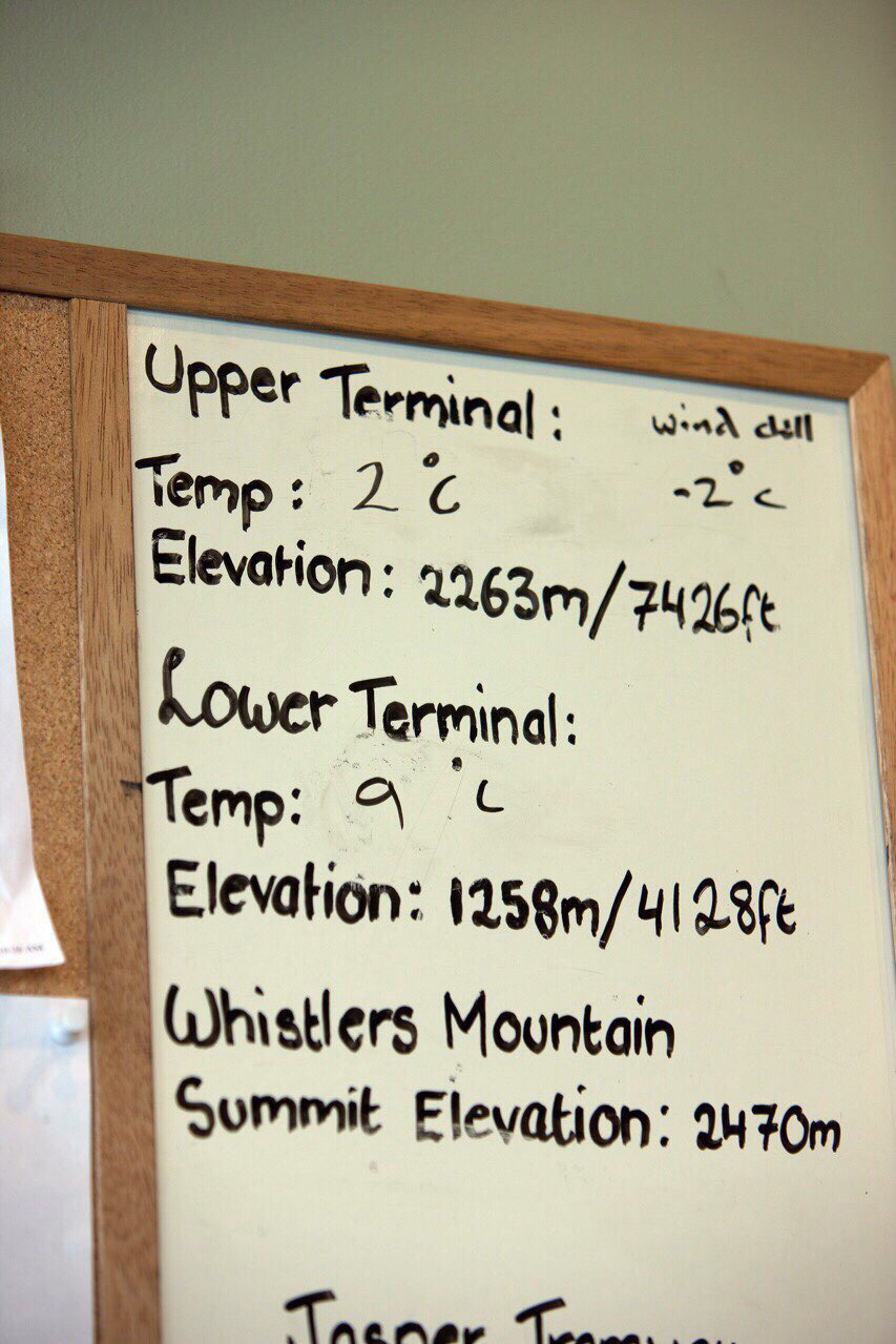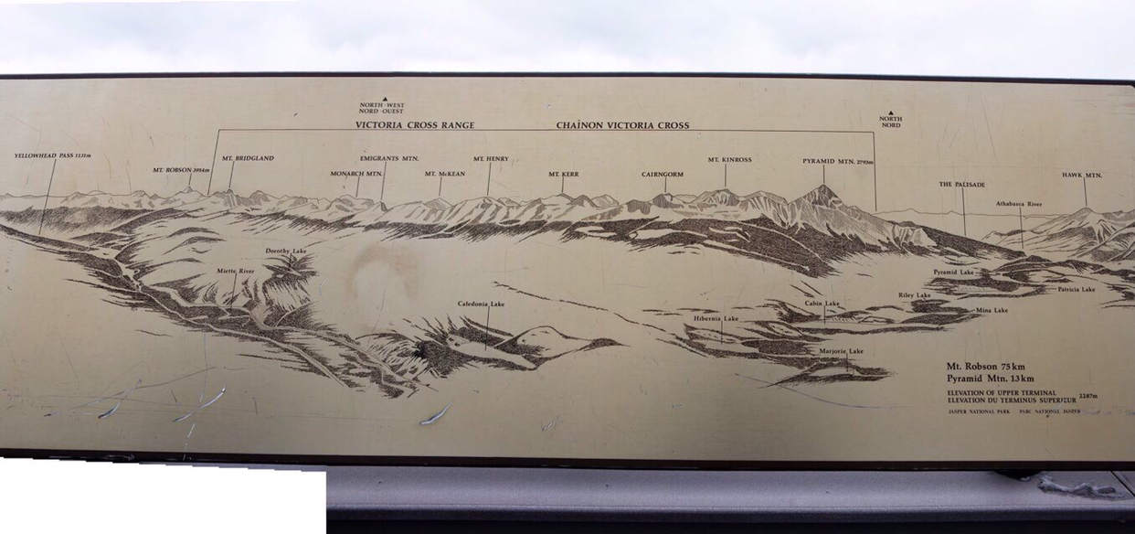 올라가서 게시판을 보니 밑에는 영상 9도이고 위에는 영상 2도이지만 찬바람을 감안하면 영하 2도라 한다. 바깥에 있는 전망대에서 앞산과 뒷산 사진 몇 장 찍었는데 손가락이 얼어 붙는 줄 알았다. 몇 장 찍고나서 잽싸게 전망대 안에 있는 카페에서 손을 녹이고 손가락이 녹아 좀 살만하면 다시 나가서 사진을 찍곤 했다. 날만 좋았으면 주변의 먼 경치를 멋지게 잡을 수도 있었는데 참으로 아쉬운 비오는 궂은 날씨였다. 입간판이 전망대에 있어 날씨만 맑았으면 산이름까지 알 수 있는 산사진을 충분히 찍을 수 있었는데 운이 없게도 주위 산들이 전부 구름에 묻혀버렸다. 어찌보면 재스퍼 국립공원의 백미가 맑은 날에 휘슬러산에 올라가서 사방천지를 둘러 보는 것 일련지도 모르겠다. 그래서 날씨를 보고 여기 올라오는 것을 결정해야 할 것 같다.