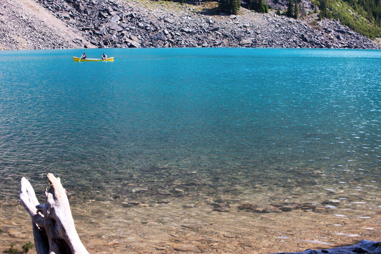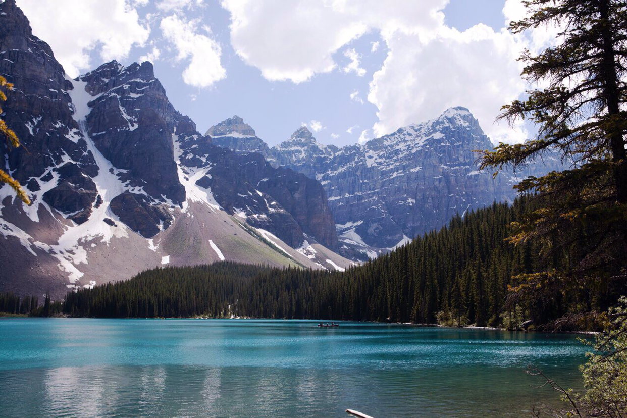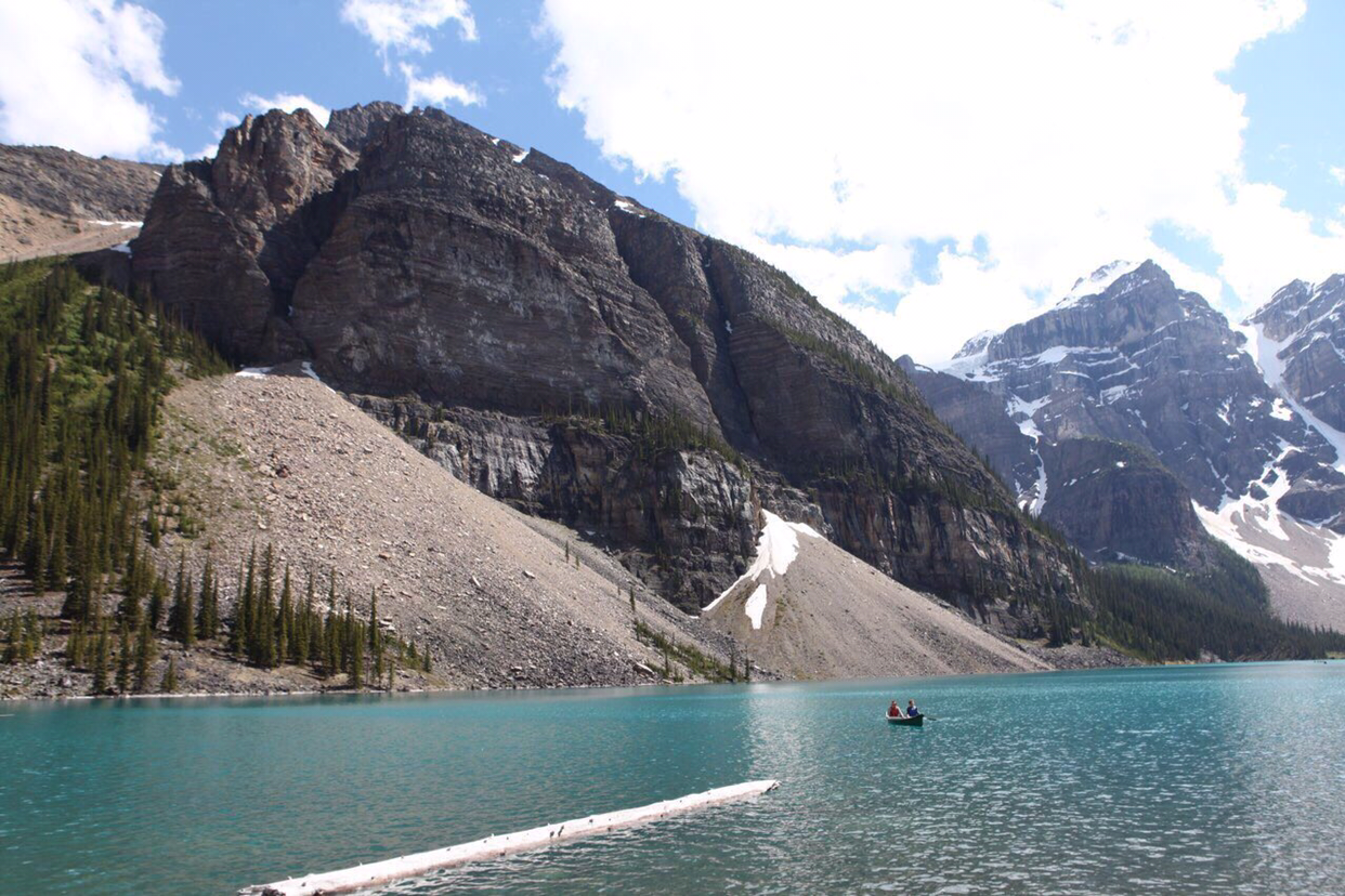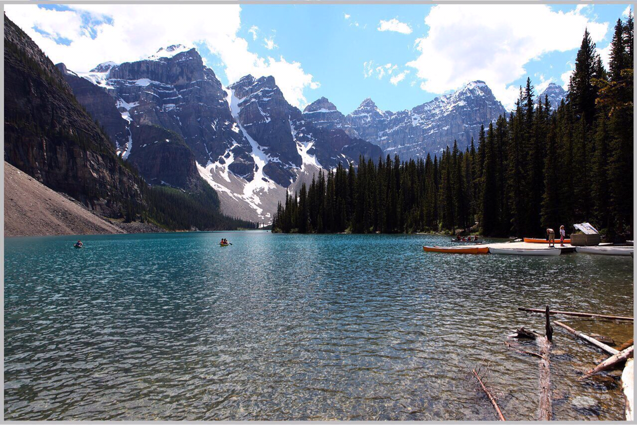 모레인 호수의 경치가 루이스 호수의 그것보다 뛰어나다고 하는 이유가 바로 모레인 호수를 둘러싸고 있는 Ten Peaks의 그림이 파노라마처럼 펼쳐지기 때문이다. 그에 비해 루이스 호수는 높은 빅토리아산에서 흘러내려오는 빅토리아 빙하와 양쪽으로 서 있는 울창한 침엽수가 정적인 아름다움을 선사하기 때문에 이름값을 하는 것 같다. 모레인 호수를 보기위해 길을 따라 가면 점점 산골짝으로 들어가는 형세가 되는데 산으로 커브길을 돌면 갑자기 앞에서 여러 개의 높은 봉우리들이 녹지 않은 빙하를 머리에 얹고 연이어 나래비(줄)를 서듯이 삥 둘러가며 위엄을 보인다. 좀 더 안쪽으로 들어가면 모레인 호수가 열개 봉우리의 그림자 아래 에메랄드 물빛을 띄우고 펼쳐진다. 여기도 루이스 호수처럼 보트를 대여해서 즐길 수 있는데 많은 사람들이 카약을 차에 싣고 와서 호수에서 타고 있다.