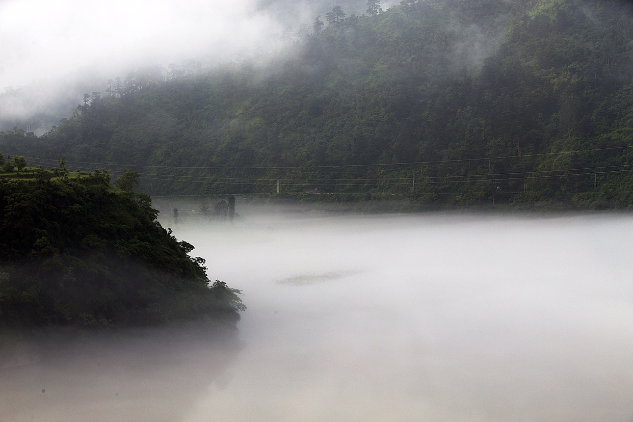 해가 지고 어둠이 내린 뒤 버스가 달릴 적에는 몰랐는데 새벽에 눈을 뜨고 창밖을 바라보니 중국풍 특유의 산수화가 가득하였다. 높은 산의 계곡에는 마치 게을려서 미쳐 빠져 나가지 못한 이른 아침의 안개구름이 걸려있고, 흘러 내리는 강가를 따라 올라가다 물안개에 뒤덮인 강가 마을의 풍경을 마주할 수 있었다. 차가 달리는 동안에 흔들려서 사진을 찍는 것이 쉽지 않았지만 그래도 열심히 찍어서 몇 장 건졌는데 별로 마음에 차지는 않는다.