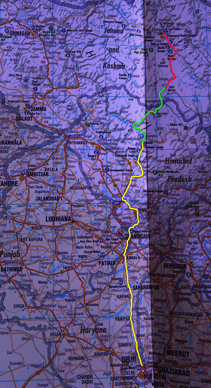 노란선이 뉴델리에서 휴양지 Manali로 이동한 여정이고 녹색선이 마날리에서 사추(Sarchu)라는 고산지대로 들어간 여정이고 빨간선이 이번 배낭여행에서 제일 힘들었던 5328m 탕그랑고개를 넘어 북인도와 중국 티벳 국경선 가까이 있는 라닥지방의 중심지 Leh라는 마을로 이동한 경로이다.