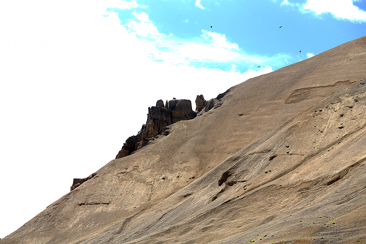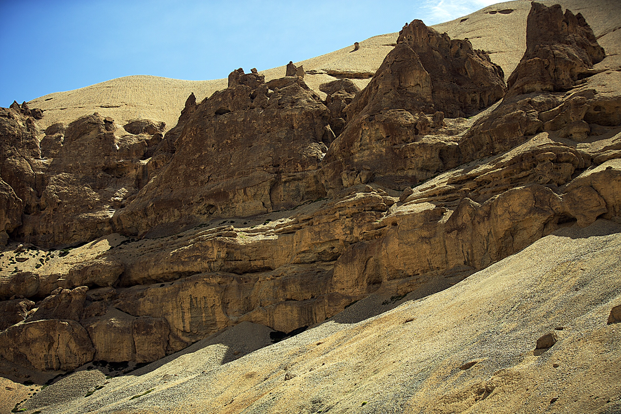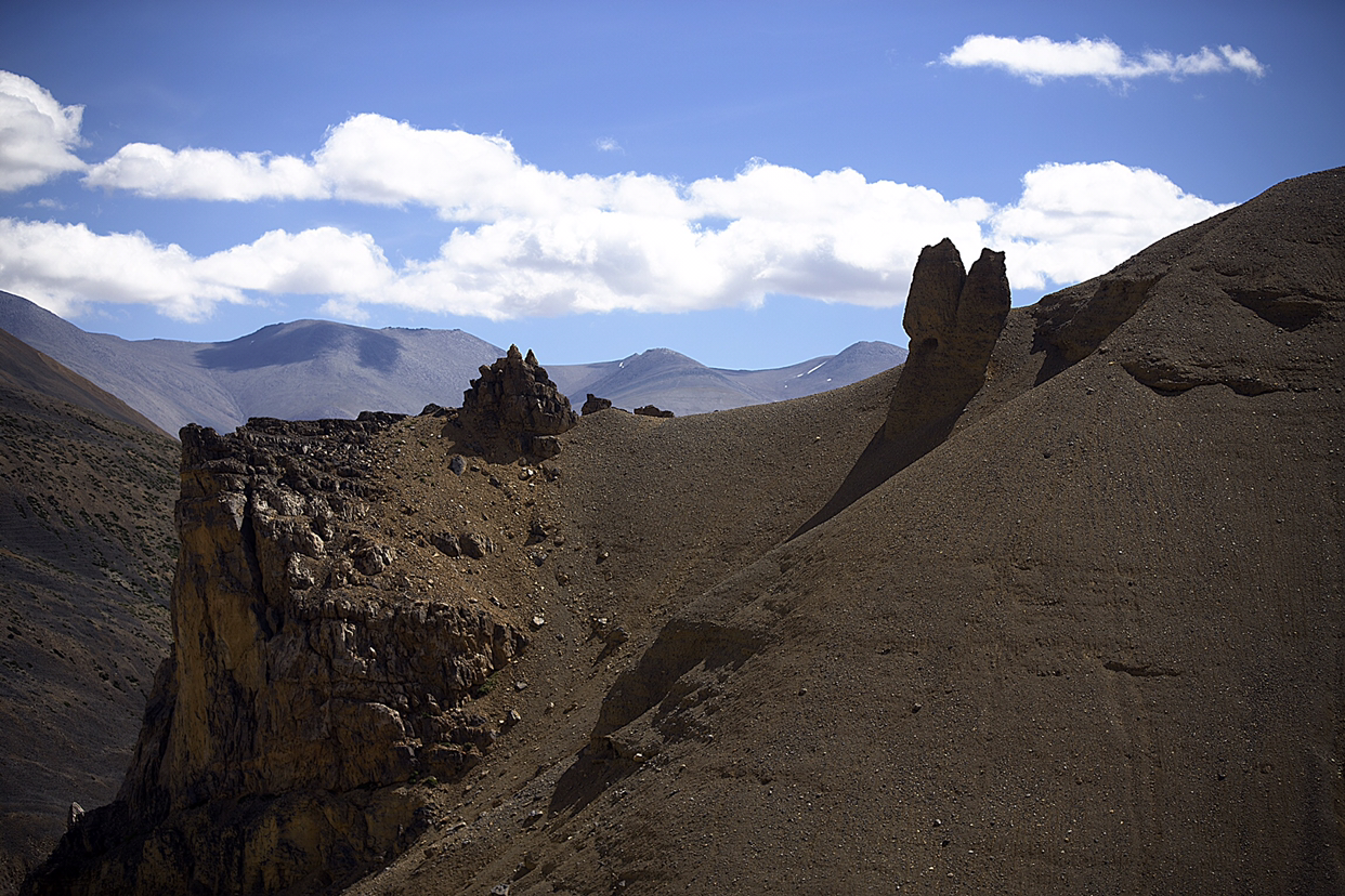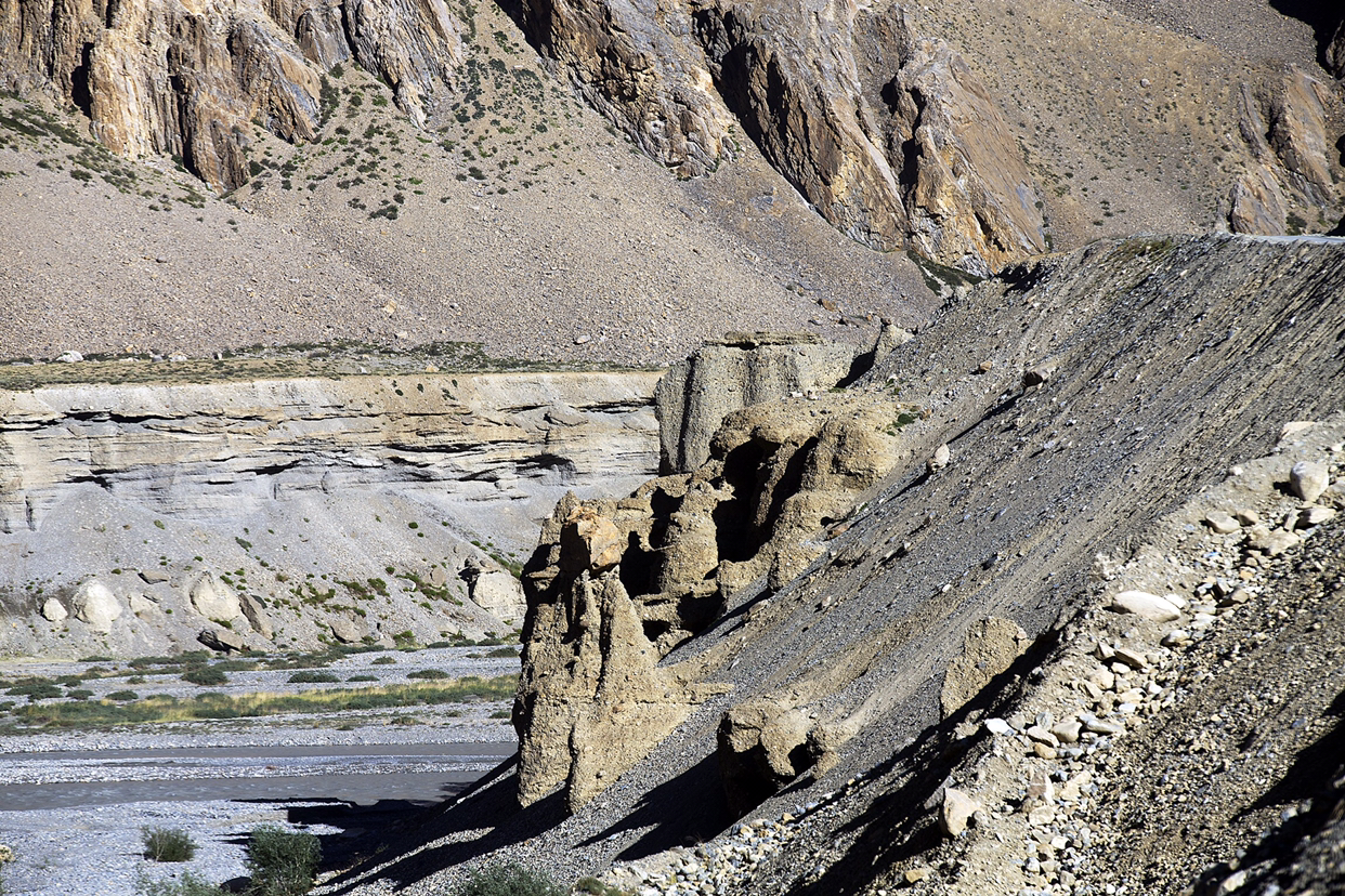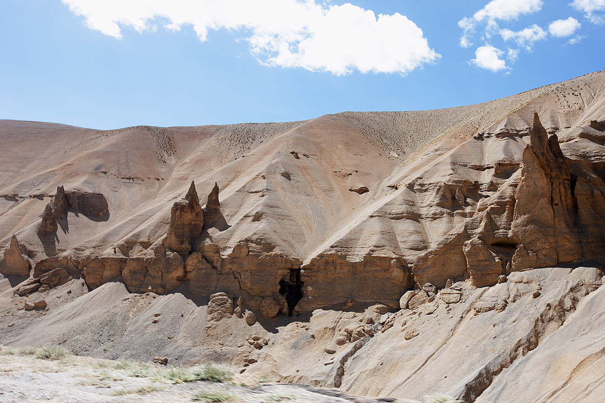 탕그랑고개 정상에서 잠깐 휴식을 취한 버스는 계속 산길을 따라 달려갔다. 고개 근처 몇 곳에만 만년설의 형태가 남아있고 이제는 지구 온난화 현상으로 여름에는 만년설이 차차 사라지고 있다고 한다. 이제는 제일 높은 곳을 무사하게 통과했다는 안도감에 모두들 들떠 있었다. 버스는 계속 마른 먼지를 일으키며 산길을 돌고 돌아가고 있었다. 돌산이지만 산의 경사가 가파르면 한 쪽면은 마치 고운 모래를 채쳐서 뿌려 놓은 것처럼 매끈하게 경사면을 이루고 있다. 터어키 카파도키아지방에 있는 괴뢰메라는 곳에는 장구한 풍화침식작용으로 만들어진 바위들이 야릇하고 특이한 형상을 하고 있는데, 가는 길에 그런 비슷한 돌형상을 몇번 보았다. 황량한 돌산들이 만들어내는 독특한 모습들이 여기 타그랑고개길에서 볼 수 있었다.