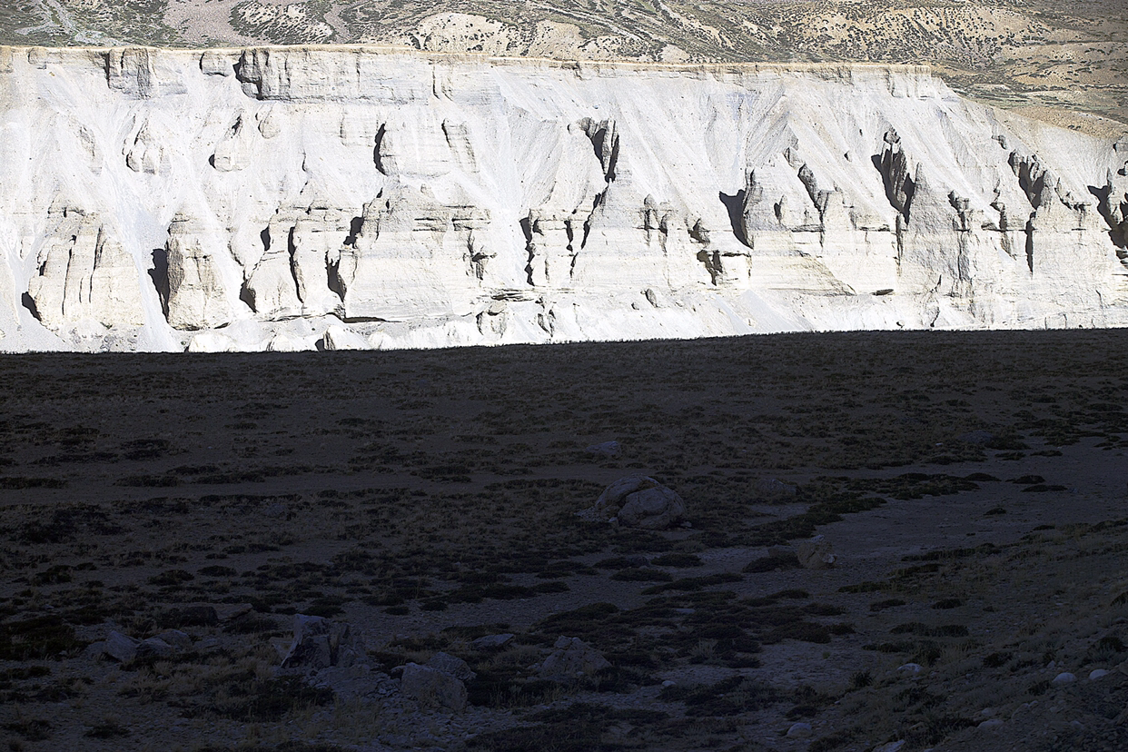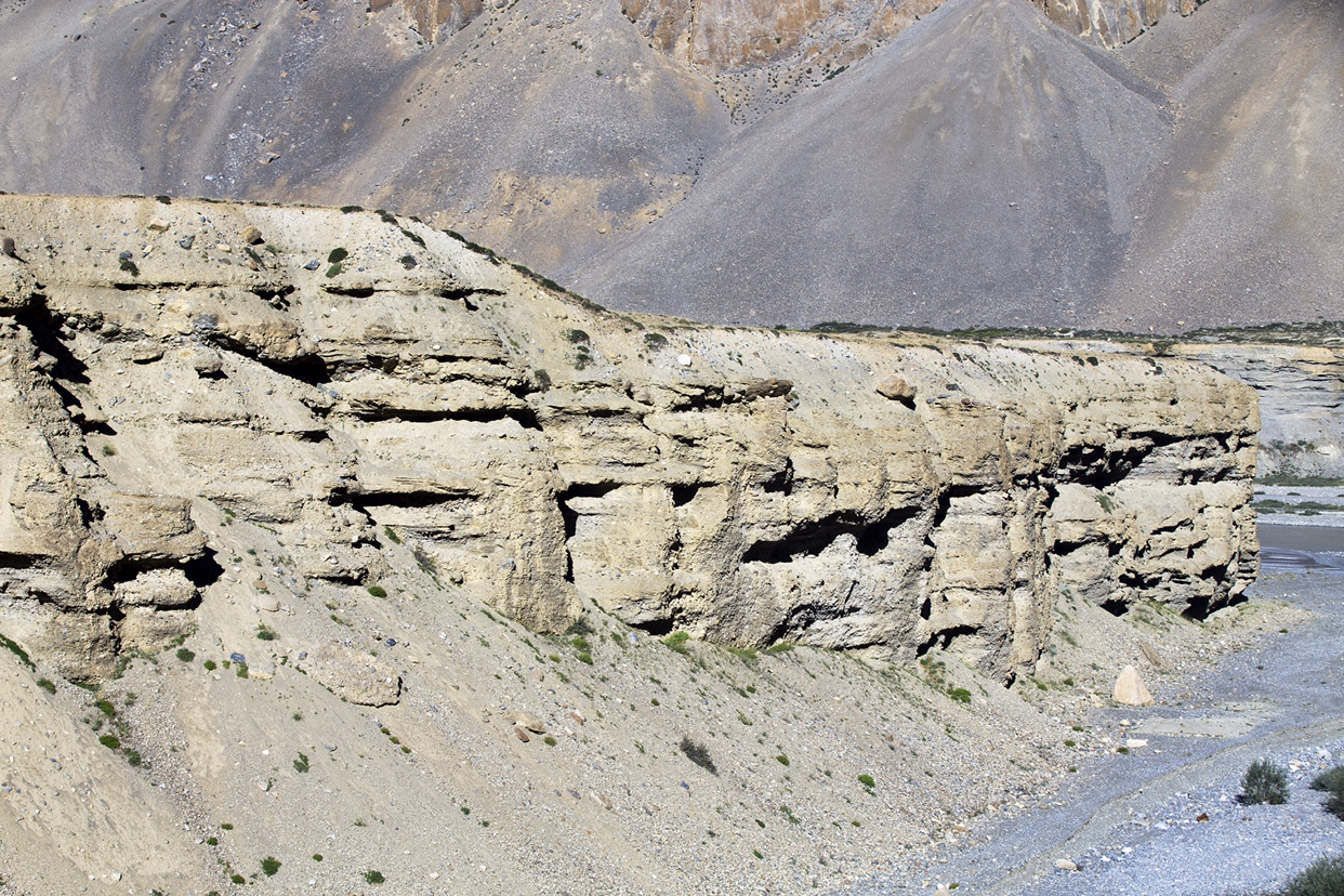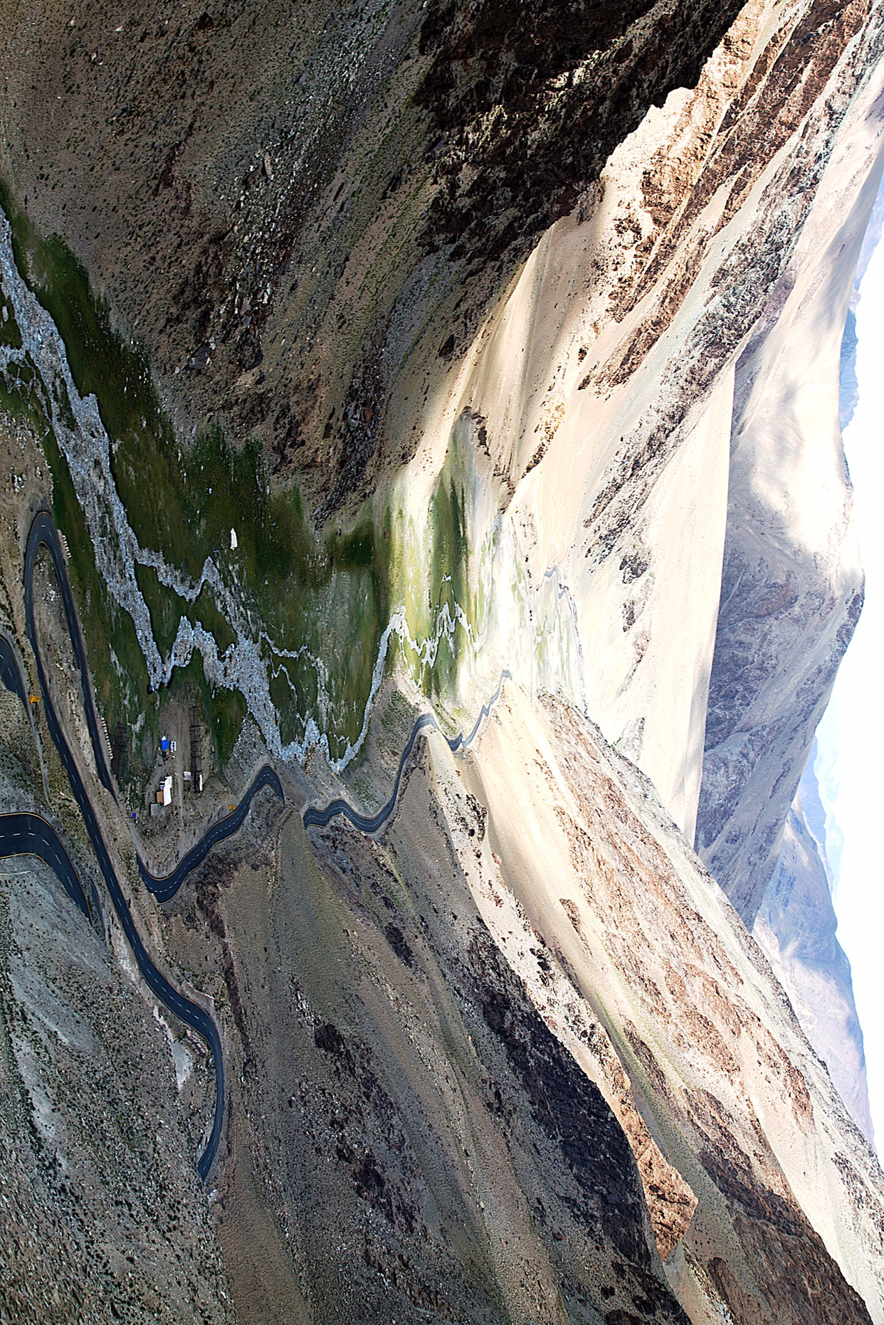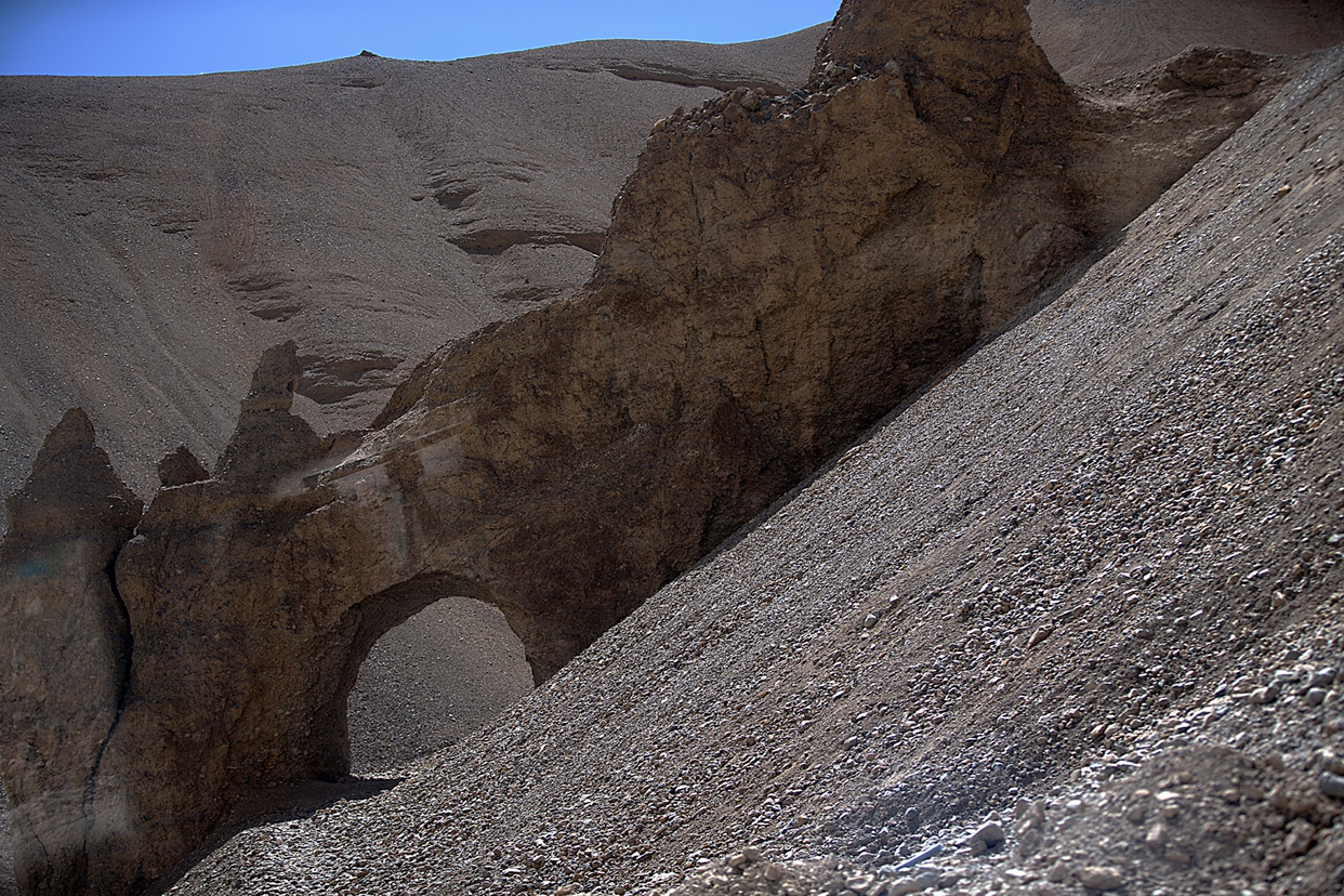 탕그랑고개 정상에서 잠깐 휴식을 취한 버스는 계속 산길을 따라 달려갔다. 고개 근처 몇 곳에만 만년설의 형태가 남아있고 이제는 지구 온난화 현상으로 여름에는 만년설이 차차 사라지고 있다고 한다. 이제는 제일 높은 곳을 무사하게 통과했다는 안도감에 모두들 들떠 있었다. 버스는 계속 마른 먼지를 일으키며 산길을 돌고 돌아가고 있었다. 돌산이지만 산의 경사가 가파르면 한 쪽면은 마치 고운 모래를 채쳐서 뿌려 놓은 것처럼 매끈하게 경사면을 이루고 있다. 터어키 카파도키아지방에 있는 괴뢰메라는 곳에는 장구한 풍화침식작용으로 만들어진 바위들이 야릇하고 특이한 형상을 하고 있는데, 가는 길에 그런 비슷한 돌형상을 몇번 보았다. 황량한 돌산들이 만들어내는 독특한 모습들이 여기 타그랑고개길에서 볼 수 있었다.