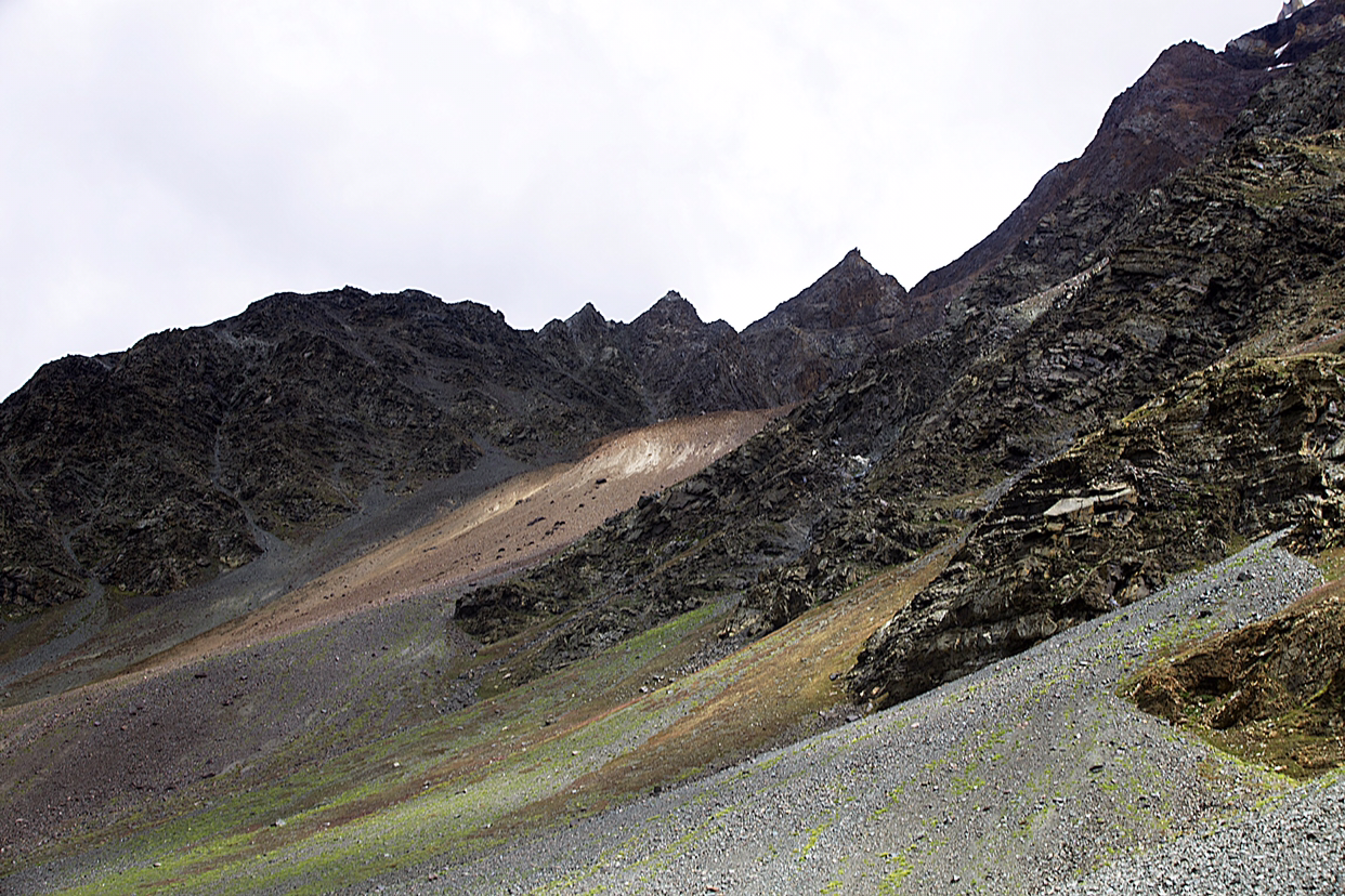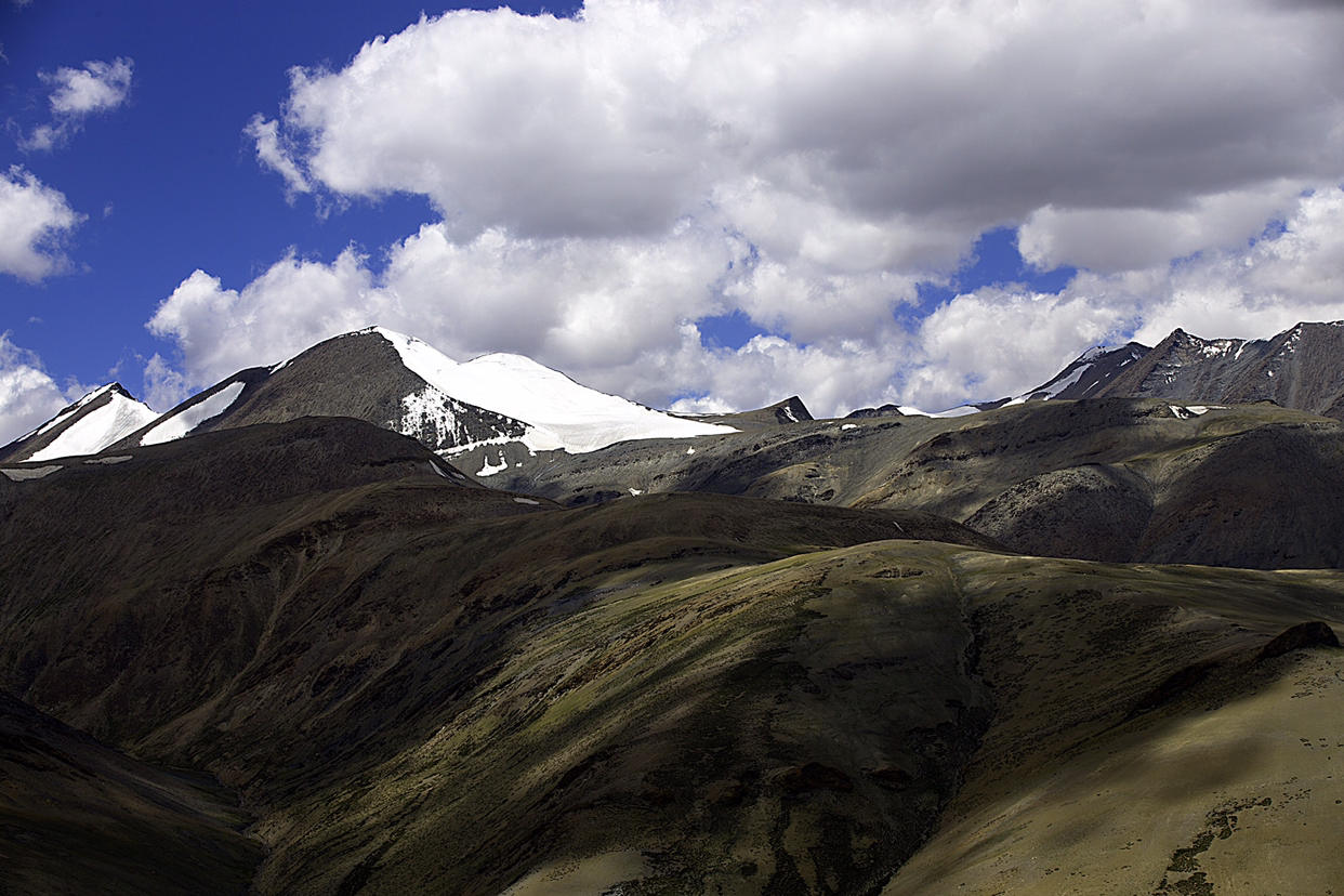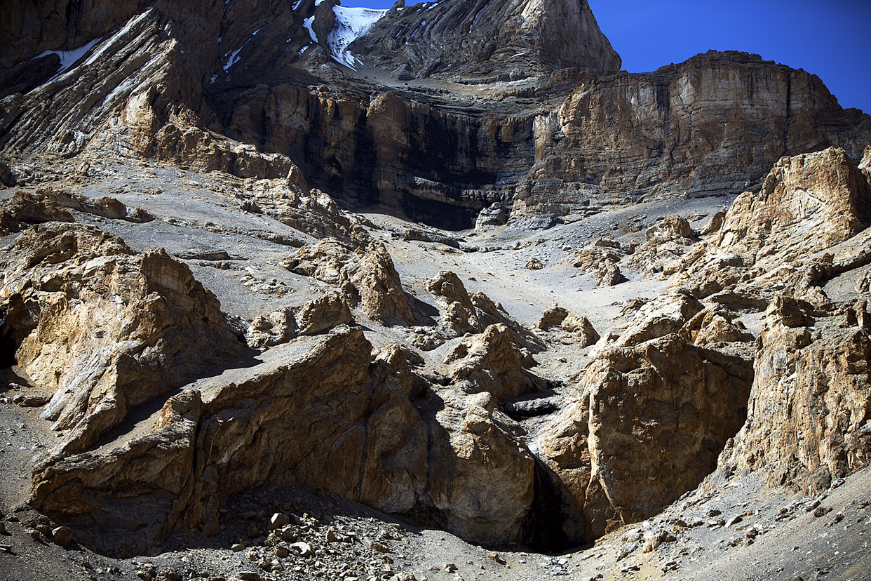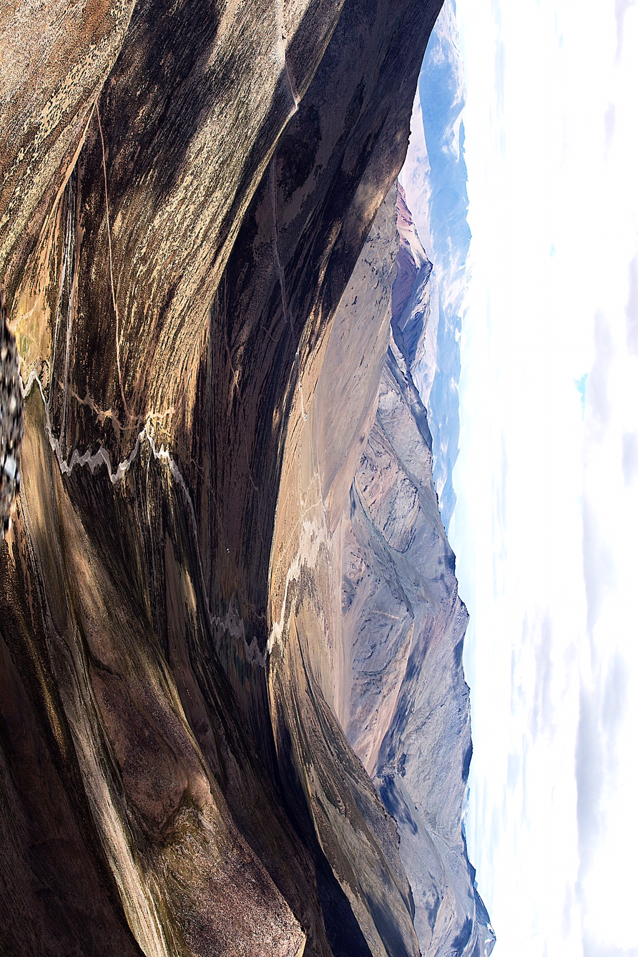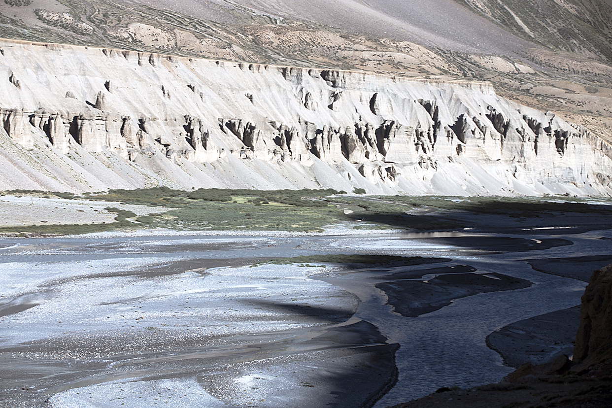 탕그랑고개 정상에서 잠깐 휴식을 취한 버스는 계속 산길을 따라 달려갔다. 고개 근처 몇 곳에만 만년설의 형태가 남아있고 이제는 지구 온난화 현상으로 여름에는 만년설이 차차 사라지고 있다고 한다. 이제는 제일 높은 곳을 무사하게 통과했다는 안도감에 모두들 들떠 있었다. 버스는 계속 마른 먼지를 일으키며 산길을 돌고 돌아가고 있었다. 돌산이지만 산의 경사가 가파르면 한 쪽면은 마치 고운 모래를 채쳐서 뿌려 놓은 것처럼 매끈하게 경사면을 이루고 있다. 터어키 카파도키아지방에 있는 괴뢰메라는 곳에는 장구한 풍화침식작용으로 만들어진 바위들이 야릇하고 특이한 형상을 하고 있는데, 가는 길에 그런 비슷한 돌형상을 몇번 보았다. 황량한 돌산들이 만들어내는 독특한 모습들이 여기 타그랑고개길에서 볼 수 있었다.