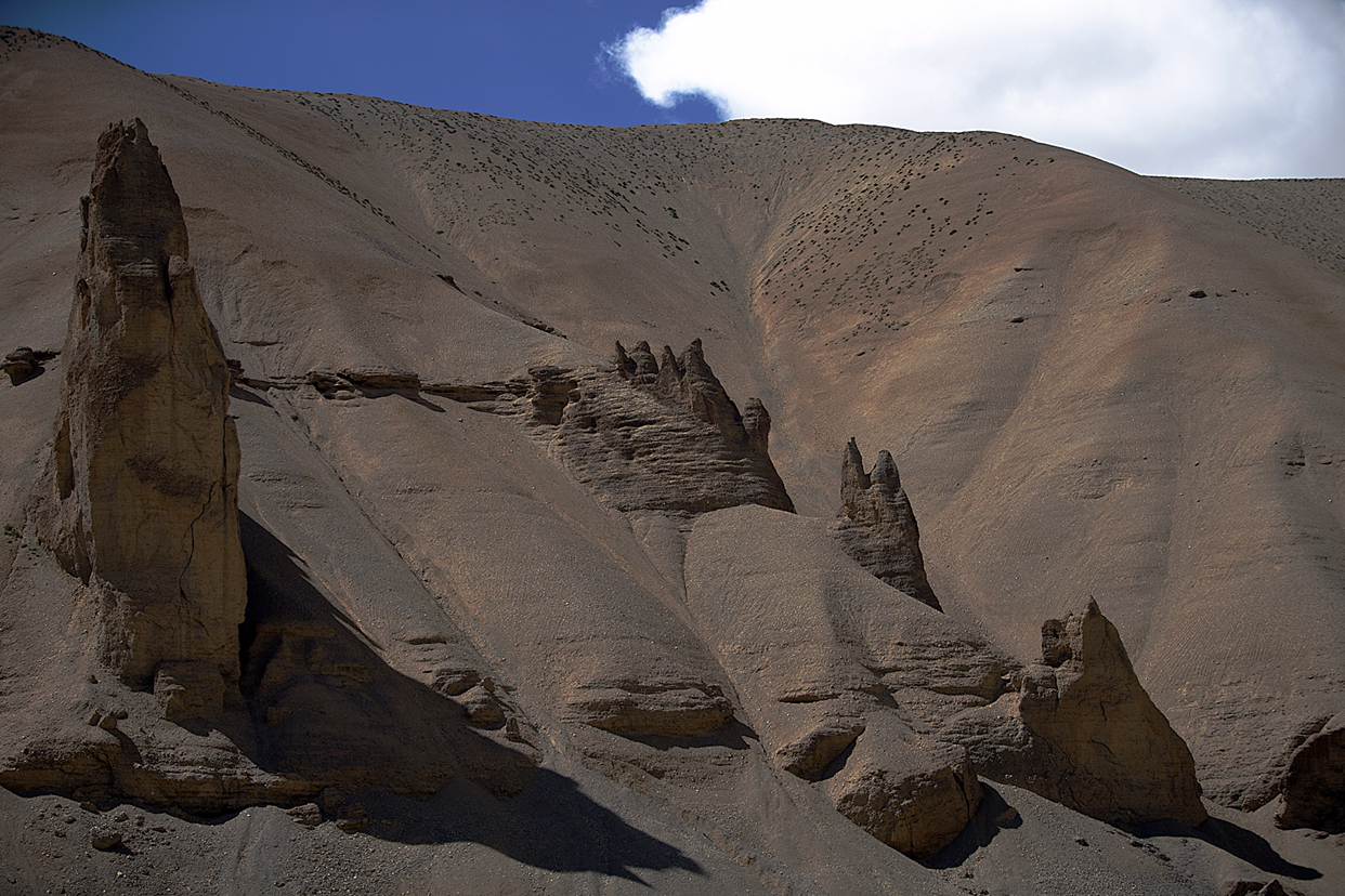 Nakee 고개를 이번에는 내려가는 길이다. 강건너편으로 보이는 황량한 돌산이 갑자기 기암괴석으로 변해갔다. 전형적으로 메마른 기후에 긴 세월의 풍화침식 작용이 빚어낸 조물주의 작품이다. 제일 흔하게 보이는 형상이 윗부분이 탑처럼 뾰족하게 변모하여 거대한 탑이나 웅장한 성채모습이다. 버스가 길게 돌아나가는 산길을 따라 한참을 달리는 동안에 시시각각 변하는 풍광으로 모두들 탄성을 질렀다. 한가지 인상적인 풍경이 눈에 들어 왔는데 사선의 산중턱에 성채같은 형상을 한 것으로 미국의 어느 국립공원에서 본 듯한 그런 모습이었다.