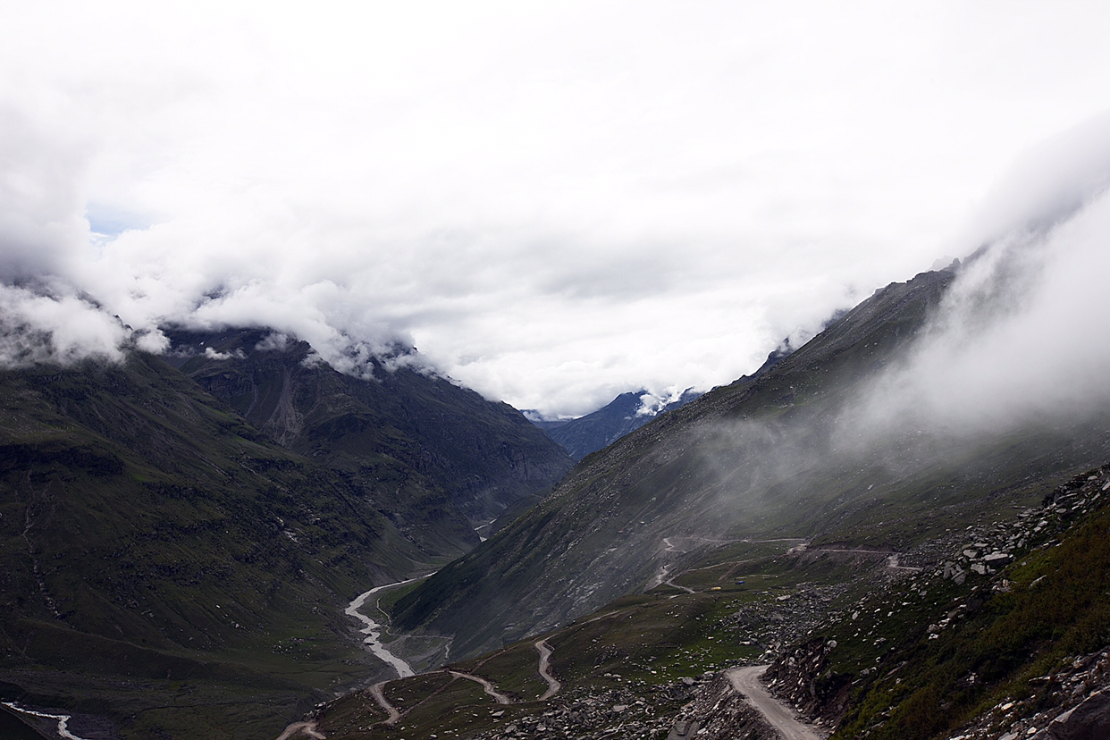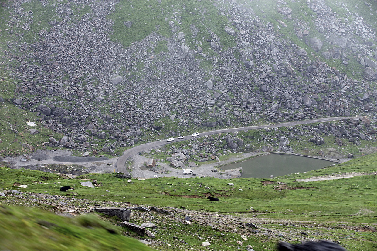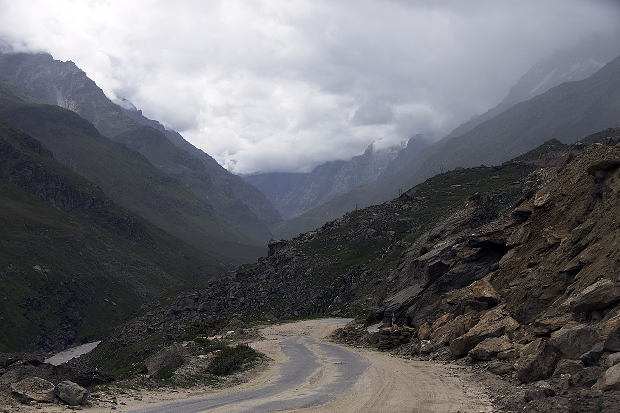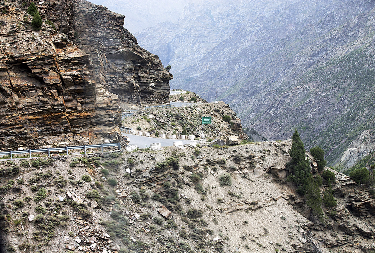마날리에서 출발할 때도 비가 부슬부슬 내려 먼길을 떠나는 나그네의 마음을 촉촉하게 적셔 주었다. 마날리를 벗어나자 우리가 탄 소형버스는 산길로 서서히 고도를 높이기 시작하였다. 마날리가 해발 2050m에 위치하기 때문에 더 높은 산으로 올라가는 형세이다. 오지의 이렇게 험하고 얄궂은 도로는 처음인 것 같다. 오지라면 남미의 안데스산맥이나 호주의 Outback이나 아프리카의 사막같은 길들을 다녀 보았지만 이런 길은 아니었다. 미국서 살면서 다녀본 험한 산길은 로키산맥이 남북으로 관통하는 콜로라도주의 로키산을 겨울에 자동차로 넘을 때 힘들었던 기억이 있다. 산허리로 난 도로가 나사의 홈처럼 그렇게 완만하게 빙빙 돌아가지만 그래도 나사 홈과 홈 사이는 그렇게 촘촘하지는 않았고 도로폭도 엄치 넓었고 위험한 구간에는 튼튼한 가드레일이 설치되어있어 안심mode가 되었지만 여기 산길도로는 그렇지 않다. 일단 도로폭이 너무 좁다.그래도 대형 트럭과 버스가 마주보고 무사하게 지나가는 걸 보고 그들의 운전솜씨에 경탄했다.
