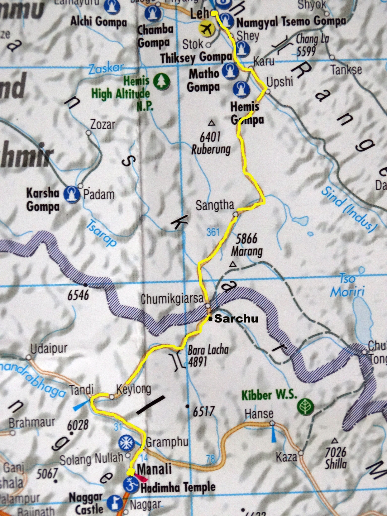북인도 지도에서 Manali에서 Leh까지의 구간만 찍었다. 우리가 오늘 자고갈 Sarchu는 워낙 작은 마을이라 지도에 표시되어 있지 않아 내가 만들어 넣었다. 사추 바로 위의 굵은 사선은 굽이치는 강표시가 아니고 주경계선 표시다. 사추까지가 히마찰프라데시(Himachal Pradesh)주이고 사추를 지나면 잠무 카시미르(Jammu Kashmir)주로 들어가게되어 오른쪽으로 중국, 왼편으로 파키스탄과 국경을 접하고 있다. 우리가 가려고 하는 Leh가 바로 잠무 카시미르주에 있어 이렇게 힘들게 오지 산중으로 가고 있다. 특히 카시미르지역은 현재도 파키스탄과 영토분쟁을 다투고 있는 지역이다.