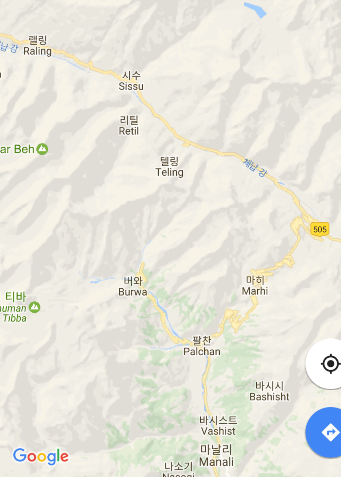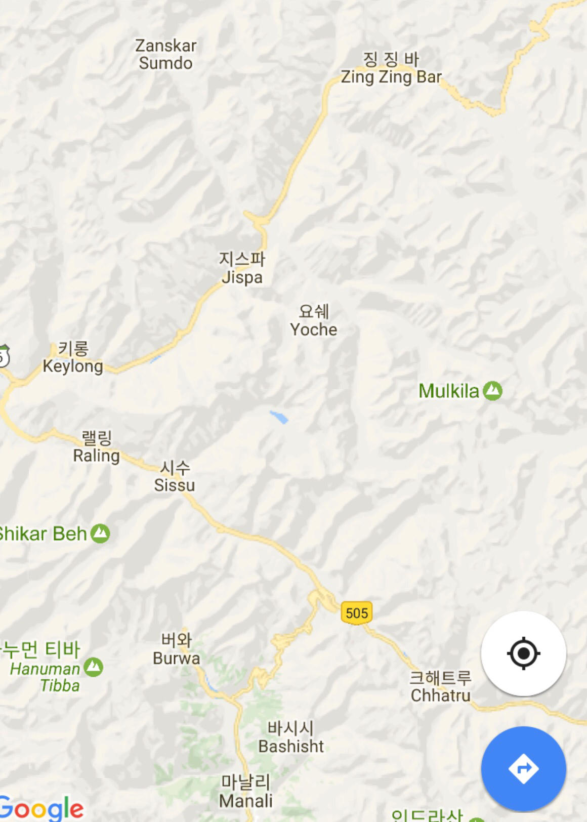 여기 체크 포인트를 구글지도에서 찾아 보았다. 마날리를 출발해서 짙은 안개에 쌓인 팔찬을 지나 마히 휴게소에 잠깐 쉬었다가 계속 올라오다 505번 도로를 만나 좌회전하여 상구 북쪽으로 길을 잡아 체크포인트가 있는 Koksar가 지도상의 시수(Sissu) 근방이다.