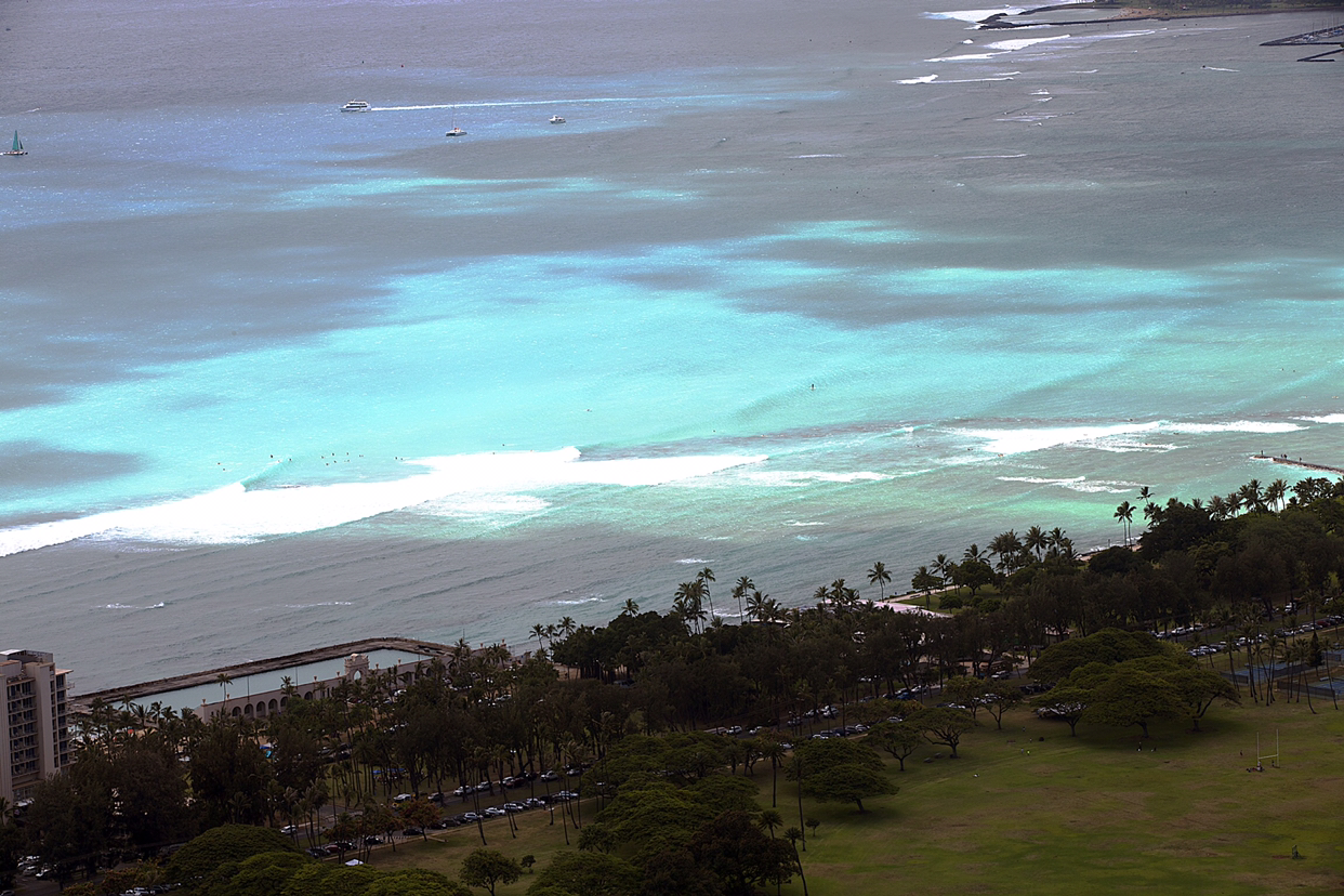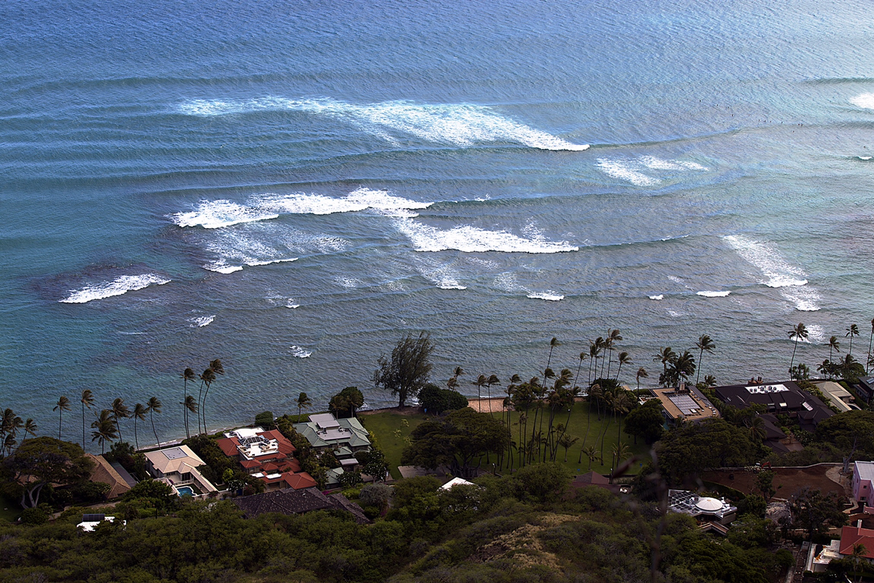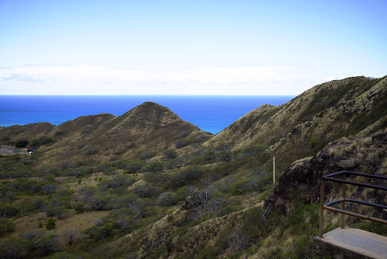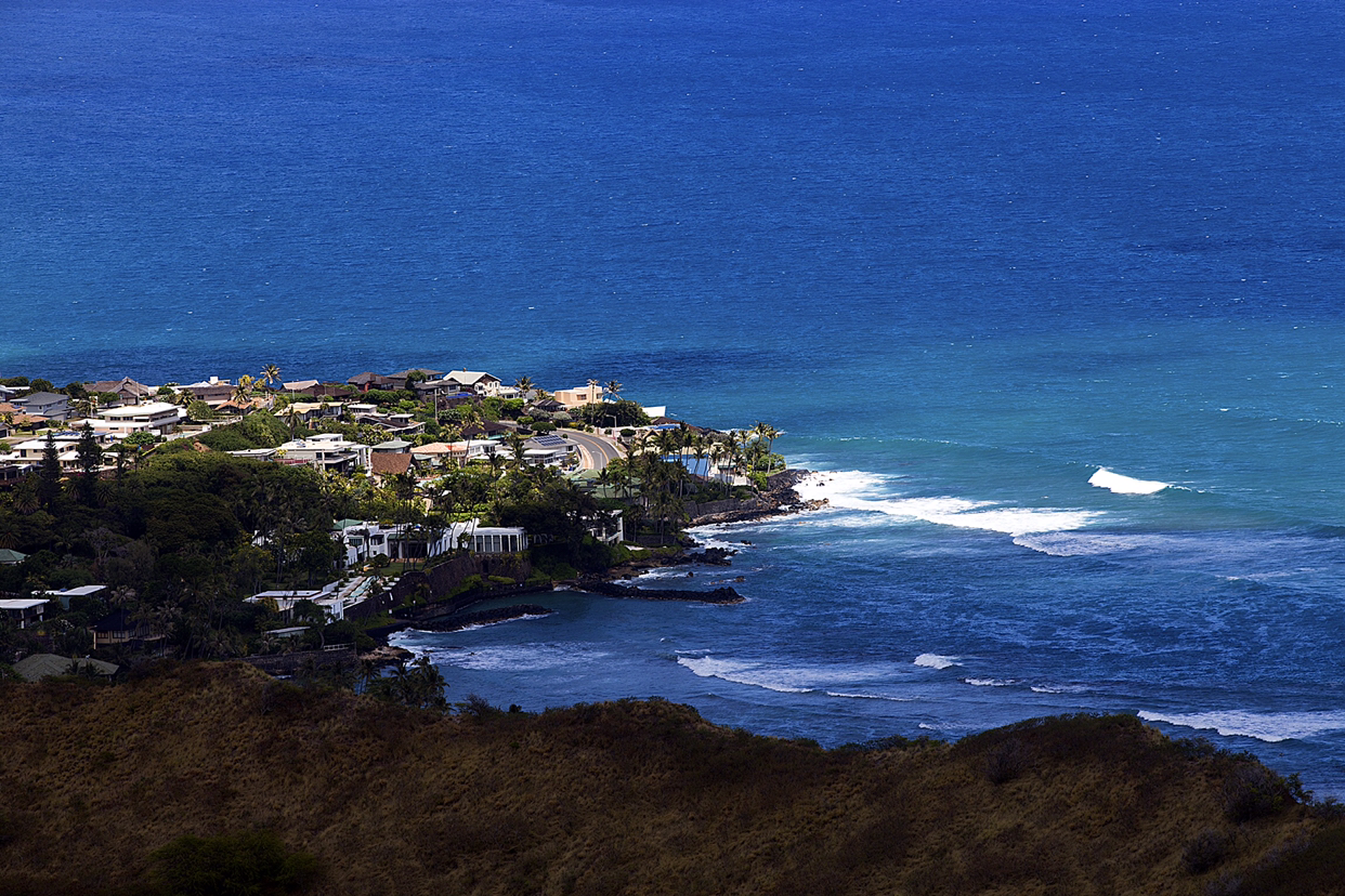 별로 높지도 않은 봉우리 꼭대기에 올랐어도 그게 정상이라고 아래 것들이 한눈에 들어온다. 제일 멋진 뷰가 와이키키 해변과 고층건물이 즐비한 호놀룰루 시내였다. 군데군데 남색 바다가 벌판처럼 펼쳐지고 하늘을 향해 쭉쭉 뻗은 고층건물이 해안선을 따라 줄지어 서 있다.