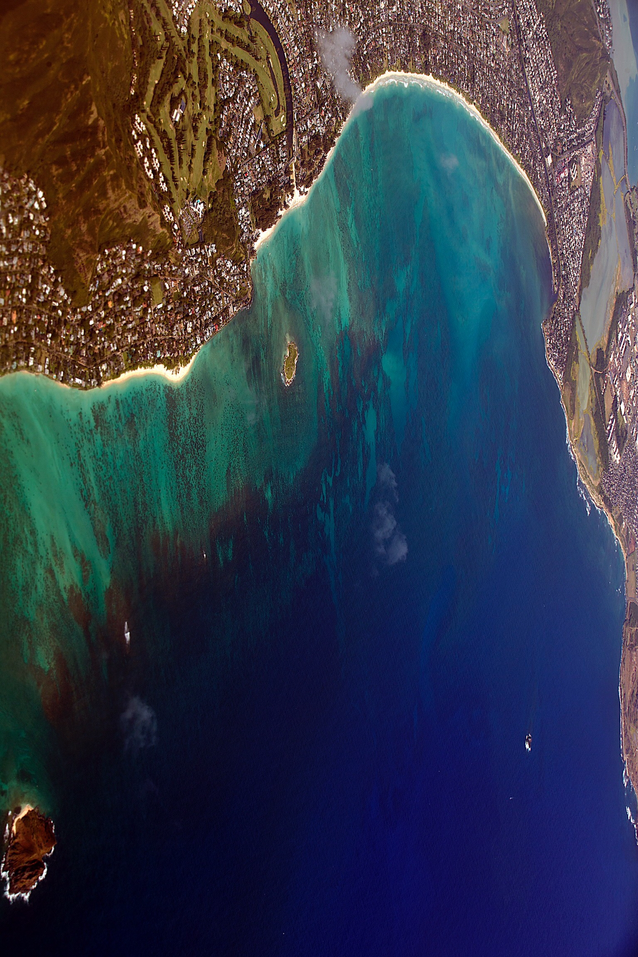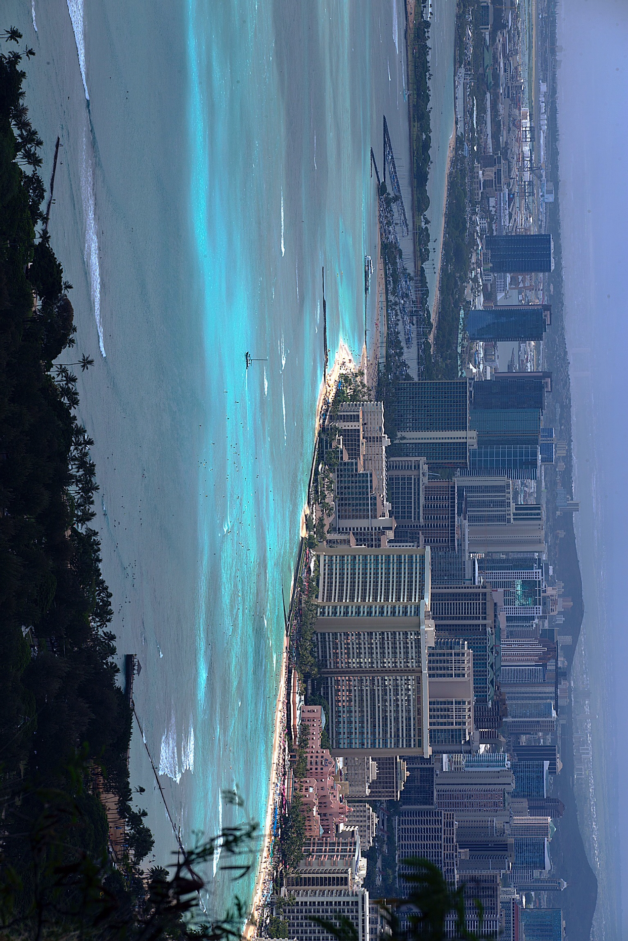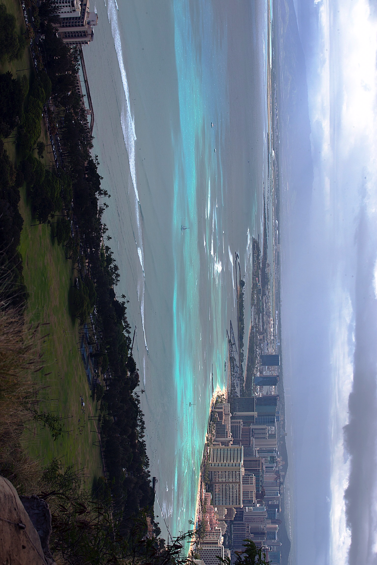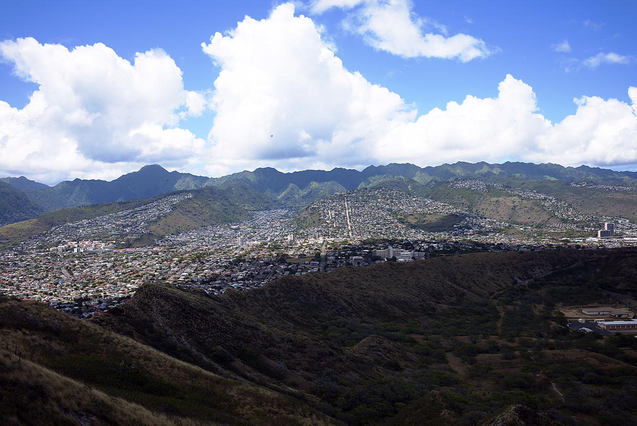 별로 높지도 않은 봉우리 꼭대기에 올랐어도 그게 정상이라고 아래 것들이 한눈에 들어온다. 제일 멋진 뷰가 와이키키 해변과 고층건물이 즐비한 호놀룰루 시내였다. 군데군데 남색 바다가 벌판처럼 펼쳐지고 하늘을 향해 쭉쭉 뻗은 고층건물이 해안선을 따라 줄지어 서 있다.