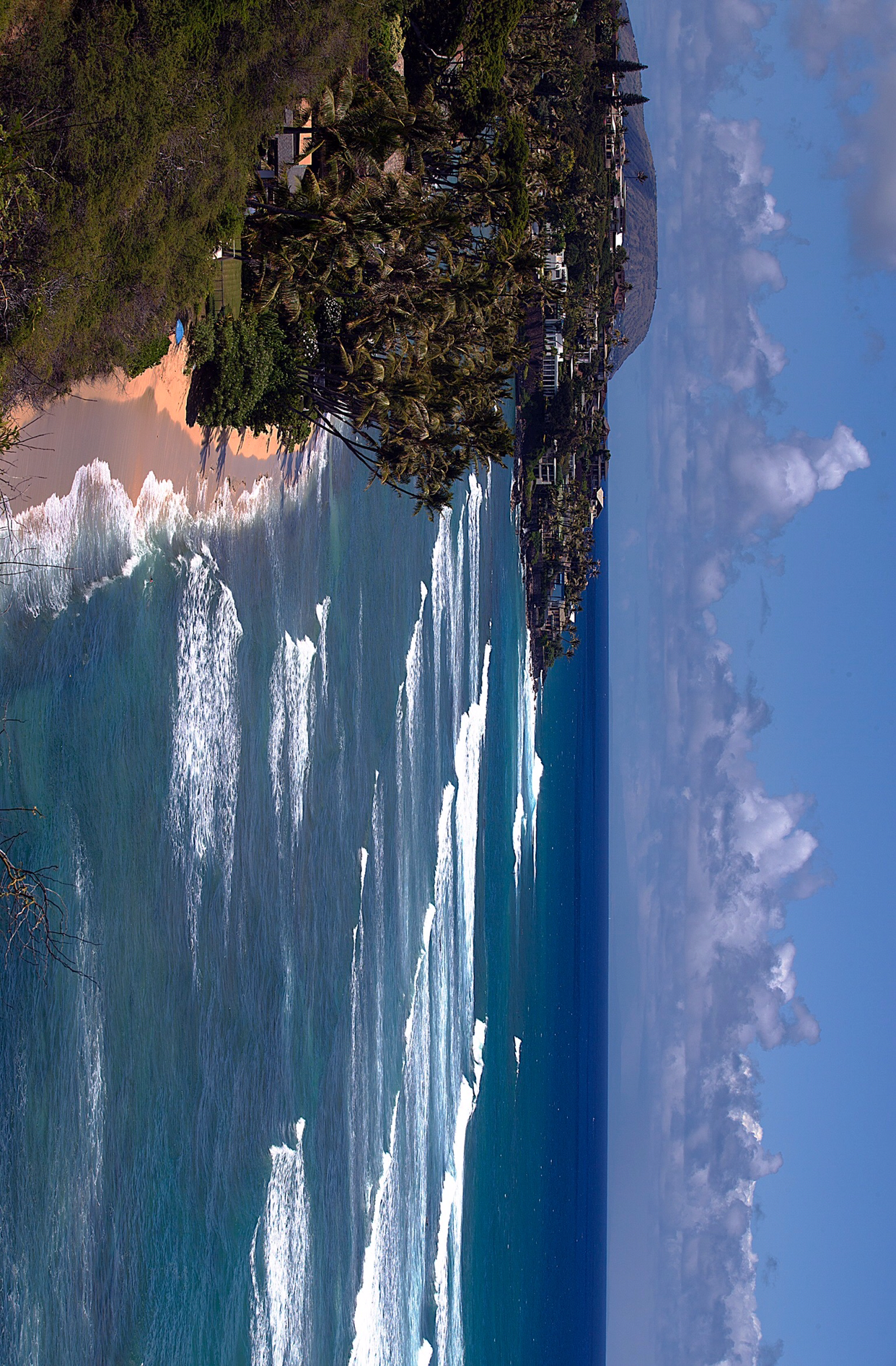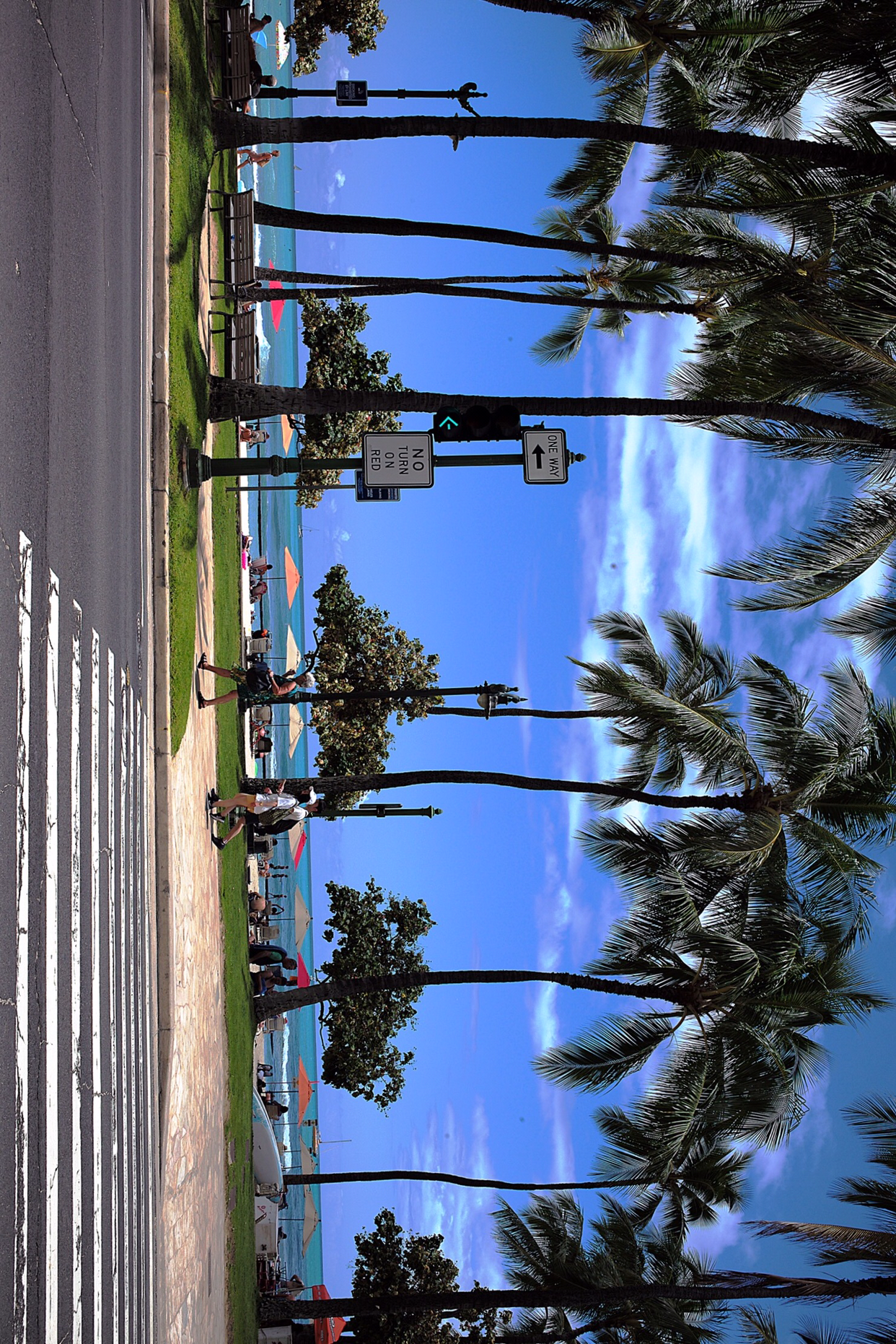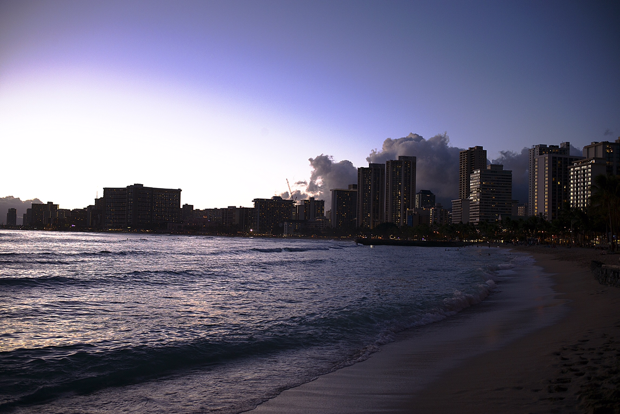 사실 위 사진이 첨으로 와이키키 해변을 만난 것으로 차를 짐 싣고 내리는 구간에 야매로 파킹해 놓고 카메라만 들고 해변으로 걸어 나갔다. 그때는 하늘에 구름도 없이 말 그대로 하늘이 파랬고 그 아래 키 큰 야자수가 미풍에 살랑거리고 바다색도 그 흔한 남색으로 빛을 내고 있었다. 첨보니 파라다이스 같았다.
