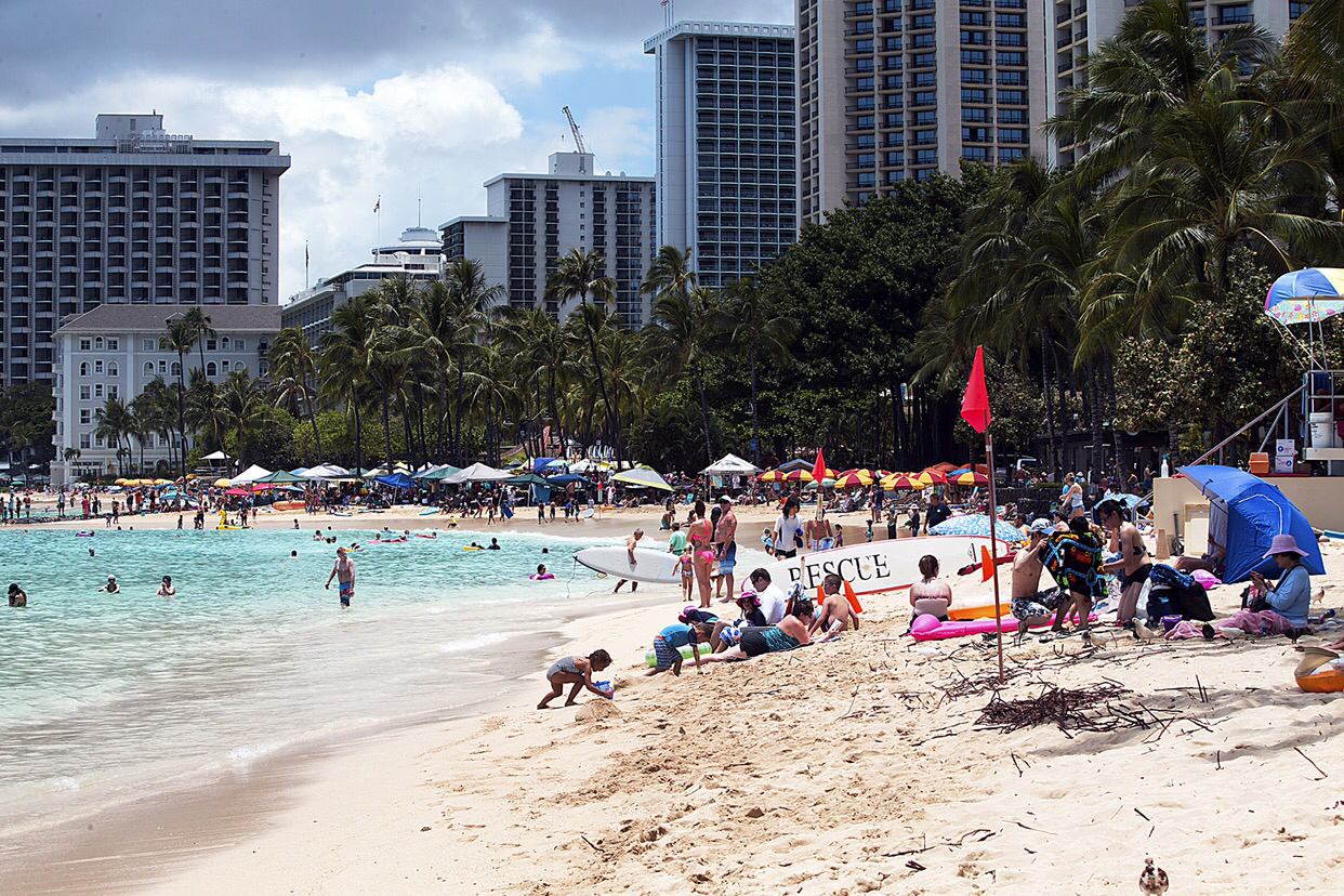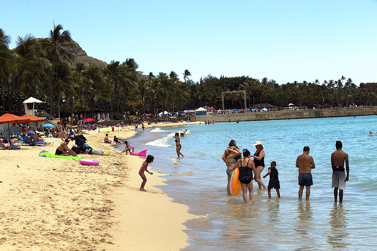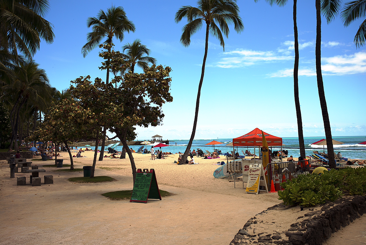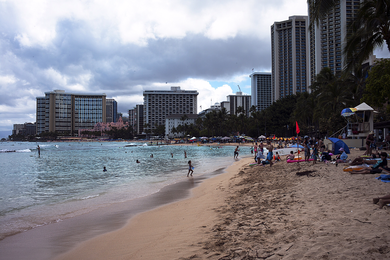 진주만을 구경하고 나서는 와이키키로 향하였다. 고속도로 1번을 타고 East로 달리면 그 유명하다는 WAIKIKI 해변이 나온다. 워낙 붐비는 곳으로 쭉쭉 하늘로 솟아난 고층건물과 세계적인 명품 브랜드 상점은 줄을 이어 거리에 선을 보인다. 한여름철에 많을 때는 하루 6만 5천 명 정도의 관광객들이 몰려든다고 한다. 이런 세계적인 명성을 얻은 것이 1920년대에 Royal Hawaiian Hotel이 문을 열면서 당시 유명 연예인들과 부호들을 유치하자 와이키키가 세계적으로 이름을 알리기 시작했다는 것이다.