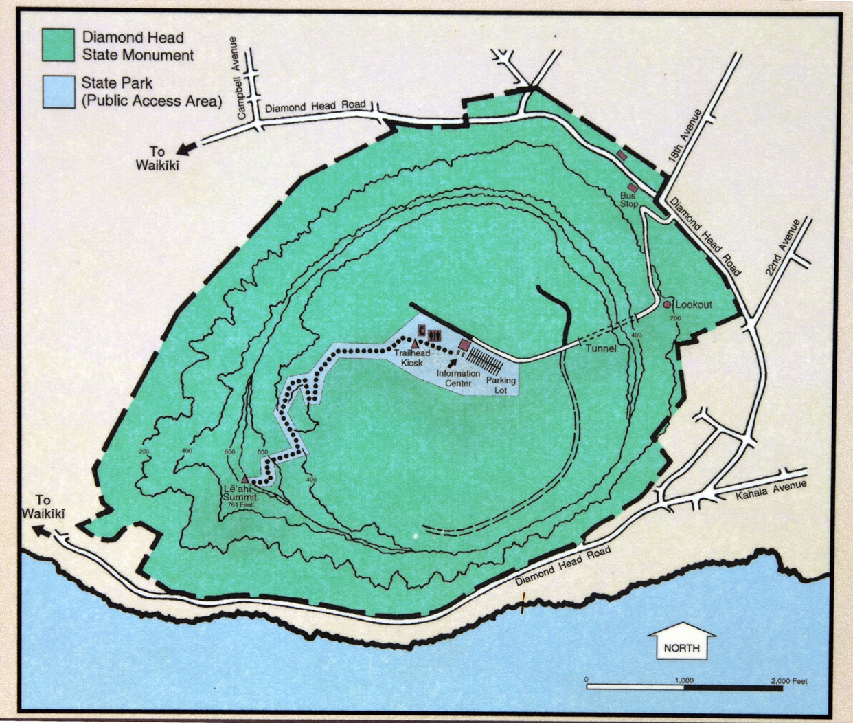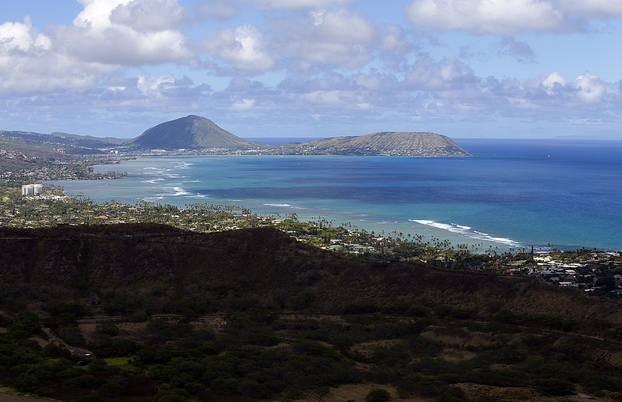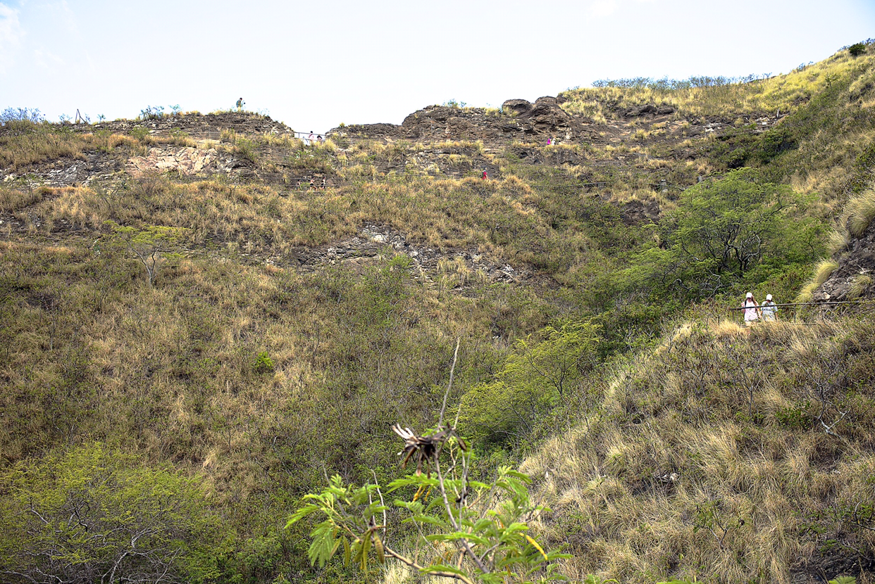 다야몬드 헤드는 하와이섬의 landmark로 자리 잡고 있다. 원주민어로 Le'ahi라고 하는데 뜻은 분화구(Crater)이다. 고상하고 비싼 다야몬드란 이름은 1700년경 이 곳을 탐험한 유럽인들이 반짝반짝 빛나는 광물질 Calcite crystal을 보고 금강석인줄 알고 그렇게 작명을 해서 지금까지 이쁘고 비싼 이름으로 불려지고 있다. 위의 항공사진에서 왼편으로 보이는 최고봉이 242m 정도이지만 올라 가보니 와이키키 해변과 호놀룰루 고층건물이 한눈에 내려다보여 시원한 해변 경치를 즐길 수 있다. 공원 관리인에게 물어보니 올라 가는데 편도 45분 걸린다고 하길래 쓰리빠 질질 끌고 올라갔더니 1시간 걸렸다. 힘든 코스는 아니지만 막판 오르막이 가파르고 경사가 있는 계단으로 되어 있어 숨은 조금 찼다.
