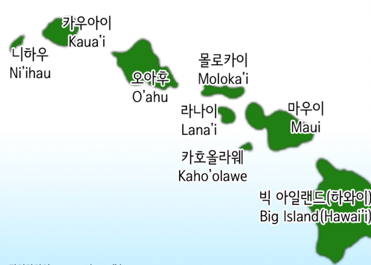 하와이에 큰 섬이 8개 그리고 작은 무인도가 100여 개가 있다고 한다. 이 중에 제일 인구가 집중해 있고 주도 호놀룰루가 있는 오아후(O'ahu), 그다음은 할레아칼라(Haleakala) 국립공원이 있는 마우이(Maui)로 오아후에 이어 두 번째로 많은 관광객이 찾는 섬이다. 세 번째는 현재도 계속 불가리 용암을 분출하고 있는 Hawaii Volcanoes국립공원이 있는 Hawai'i 섬으로 이 국립공원을 보러 많은 관광객이 방문하는 곳이다. 그런데 이 섬을 하와이섬이라고 부르니까 하와이 전체 섬을 말하는 것으로 오해되어 이 섬을 별칭으로 Big Island로 부르고 있다. 나머지 5개 섬은 관광객들도 별로 찾지도 않은 섬들로 오아후 위쪽에 2개 마우이 왼편에 3개가 있다.