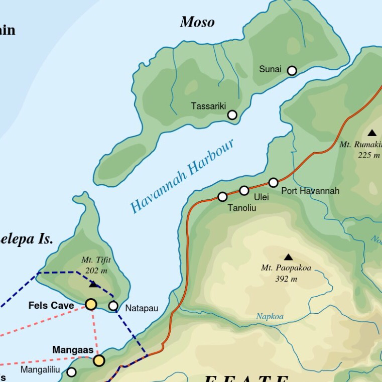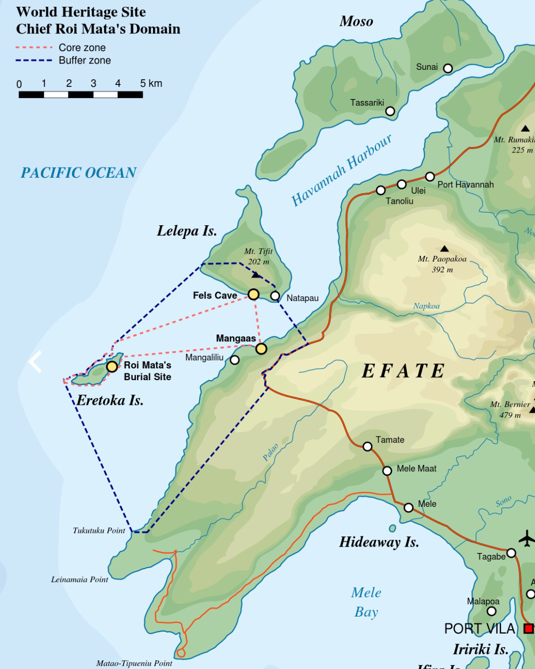 13세기경 전설적인 추장 Roi Mata가 활동하였던 세 섬을 이은 점선이 세계문화 유산지역으로 Efate, Lelepa and Eretoka섬을 둘러싸고 있다. 걸출한 부족의 지도자로 등장하여 흩어진 여러 부족을 통일하여 소위 말하는 평화시대를 이룩했다고 한다. 그렇게 요순시절을 이어가던 추장은 그의 권력을 넘보던 동생에 의하여 독살되어 Hat Island(Ere toka Island)에 매장되었다고 한다. 이러한 그의 업적은 거의 잊혀졌다가 구전으로 내려오던 민요를 접한 프랑스 고고학자가 그의 매장지를 찾아 내었는데 발굴해보니 집단 매장지에 30-50명 정도가 함께 매장된 무덤터를 발견하여 그의 시종이나 가족들이 함께 순장된 것으로 추정하고 있다.
