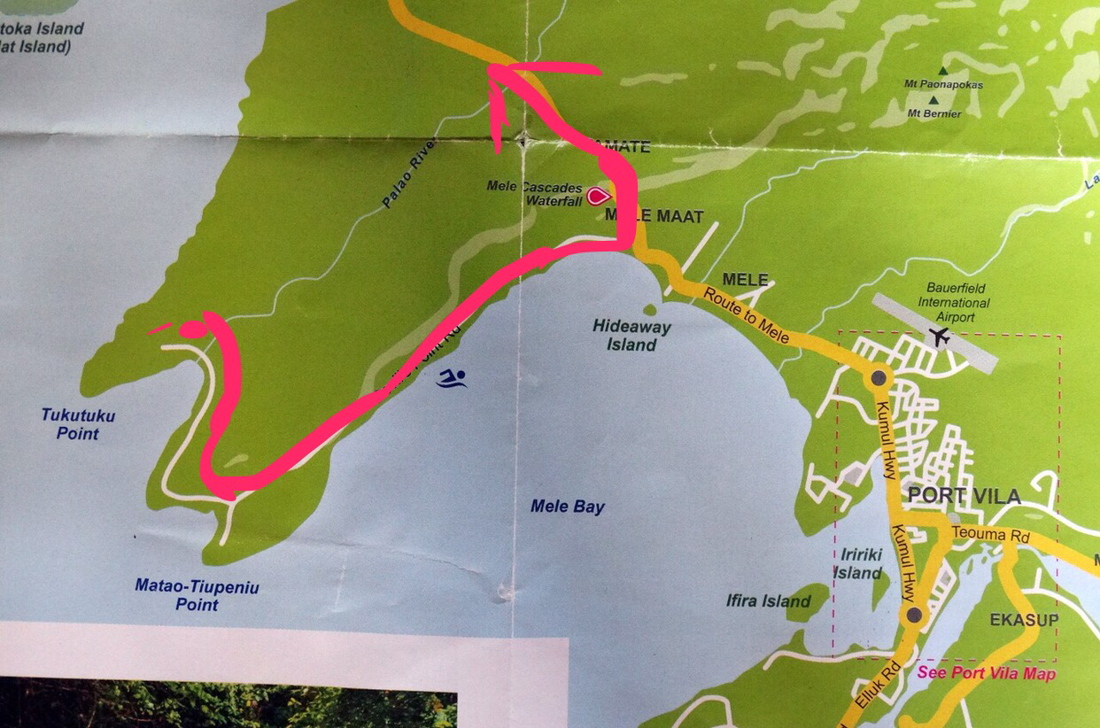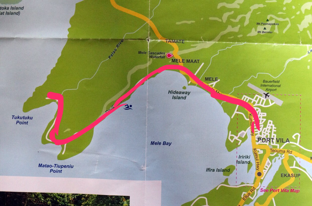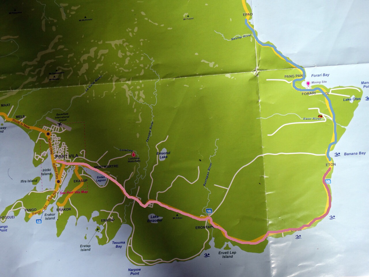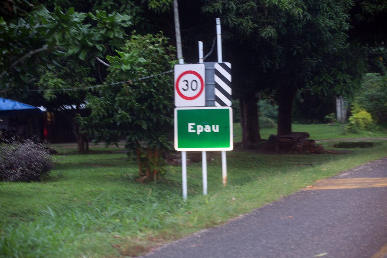 북부 해안도로를 버리고 동부 해안도로로 내려가는 길에 마을 Epau가 있었다. 마을을 지날 때 부터 땅거미가 내리기 시작하였다. 도로는 해안으로 이어지지 않고 내륙으로 들락날락하며 Port-Vila로 향하고 있었다. 곧 어둠이 사방을 덮어 버리자 자동차 헤드라이트가 비쳐주는 도로의 앞쪽 부분만 식별할 수 있고 나머지 부분은 어디가 무엇인지 알아 볼 수도 없었다. 어둠이 내려 앉은 Efate 순환도로를 때때로 마을 주민들이 길 양쪽으로 걸어 가고 있었다.