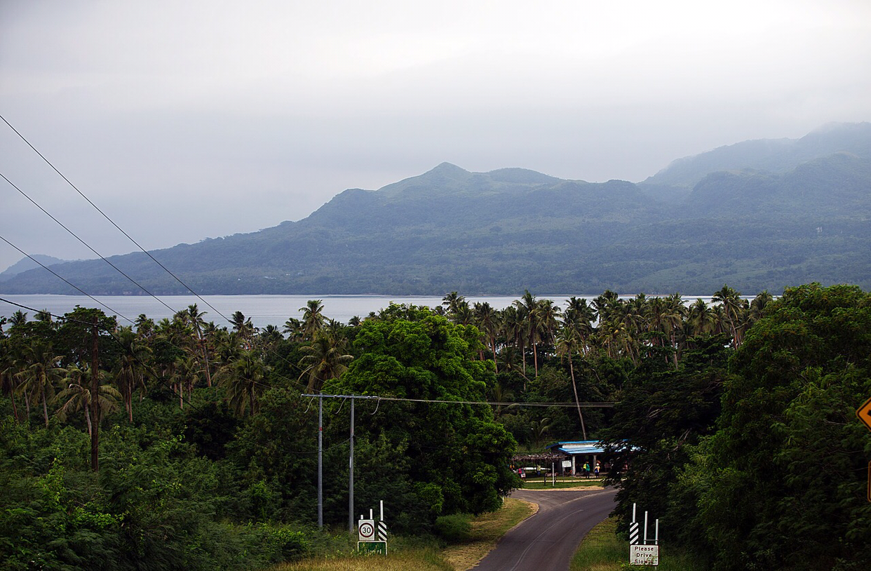 마을로 들어서는 내리막 길위에서 차를 멈추고 경치를 보았다. 마을 뒤쪽으로 보이는 것은 다른 섬인듯 보였다. 마을을 둘러 싸고 있는 키큰 야자수가 눈에 쏙 들어왔다.