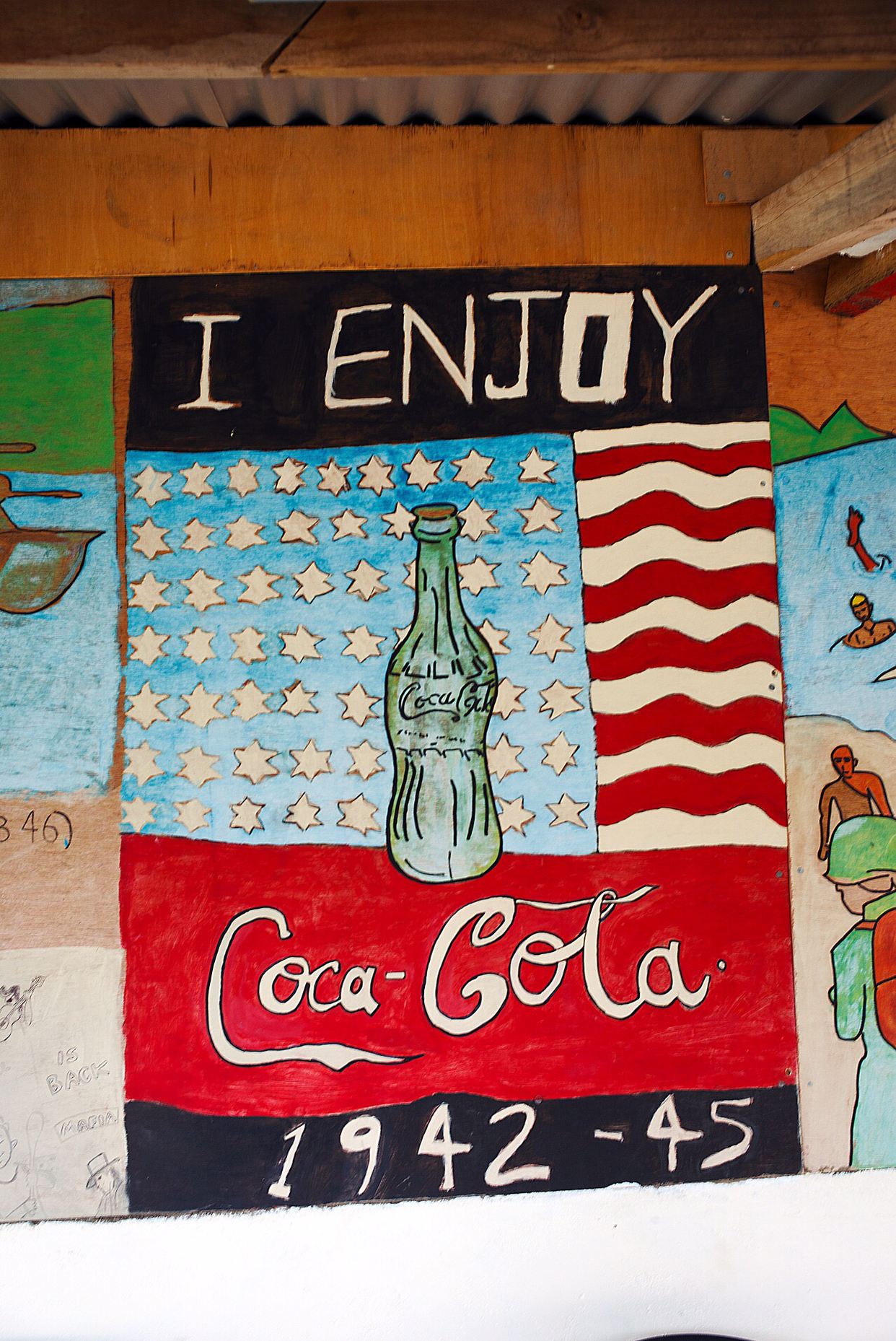 미국의 상징으로 Coca-Cola를 그려 놓았다. 더운 지방에서는 물보다도 시원한 콜라가 군인들의 갈증을 해소시켜준 모양이다. 미군의 대표적인 문화를 그려 놓았다.