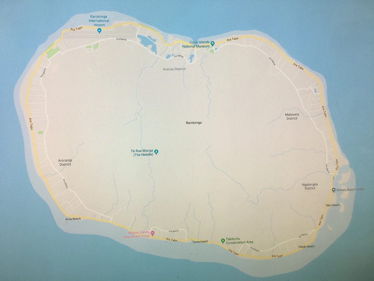 쿡아일랜드의 수도 Avarua가 있는 섬을 Rarotonga라고 하는데 제일 큰 섬이다. 위 지도에서 보이는 것처럼 섬둘레를 돌아가는 길이 두 갈래가 있다. 하얀색으로 표시된 안쪽으로 난 길을 옛길이란 뜻의 Ara Metua라고 하는데 약 11세기에 형성된 길로 초기 정착시에 자연스럽게 만든 길이고, 다른 하나는 노란색으로 표시된 길로 Ara Tapu 라고 하는데 성스러운 길(Sacred Road)이라고 한다. 아마도 관광도로처럼 시원한 해변가로 푸른 바다를 가슴에 끼고 달릴 수 있는 길이다. 물론 나도 렌트한 차로 Ara Tapu로 달렸다. 섬 중앙에는 나무로 덮인 산들이 솟아 있어 섬중앙을 지나 남북이나 동서로 관통하는 도로는 없다.