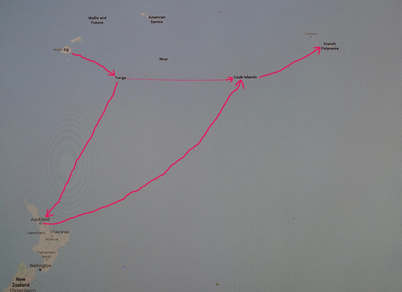 통가에서 쿡이일랜드까지 직선거리로 볼 때 딱 1000마일 (1600km)이지만 직항 노선이 없어 뉴질랜드 오클랜드로 가서 그 곳에서 쿡아일랜드로 날아 가야만 한다. 근데 통가에서 오클랜드까지 거리는 1278마일(1992km)이고 오클랜드에서 쿡아일랜드까지는 1885마일(3015km) 이기에 직선으로 1000마일만 날아 갈 거리를 돌고 돌아 3086마일을 날아 가야만한다고 하니 시간과 돈이 허비되는 느낌을 떨쳐 버릴 수가 없었다. 게다가 오클랜드 공항에서 연결편을 타기 위해 무려 17시간을 layover(공항대기)해야 한다고 하니 유쾌한 여정은 아니었다.