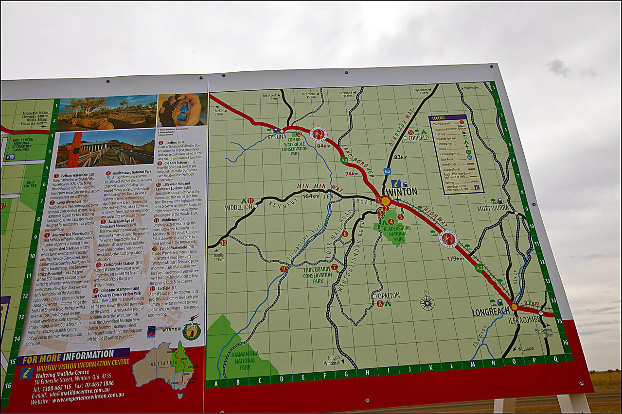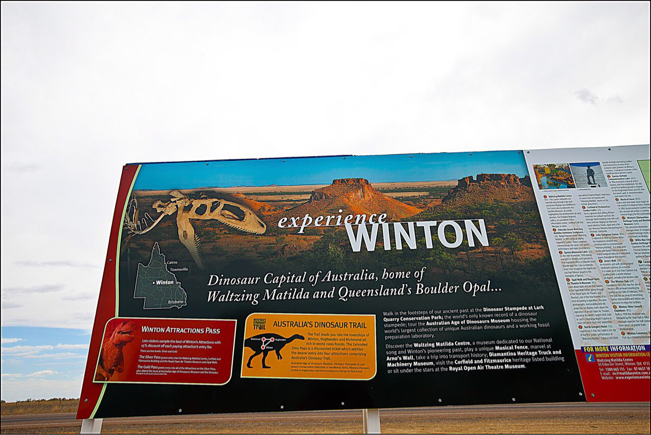 170Km를 달려왔다. 안내판에서 보니 여기가 공룡 화석으로 유명한 모양이다. “Waltzing Maltida"는 호주 국가로 1895년 AB “BANJO’ PATERSON(1864-1941)이 여기 Winton에서 작곡했다고 한다. 책을 읽어보니 호주 이민초기에는 여기 퀸즈랜드