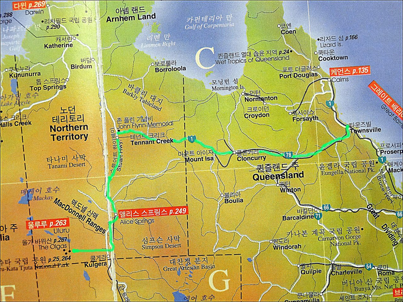 Uluru바위가 있는 울루루 카타추타 국립공원으로 가려면 위 지도에서처럼 퀸즈랜드주 북동부를 가로질러 노던테리토리(Northern Territory)주에 있는 테넌트크리크(Tennant Creek)를 경유해서 스튜어트 하이웨이를 타고 남쪽으로 내려가 엘리스 스프링스(Alice Springs)으로 가야한다. 거리를 알아보니 타운스빌에서 테넌트크리크까지가 1522km, 그리고 테넌트크리크에서 앨리스 스프링스까지가 450km를 더 달려야 한다. 약 2,000km 거리이다. 서울 부산을 약 2번 왕복해야되는 거리이다. 서울-부산 왕복하는게 보통이니까 어찌보면 별로 먼 거리는 아닌것 같다. 대산호초보러 여기까지 올라왔으니