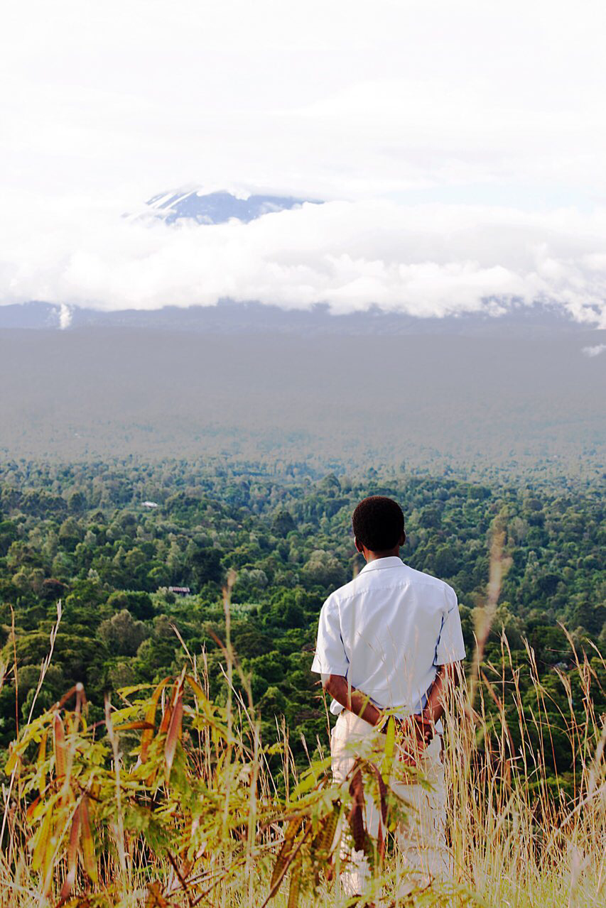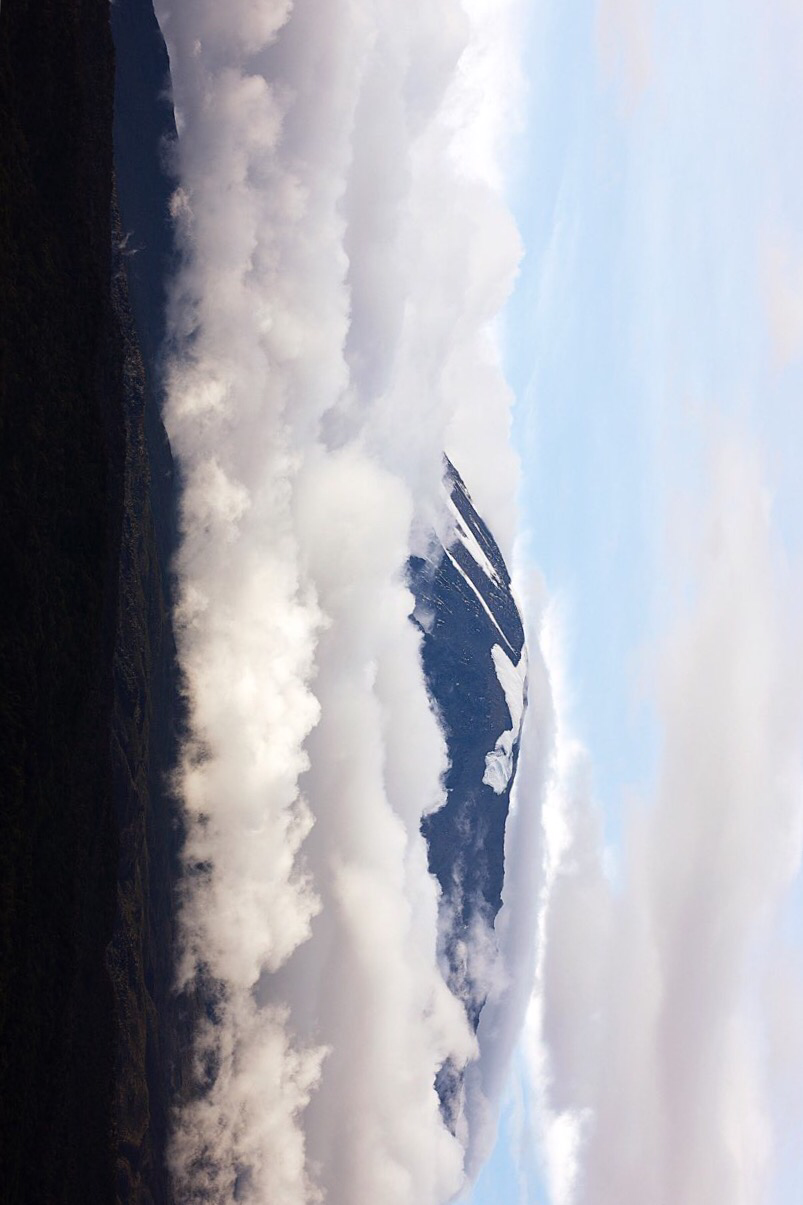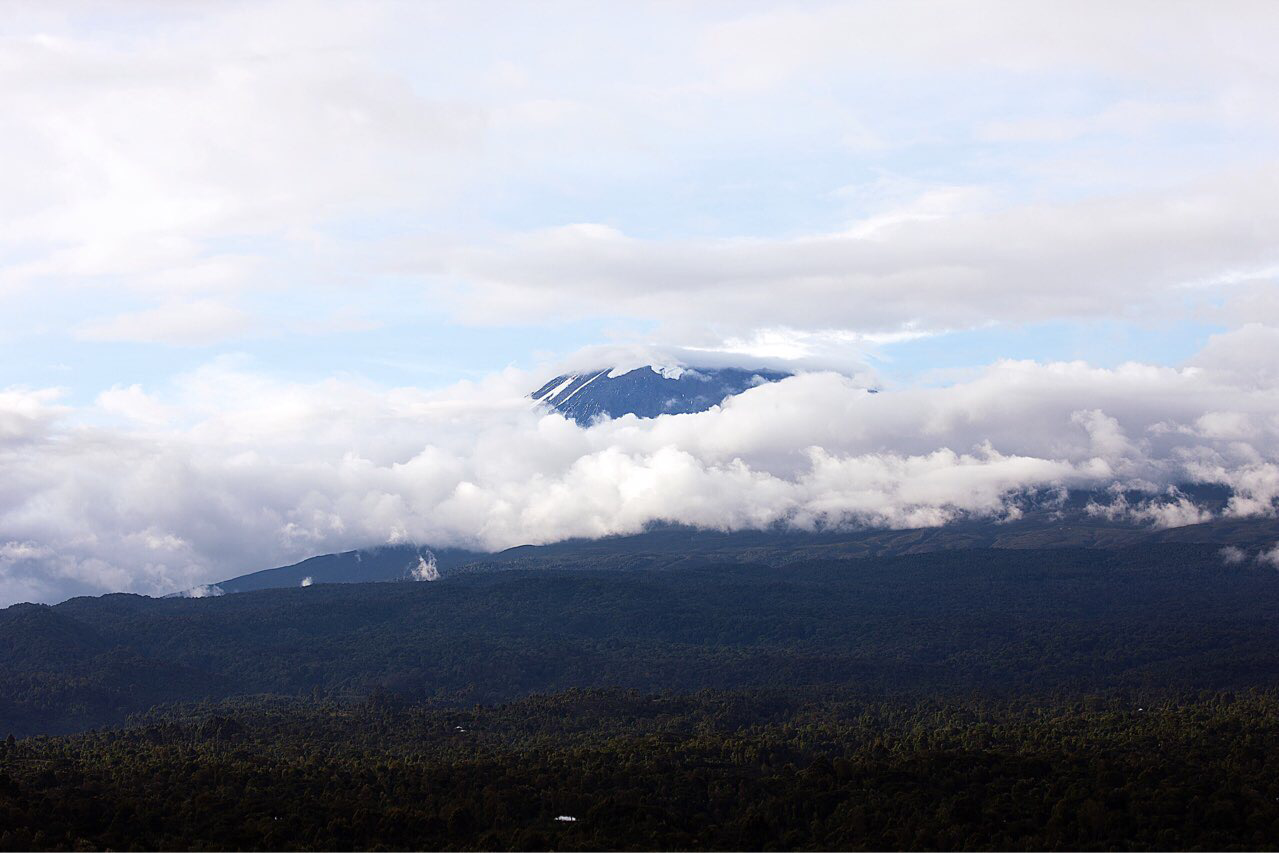 현지어로 밀리바가 산을 뜻한다. 한참을 올라가니 산 정상이 나오는데 그 곳에 서니 사방 360도가 훤하게 틔여있어 킬리가 바로 지척에 떡 버티고 앉아 있다. 책에서 본대로 킬리가 좌우로 평평하게 걸쳐 완만하게 능선이 산아래로 내려온다. 처음으로 오른 시간이 정오가 조금 지났는데 아래 사진처럼 완전히 구름 속에 묻혀 있었다.
