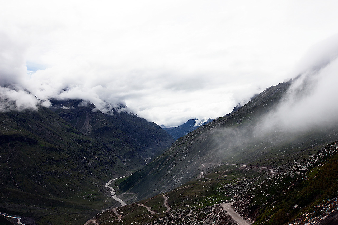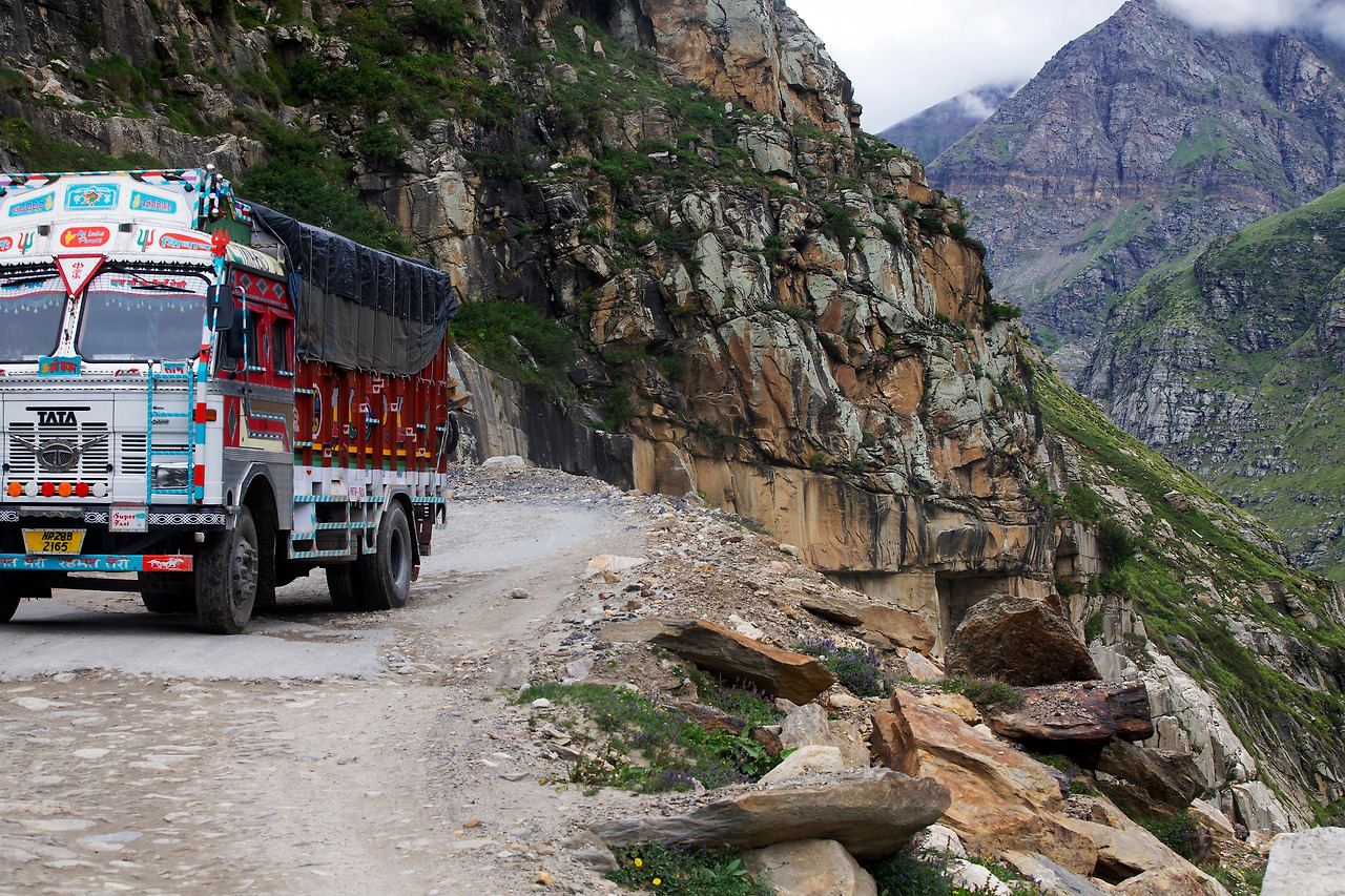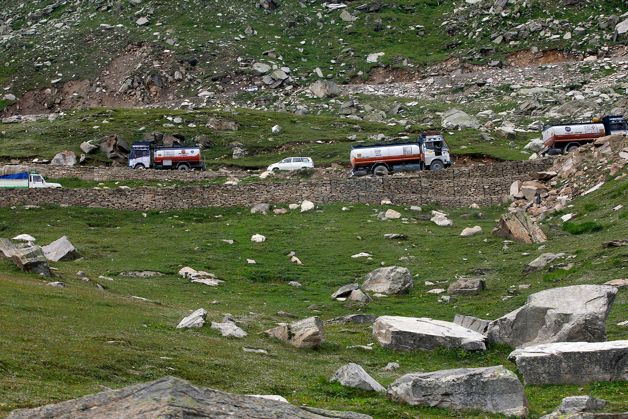 마날리에서 Leh로 가는 도로는 거의 비포장도로로 위의 사진처럼 위험한 커브지역에 가드레일이 대부분 없다. 있다면 도로 끄트머리에 돌들을 몇 개 그냥 덩그러니 놓아두었다. 운전자에게 그 돌을 넘으면 낭떠러지라는 표시로 운전자에게 경고를 하는 것이다.