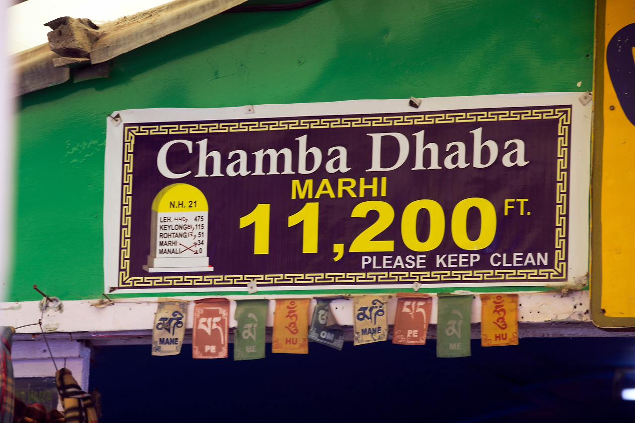 간판 왼편 이정표를 확대해보면 Marhi 34, Manali 0로 적어놓고 잘못되었다고 화살표로 정정해 주고 있다. 즉, 여기가 마날리로부터 34km 떨어져 있는 Marhi로 해발은 11,200피트로 3675m이니 높은 곳에 위치하고 있다.