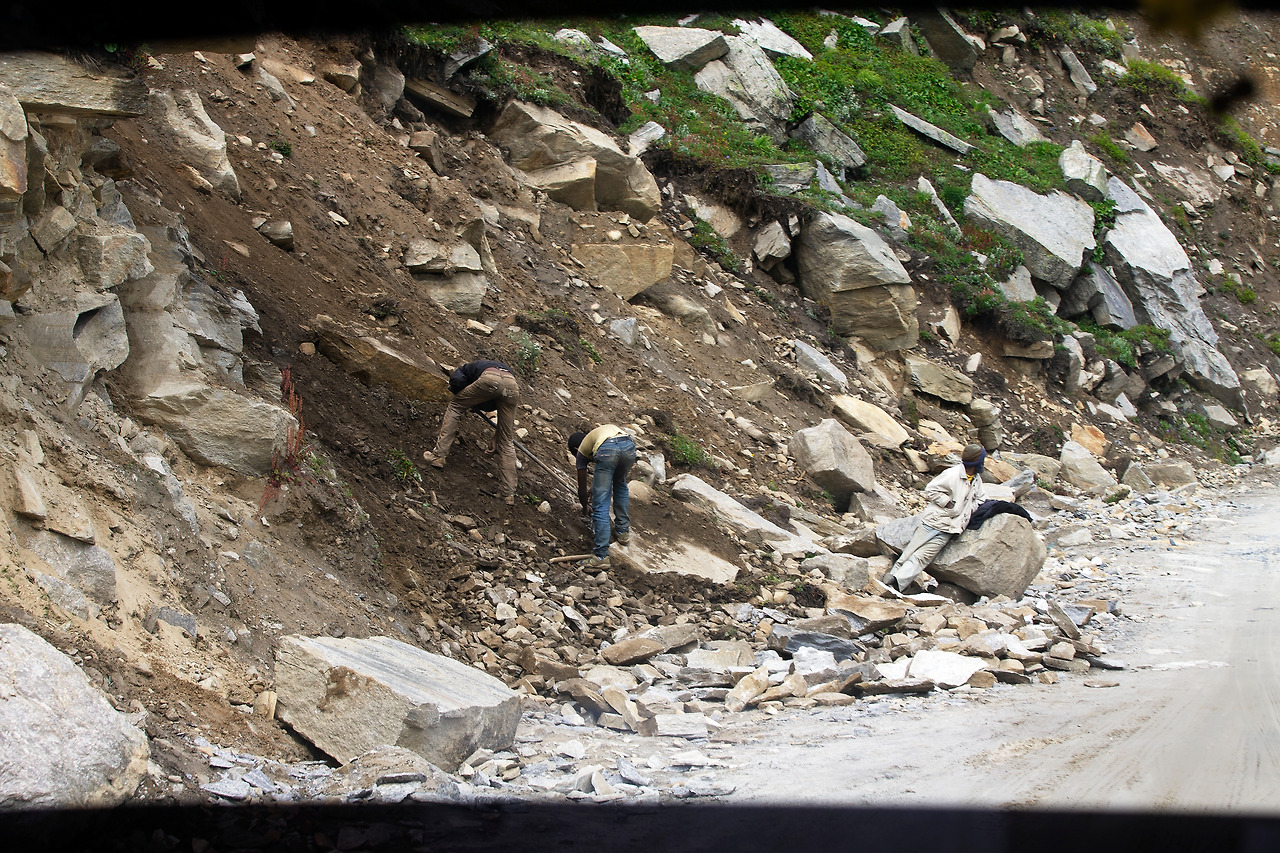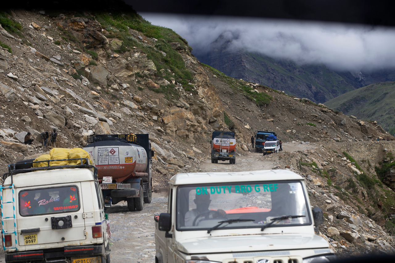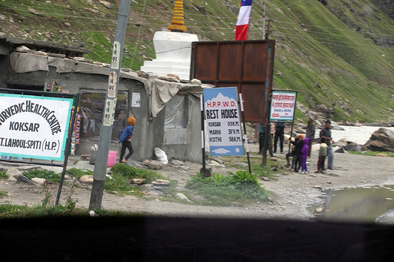 마을 Koksar는 마날리에서 약 73km 떨어져 있는 곳으로 경찰 check point 지점이다. 외국인은 반드시 사전에 허가받은 pemit과 여권을 보여주어야 한다. 그러는 시간 동안 제각기 볼일도 보고, 차도 한잔 하고, 차에서 내려 큰 기지개도 한 번씩 켜어본다. 저번에 마날리에서 Leh로 올라갈 적에도 쉬어가고, 이번에는 역으로 Leh에서 마날리로 내려갈 적에도 쉬어 갔다.